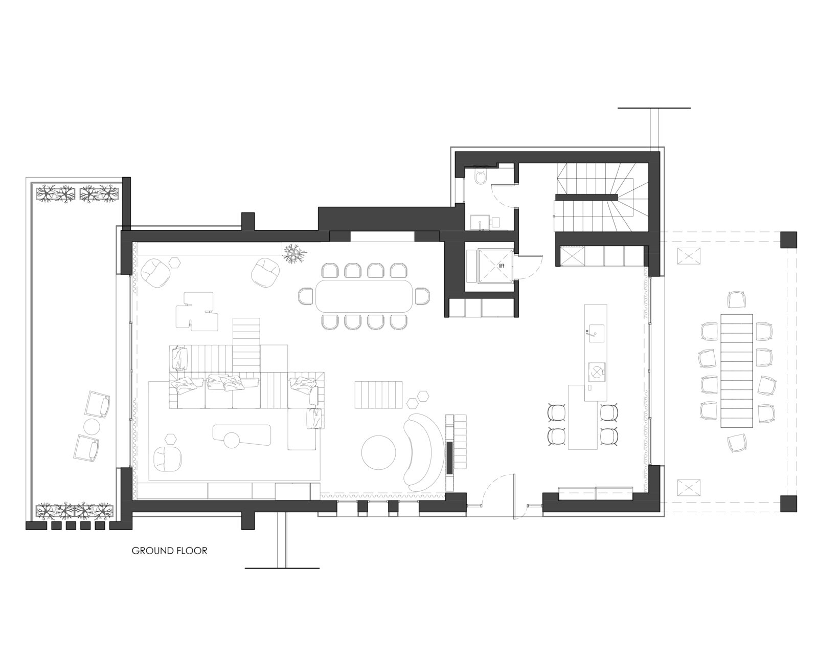 Ταυτόχρονα, χρειάστηκε να γίνει σχεδιασμός του περιβάλλοντος χώρου γύρω από την υφιστάμενη πισίνα. Μπαίνοντας από την κύρια είσοδο στο ισόγειο, βρίσκεται η ανοιχτή κουζίνα, το ευρύχωρο σαλόνι με θέα προς τον Θερμαϊκό κόλπο, η τραπεζαρία και η τουαλέτα των επισκεπτών.