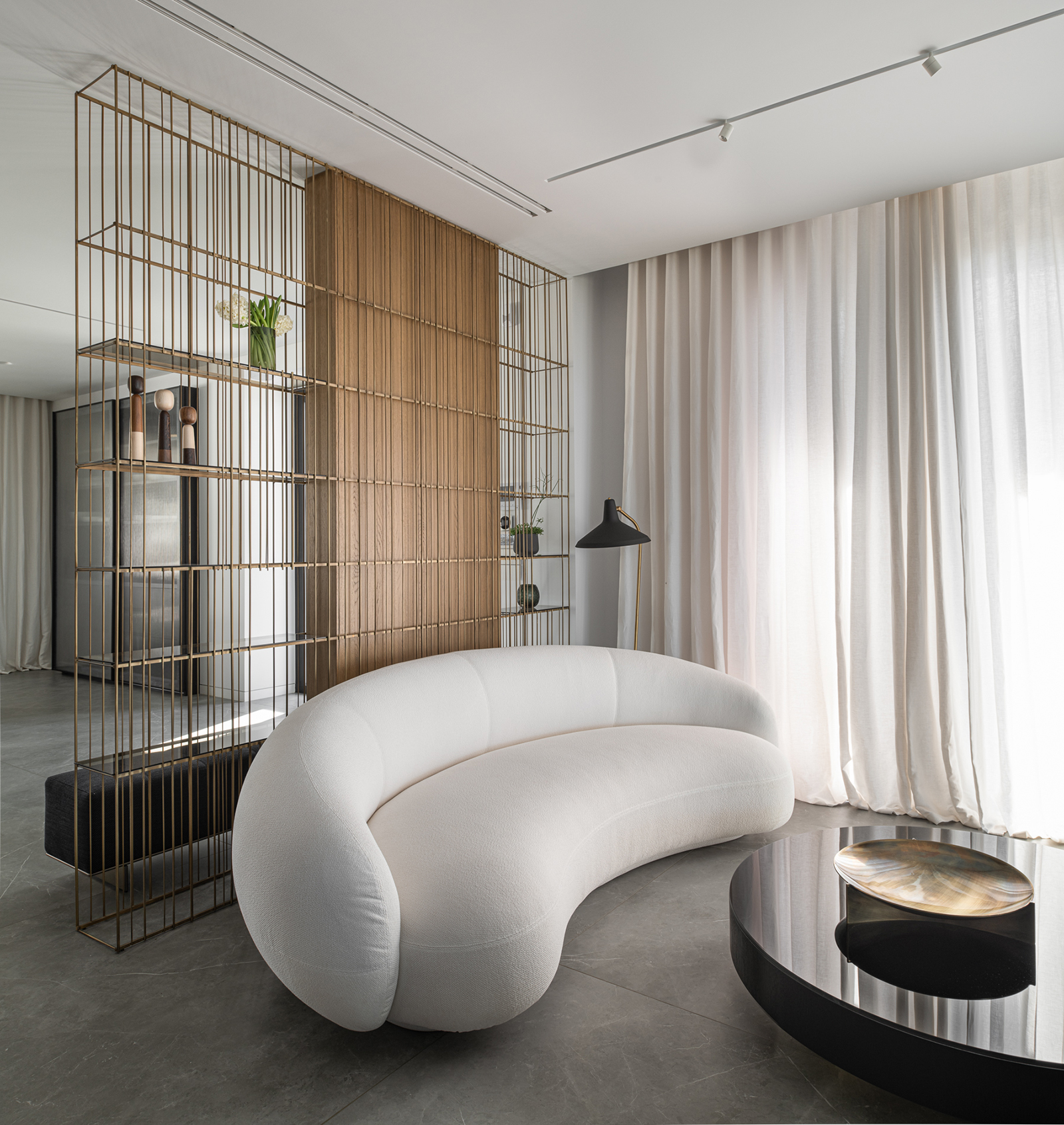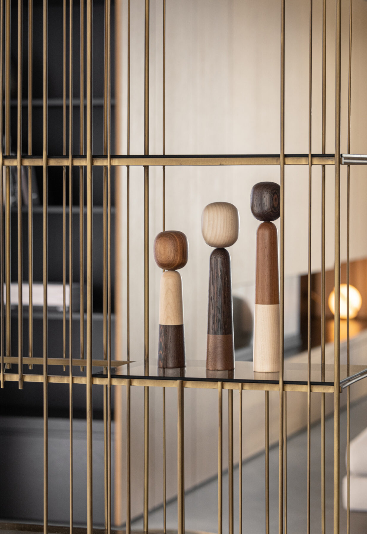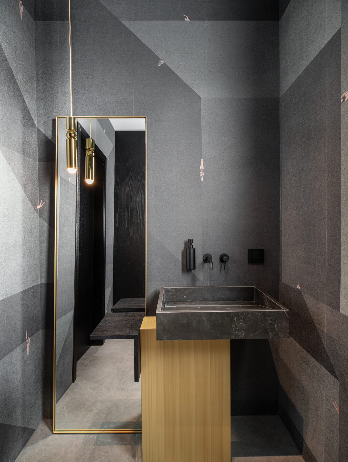 The primary materials that were chosen were that of oak wood with a dark warm varnish as well as gray and black marble in order to bring a gently luxurious touch and feel. On the other hand, the use of mirrors and brass metal, for selected furniture and wall coverings give contrast and shine to the general feel. Pure white serves as a soft and quiet background of the composition on both the walls and curtains. The various choices of furniture and upholsteries create a play of volumes, textures and colors in each individual space.