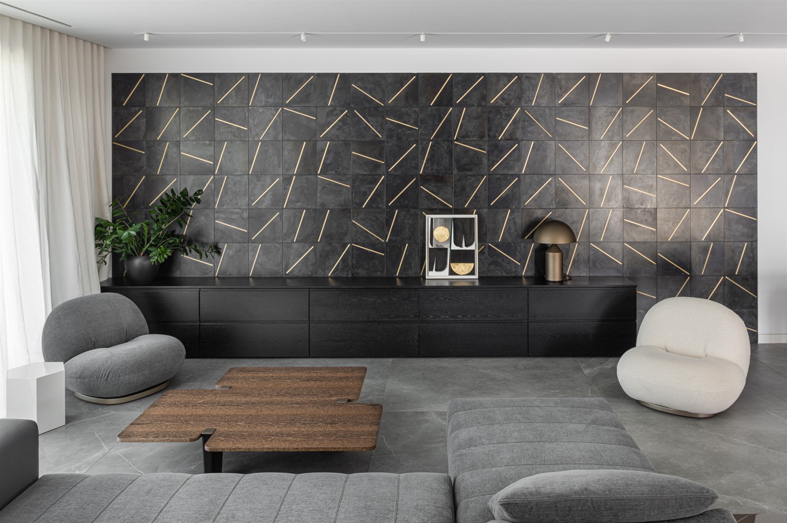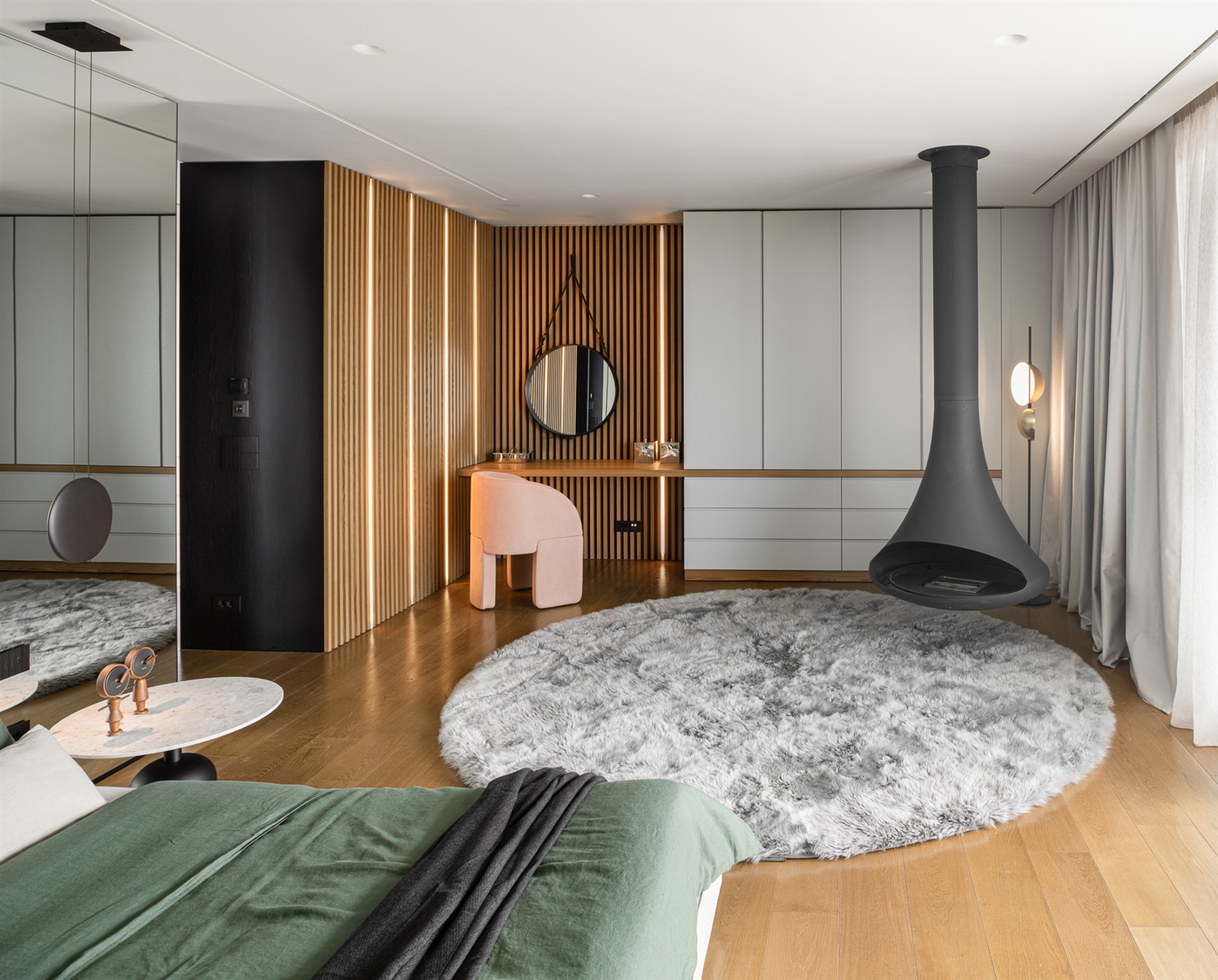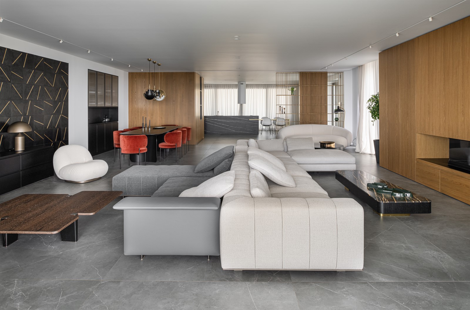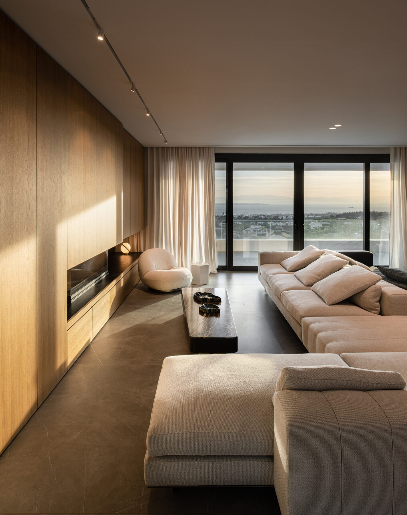The overall goal of the redesign was to create a residence that will offer the experience of luxurious living, which is achieved by clear functional choices, spacious interior layout, with a simultaneous cozy and minimal aesthetic both through the furnishing and the choice of all basic cladding materials such as, the oak wood, the gray marble, the gray-beige shades in the upholstery of the sofas.