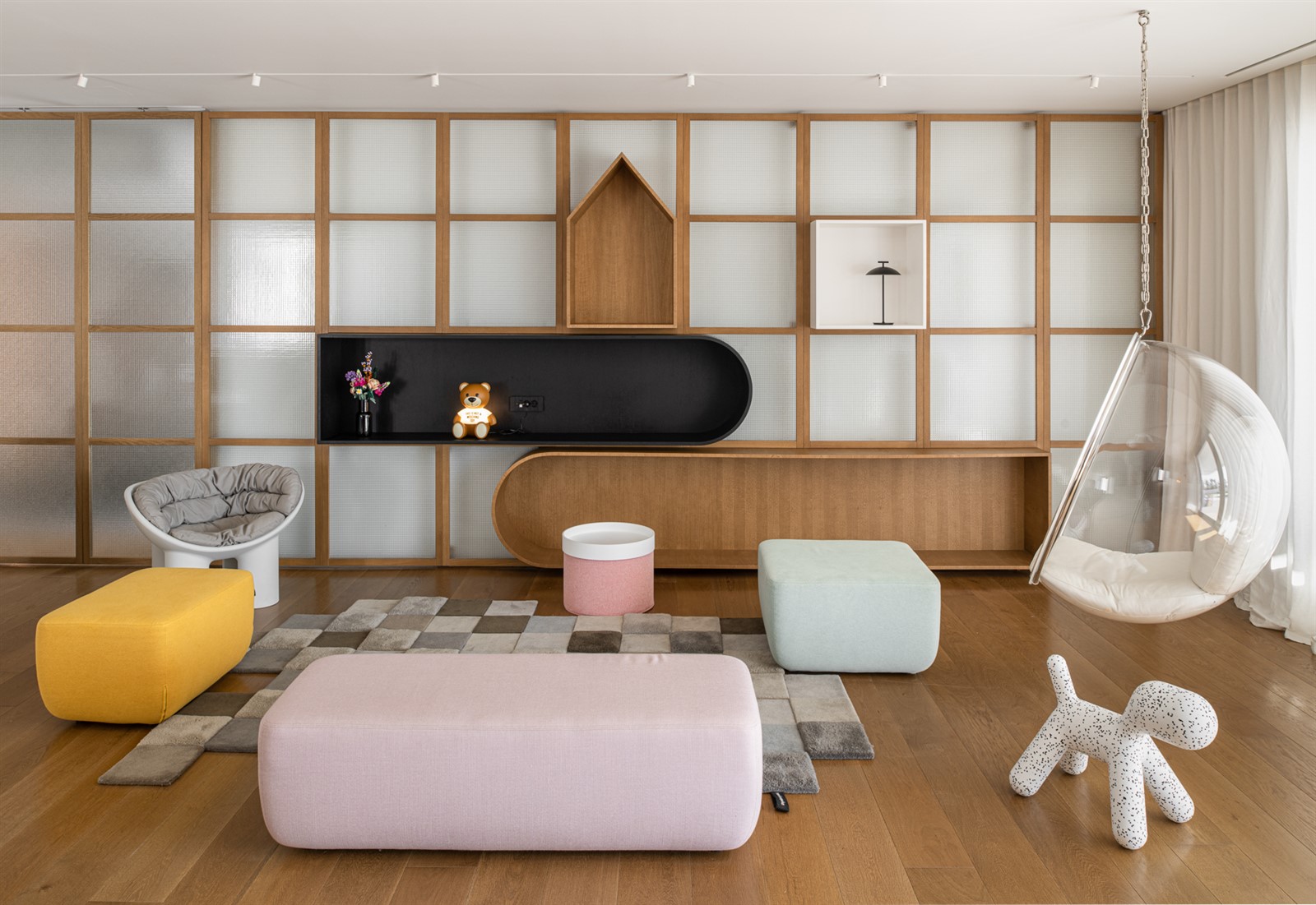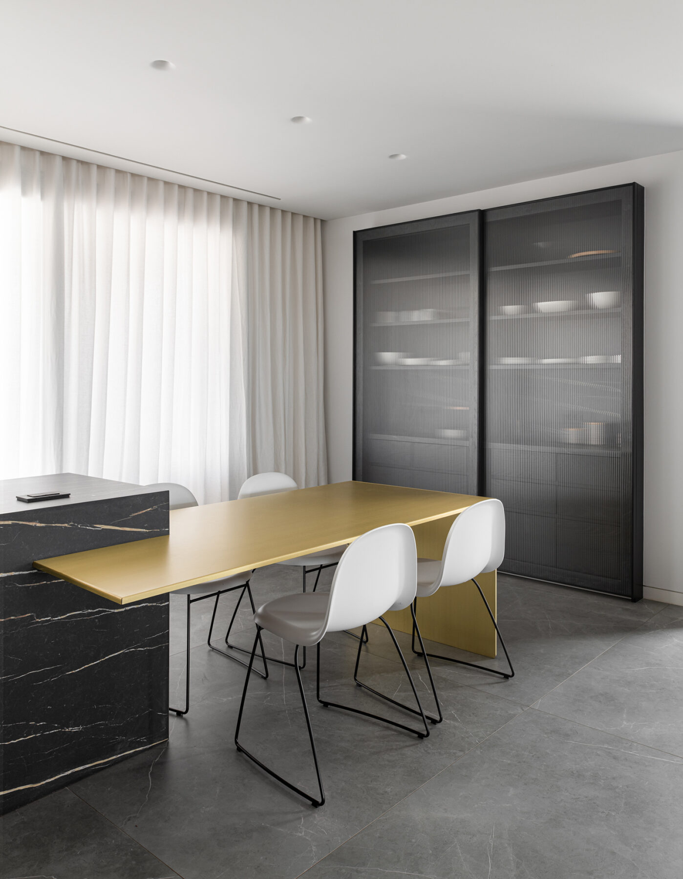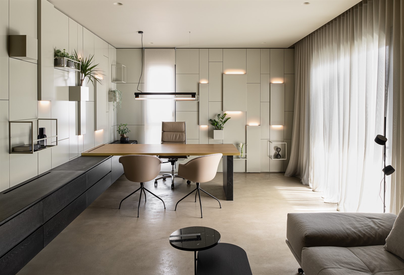 Entering from the main entrance on the ground floor, there are the open kitchen, the living room overlooking the panoramic view, the dining area and a water closet. Access to the first floor is provided through the staircase or the lift which leads to all private areas, i.e., the master bedroom with its 2 bathrooms and the dressing room, as well as the children’s room and the main office of the owner; which was originally a third bedroom. As both members of the couple work mainly from home, a secondary compact home office was incorporated in the confined space in front of the stairs of this floor.