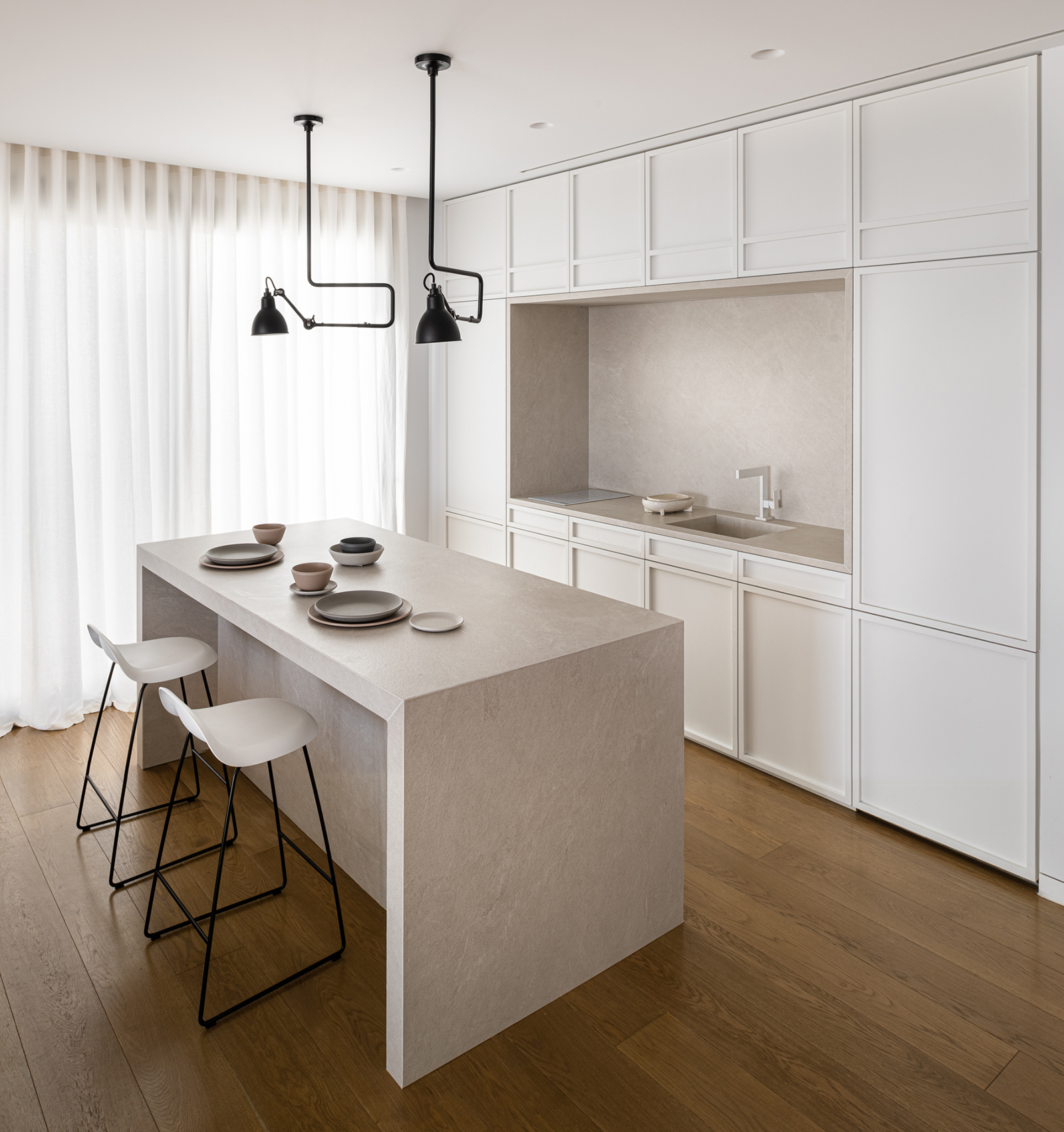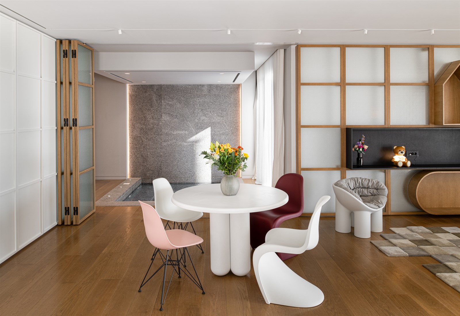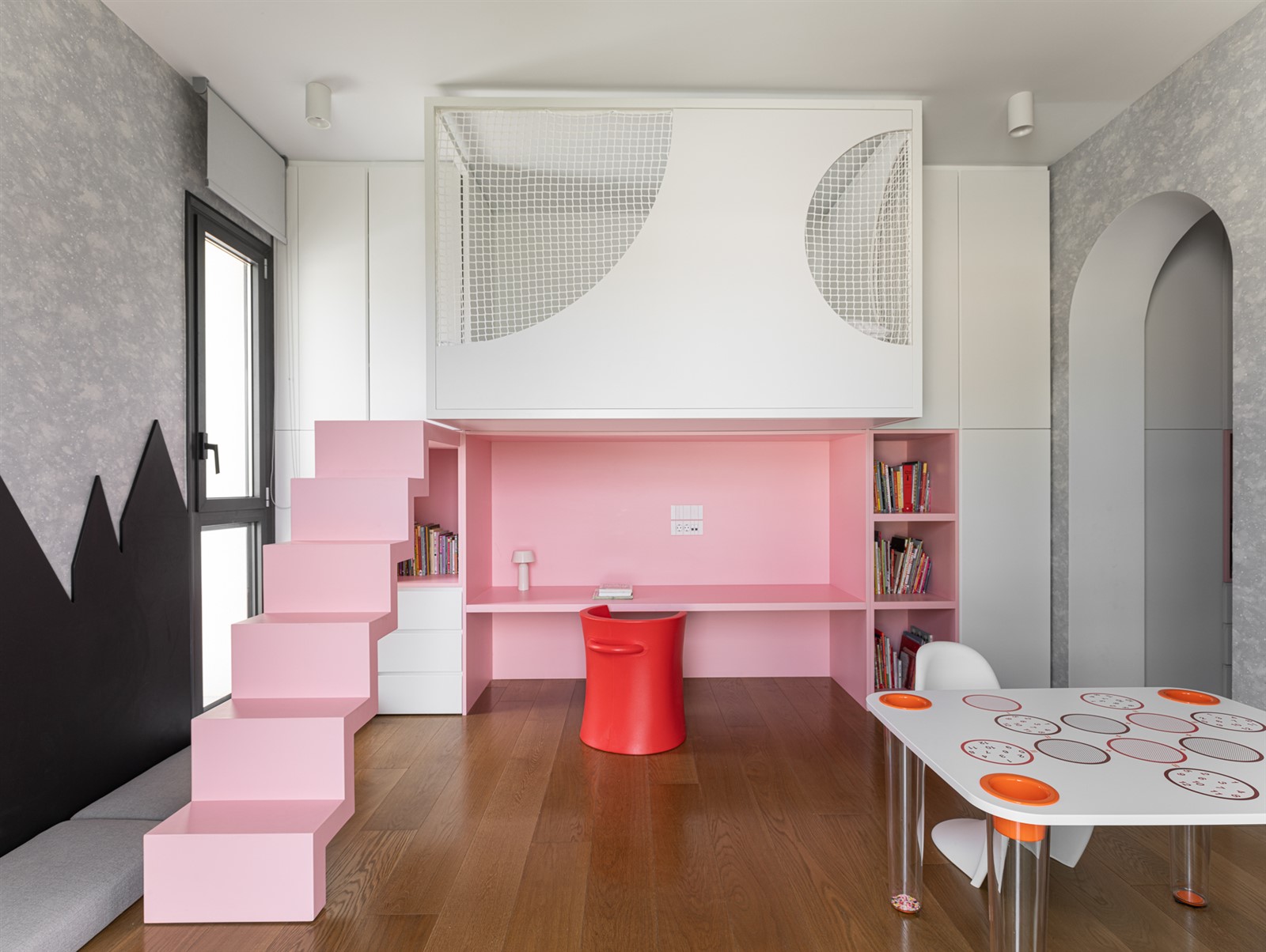 Entering from the main entrance on the ground floor, there are the open kitchen, the living room overlooking the panoramic view, the dining area and a water closet. Access to the first floor is provided through the staircase or the lift which leads to all private areas, i.e., the master bedroom with its 2 bathrooms and the dressing room, as well as the children’s room and the main office of the owner; which was originally a third bedroom. As both members of the couple work mainly from home, a secondary compact home office was incorporated in the confined space in front of the stairs of this floor.