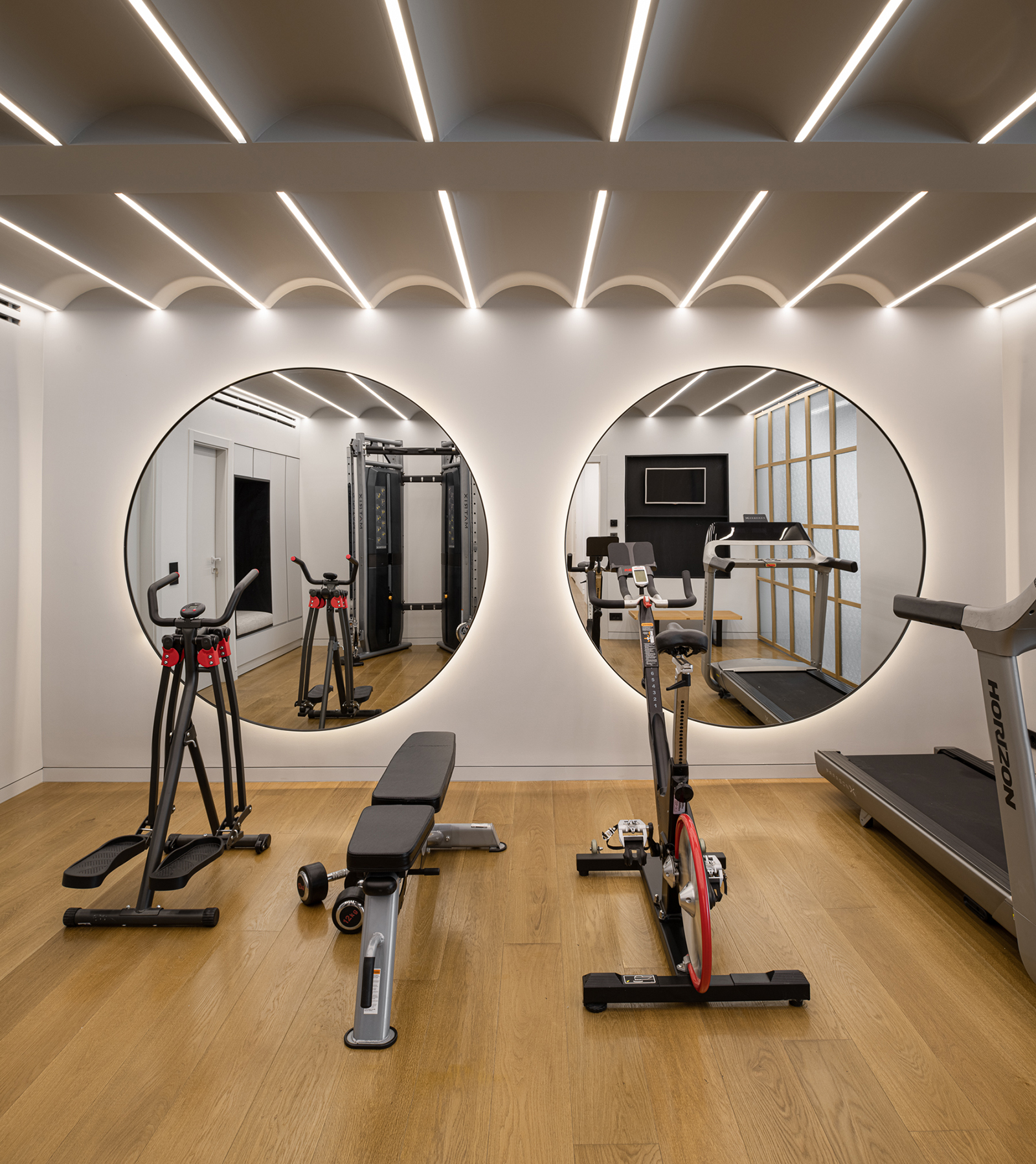 Moving on to the lower level, which is directly connected to the main outdoor area, there are 2 guest rooms with direct access from the garage. More importantly, all the common, athleisure spaces of the house have been concentrated on this level, such as the gym-spa, the screening room and the children’s playroom overlooking the pool and back yard.