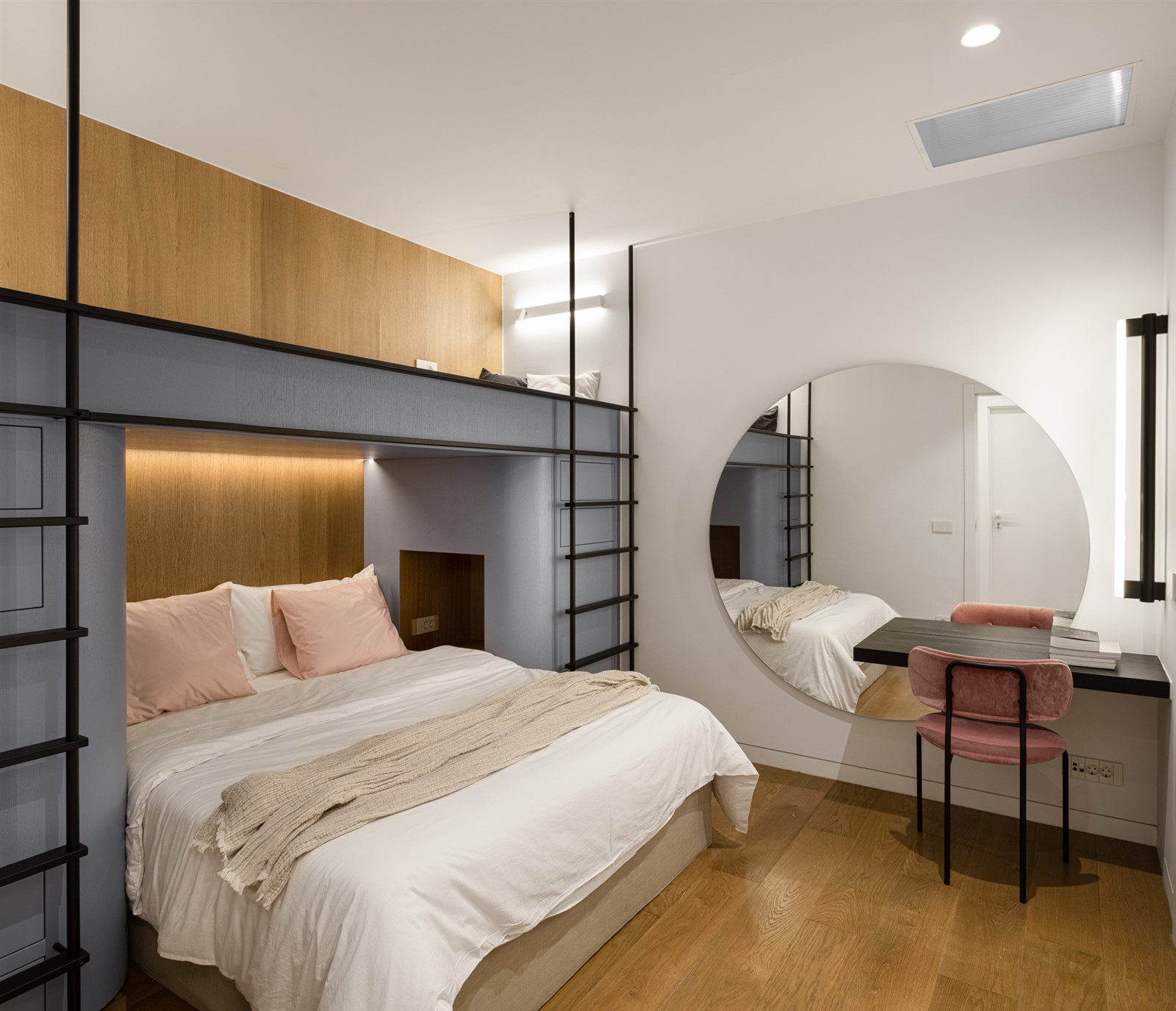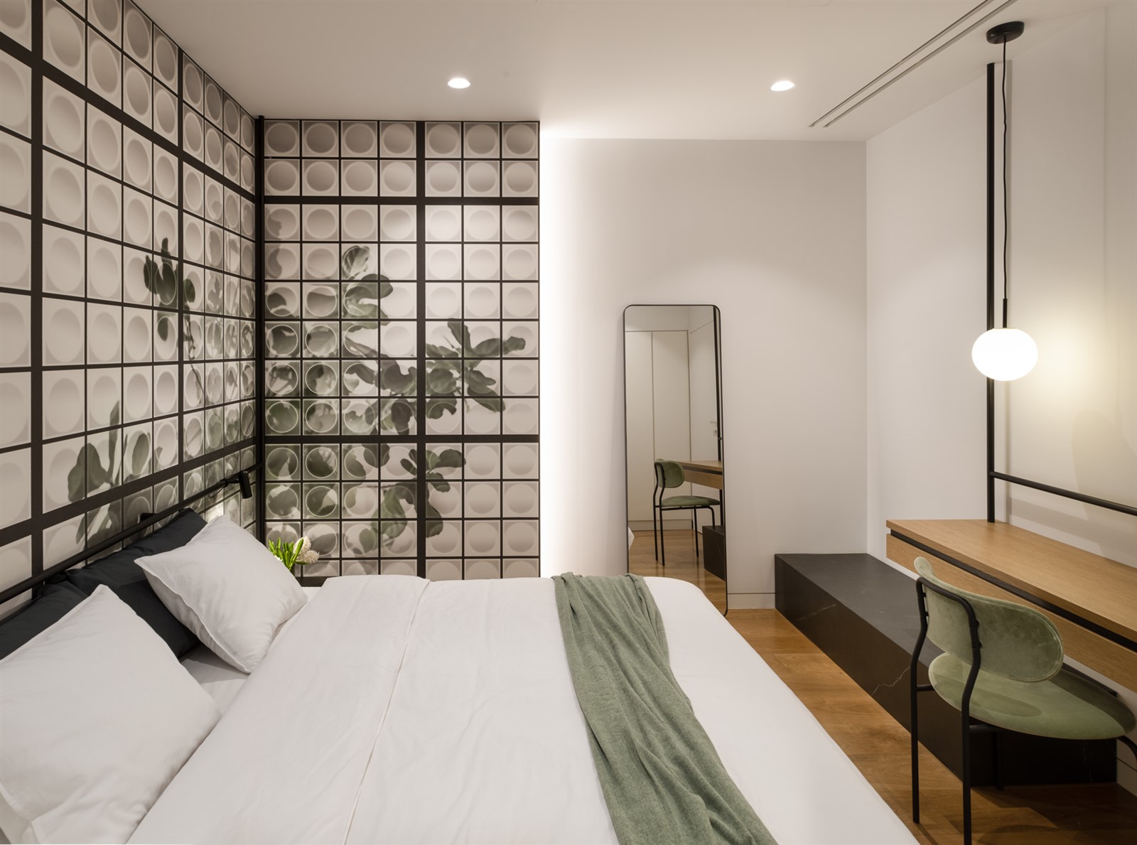 On the other hand, the use of mirror, brass as well as black wood or marble in selected furniture and wall cladding offer a contrast that brightens up specific spaces where needed. Finally, pure white was used as a quiet background for the interior shell, both on walls and curtains, while the limited selection of colorful furniture and wallpaper creates a dialogue of volumes, textures and colors which gives identity and highlights the use of each room or space.