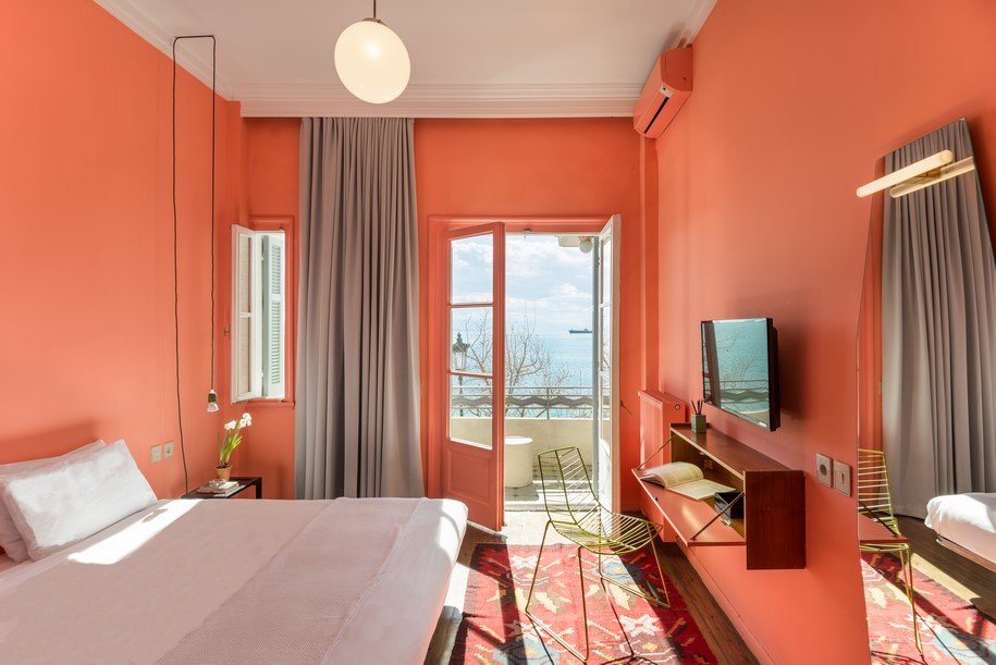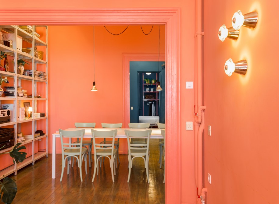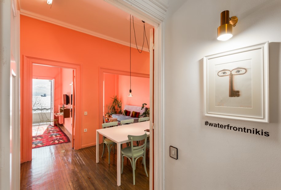 Τοίχοι βαμμένοι σε ροζ του φλαμίνγκο, μπλε του πελάγους και παστέλ πράσινο ορίζουν τις διαφορετικές περιοχές σε αυτό το διαμέρισμα με θέα το Θερμαϊκό από τον αρχιτέκτονα Σταμάτιο Γιαννίκη.