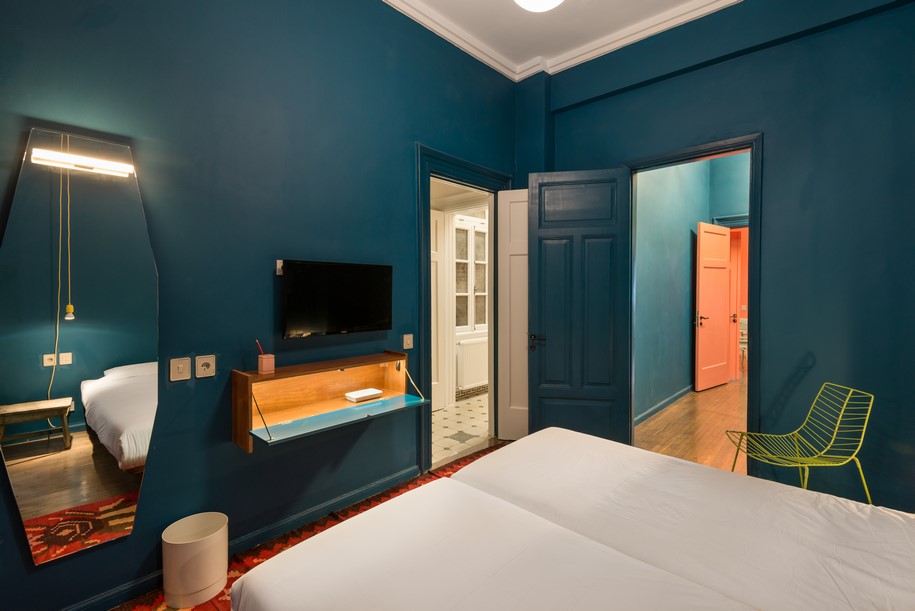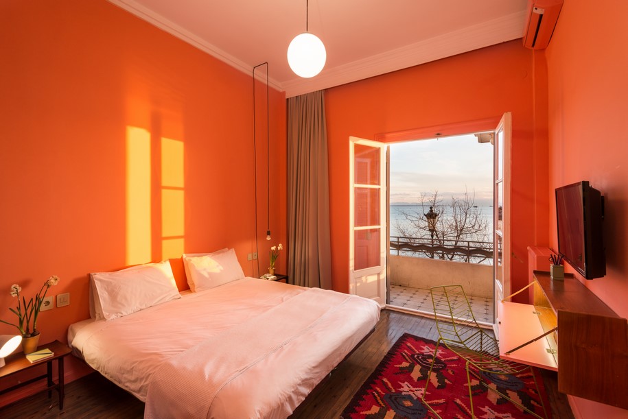 “Η χρήση των έντονων χρωμάτων στο σχεδιασμό του Waterfront Nikis Apartment έγινε στοχεύοντας να ενισχύσει την εμπειρία της θέας της θάλασσας, όχι να την ανταγωνιστεί,” εξηγεί ο αρχιτέκτονας Σταμάτιος Γιαννίκης.