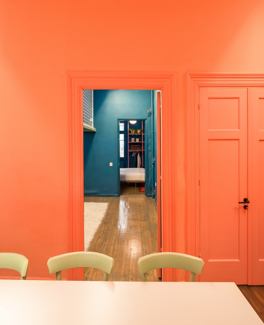 Giannikis chose three bold colours to organise the space. Flamingo pink is used in spaces that overlook the sea, azure blue is used in spaces that have views out across the neighbourhood and the pastel green shade is used in the apartment’s wet spaces such as the kitchen, shower room and the WC.