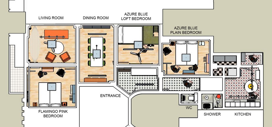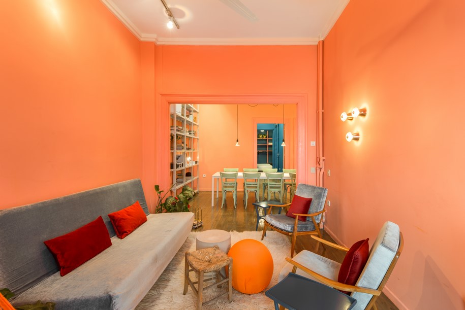 “Το παστέλ πράσινο χρησιμοποιείται για να φέρει μια αίσθηση ηρεμίας σε αυτούς τους λειτουργικούς χώρους, το μπλε του πελάγους χρησιμοποιείται για να μεταφέρει μια αίσθηση θαλασσινής αύρας στους πίσω χώρους του διαμερίσματος και το ροζ του φλαμίνγκο χρησιμοποιείται για να καδράρει το πραγματικό μπλε του πελάγους της θάλασσας του Θερμαϊκού.”