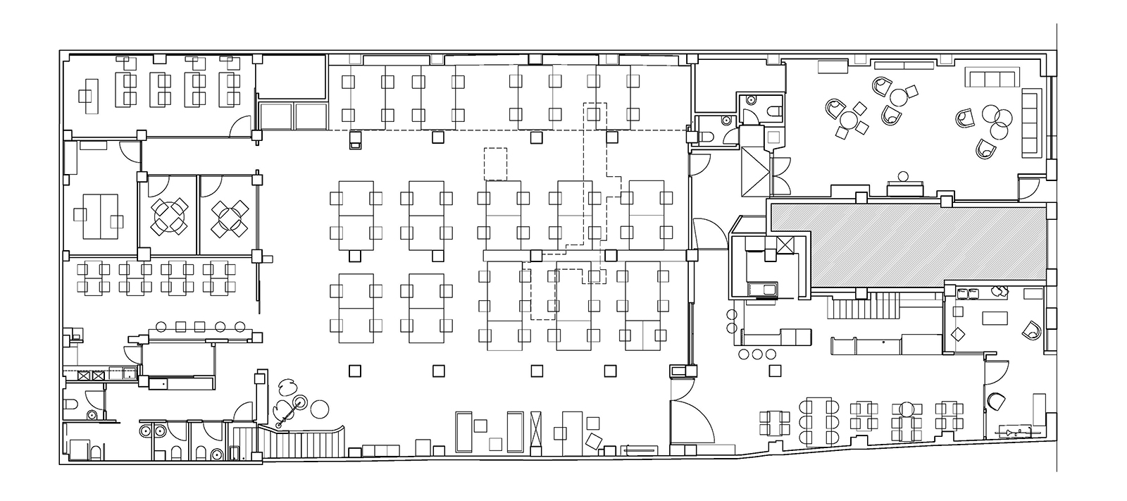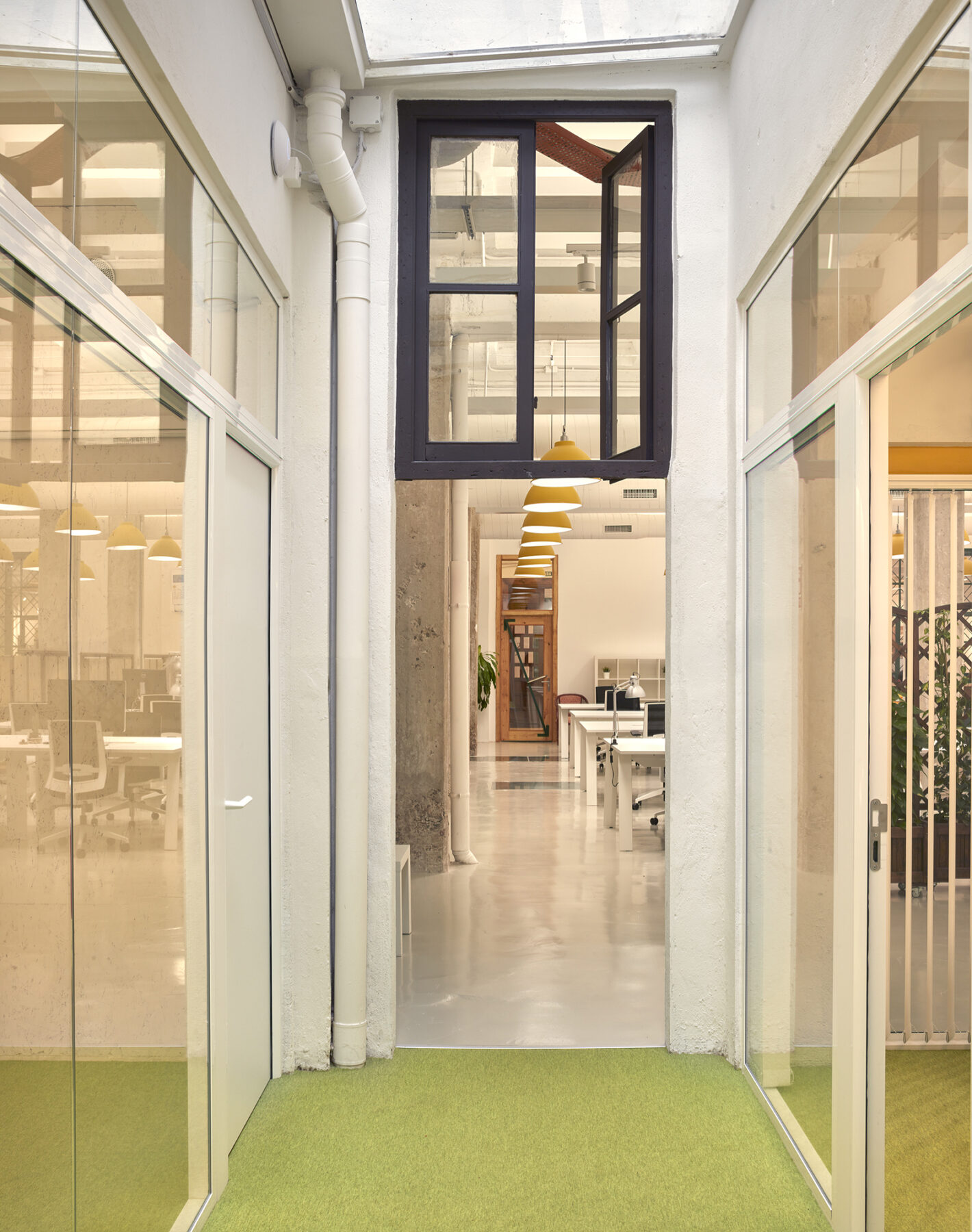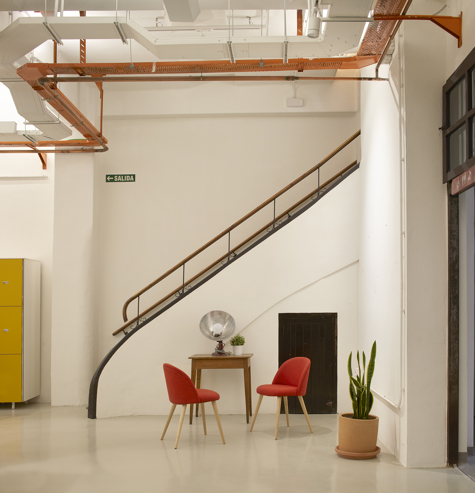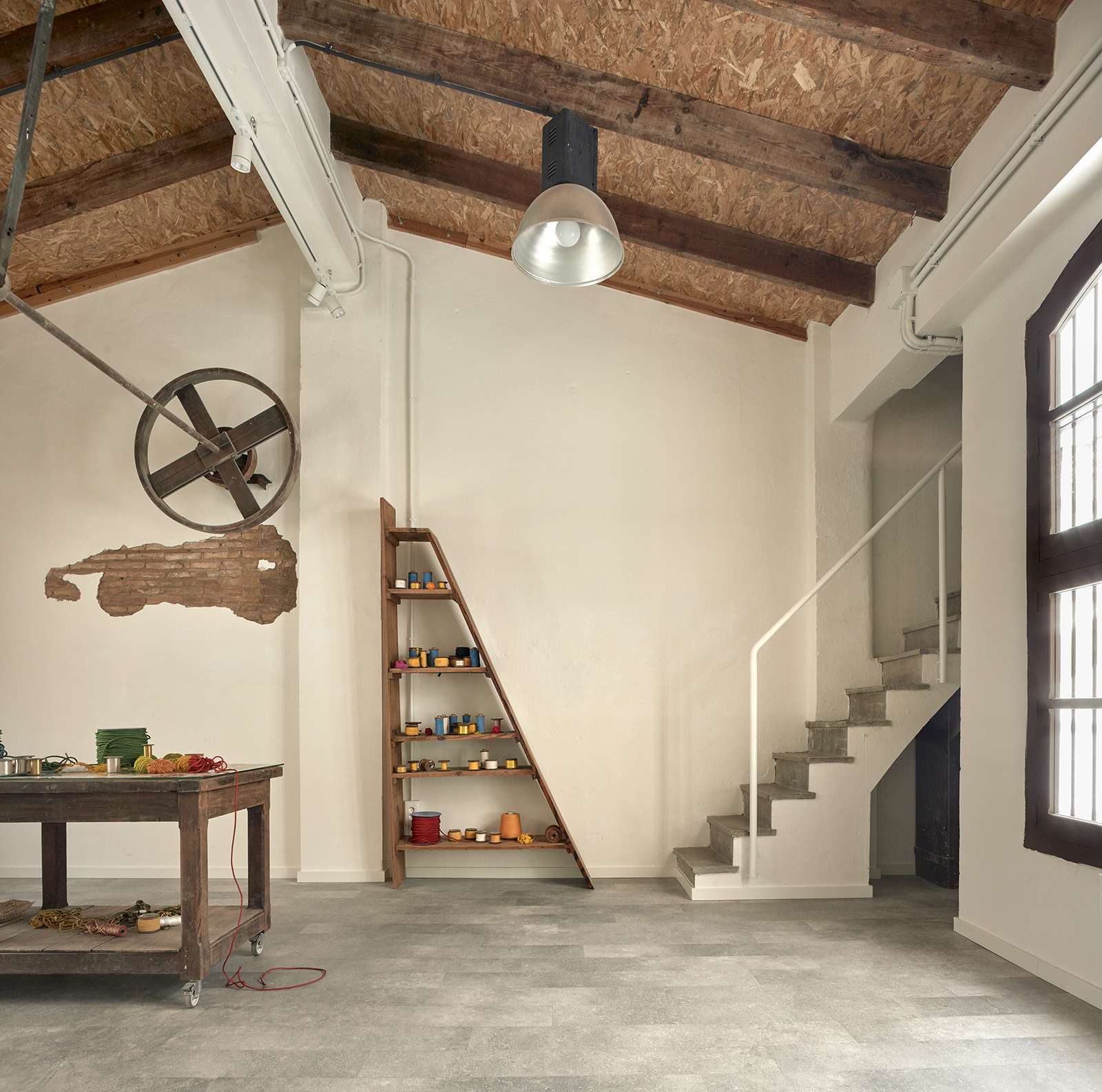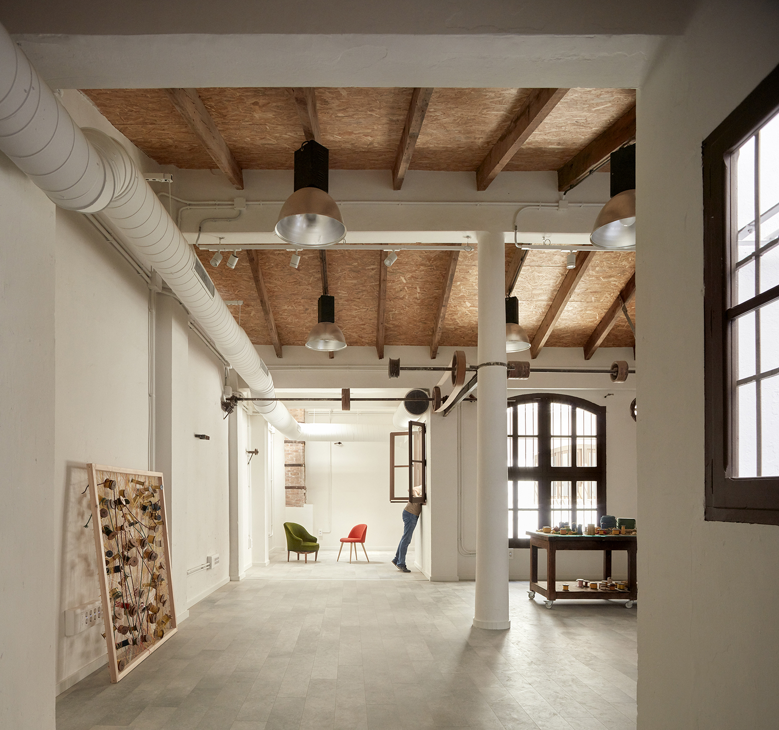The venue, located under a residential building, had been previously transformed into an academy of arts and café, recovering and taking advantage of part of the pre-existing elements. Following a similar line, the works done to fit the coworking use, aim to maximize the feeling of space, creating a cozy main work space where the pre-existing elements are restored, relocated and coexist with the new ones in a harmonious way.
