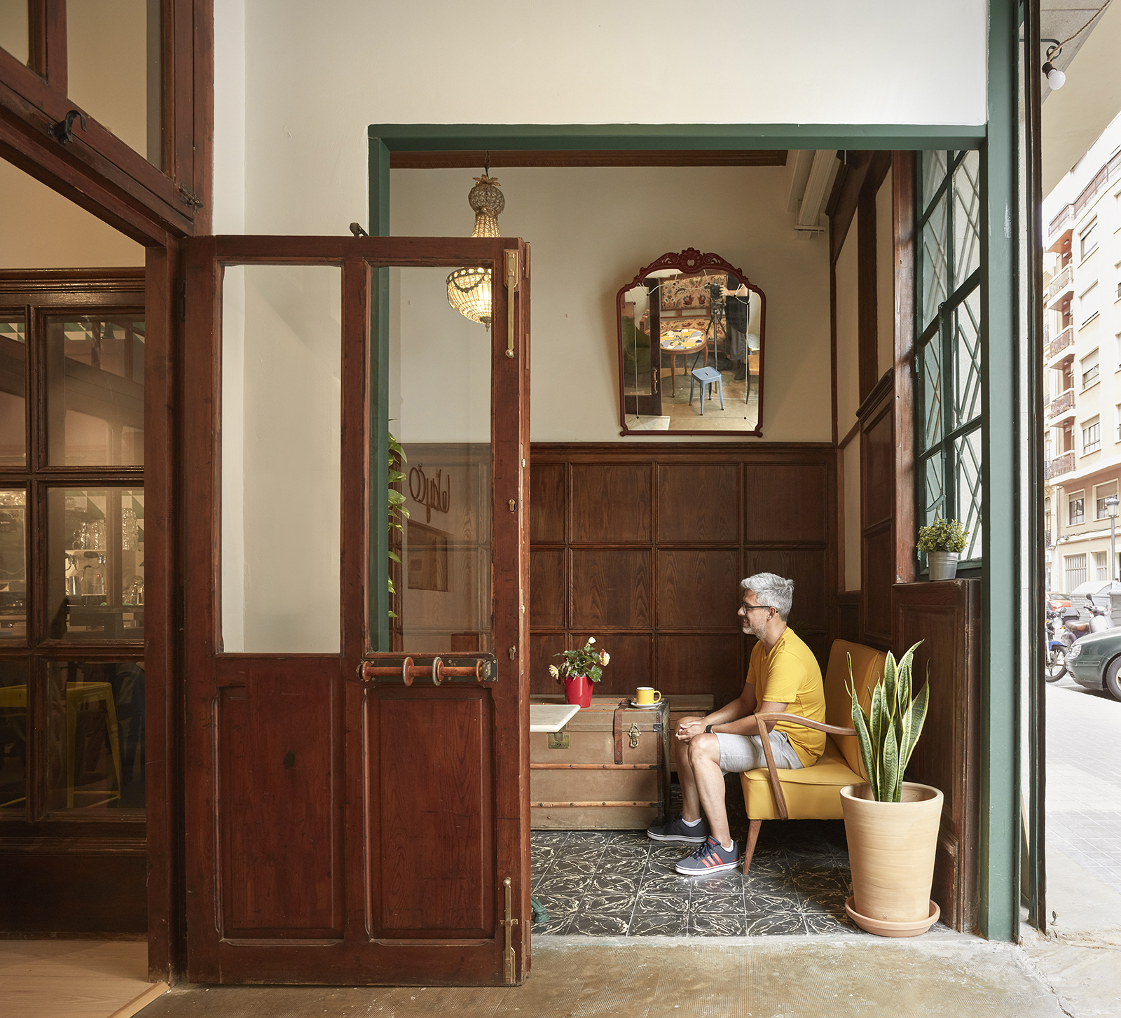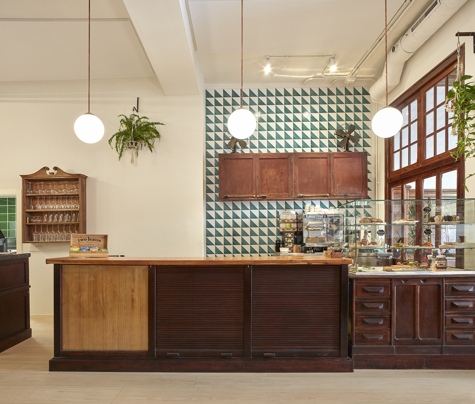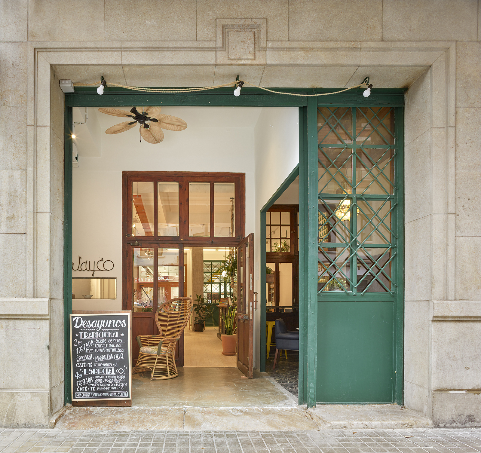 The interaction is accentuated by accessing the workspace through it. The bar counter of the cafeteria was made from the pre-existing counter of the shop, giving it a special character. Other elements add to the atmosphere: the original large wood and forge doors that delimit it, the scenographic lighting using glass balls and the reused wooden and marble chairs and tables.