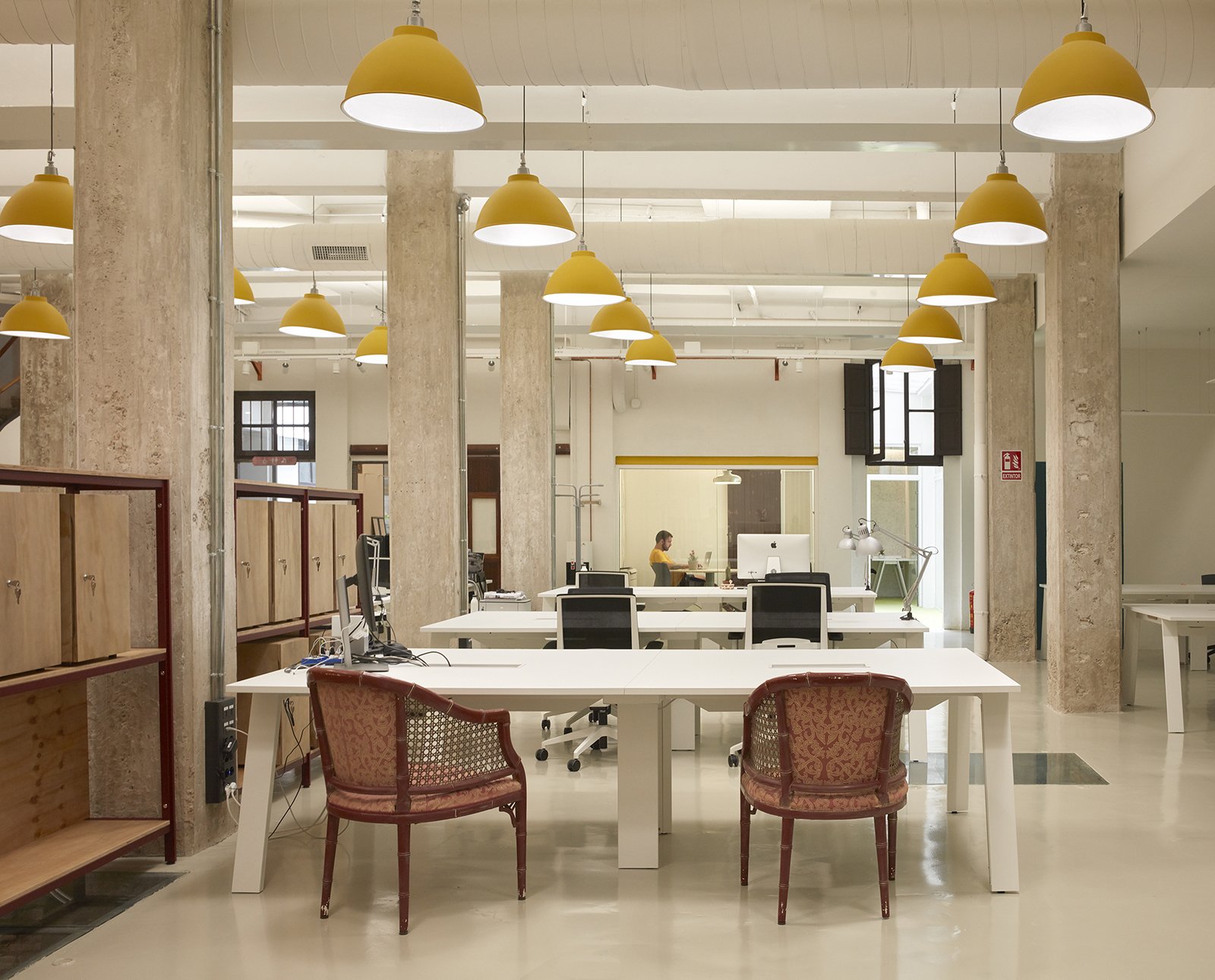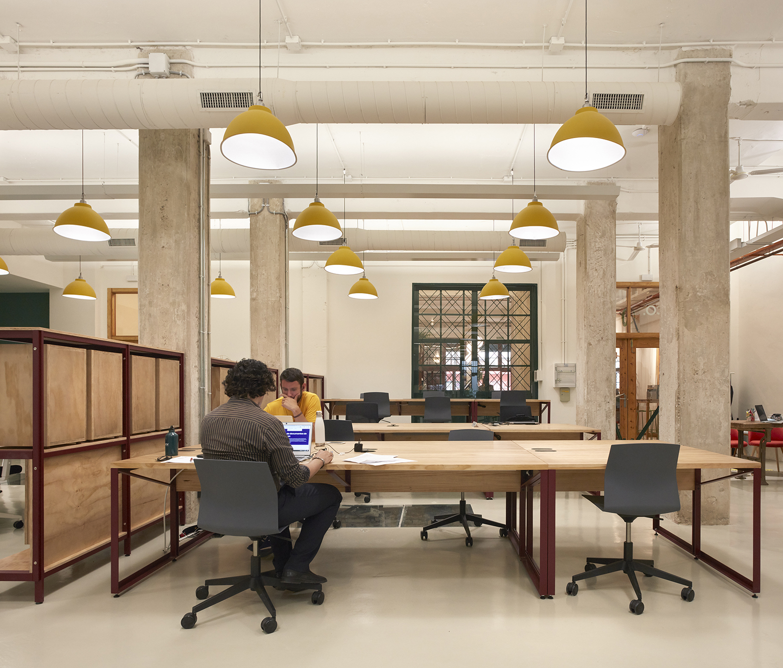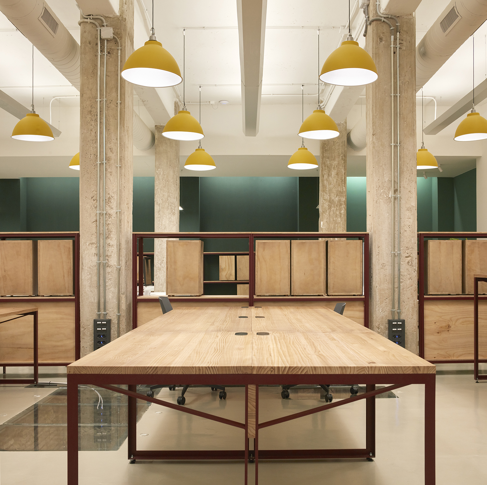 The main workspace is characterized by 28 suspended yellow lamps, exposed concrete columns and a series of steel and wood shelves, which separate different working areas while providing the necessary storage for users.