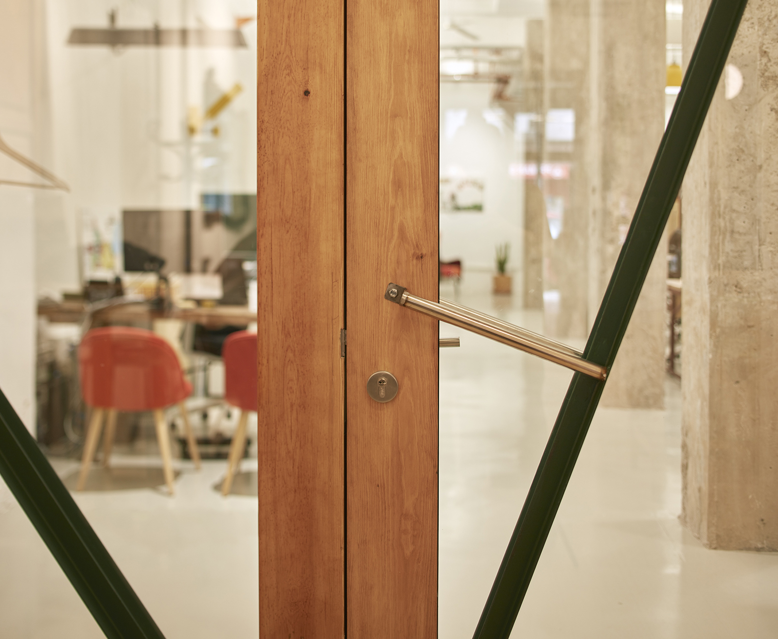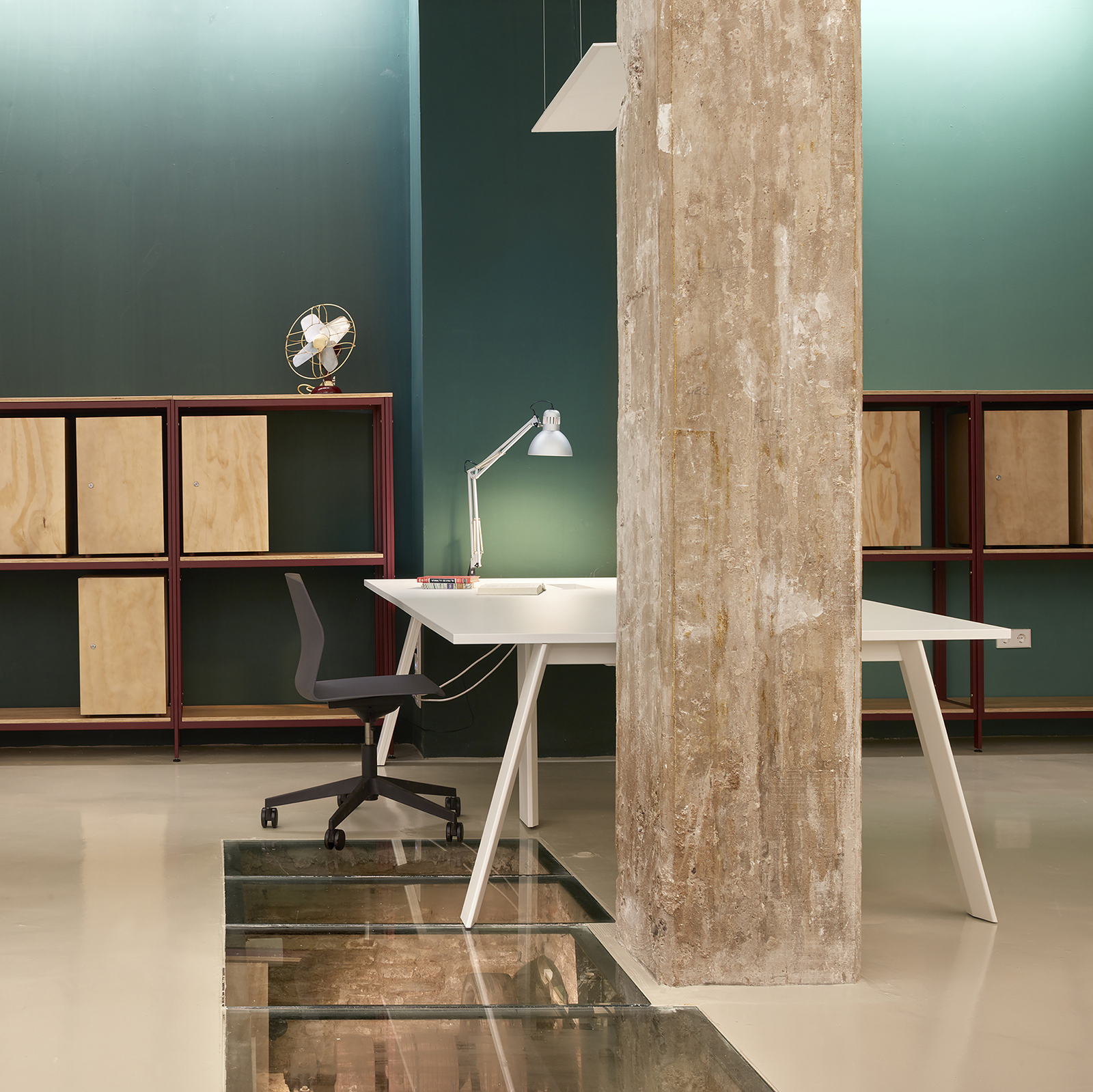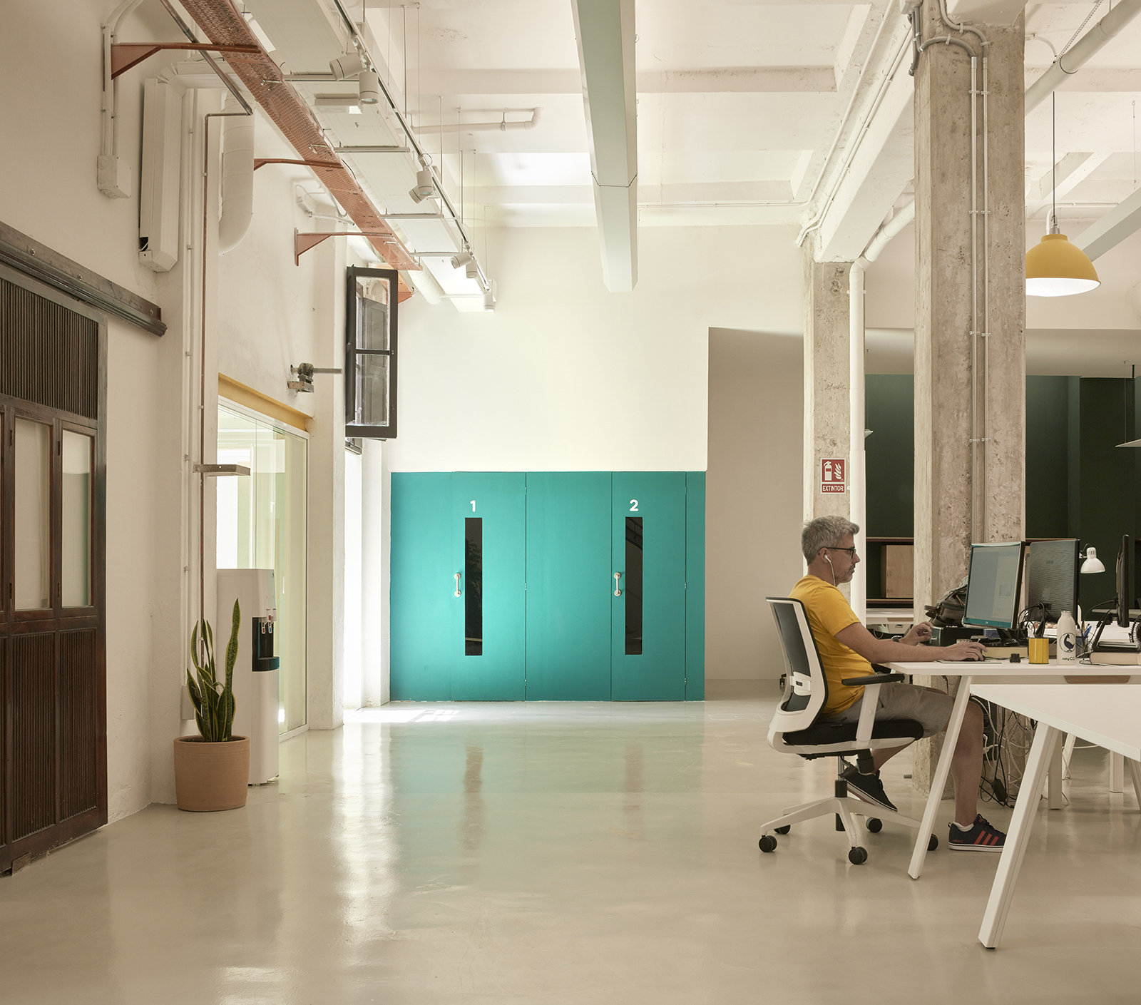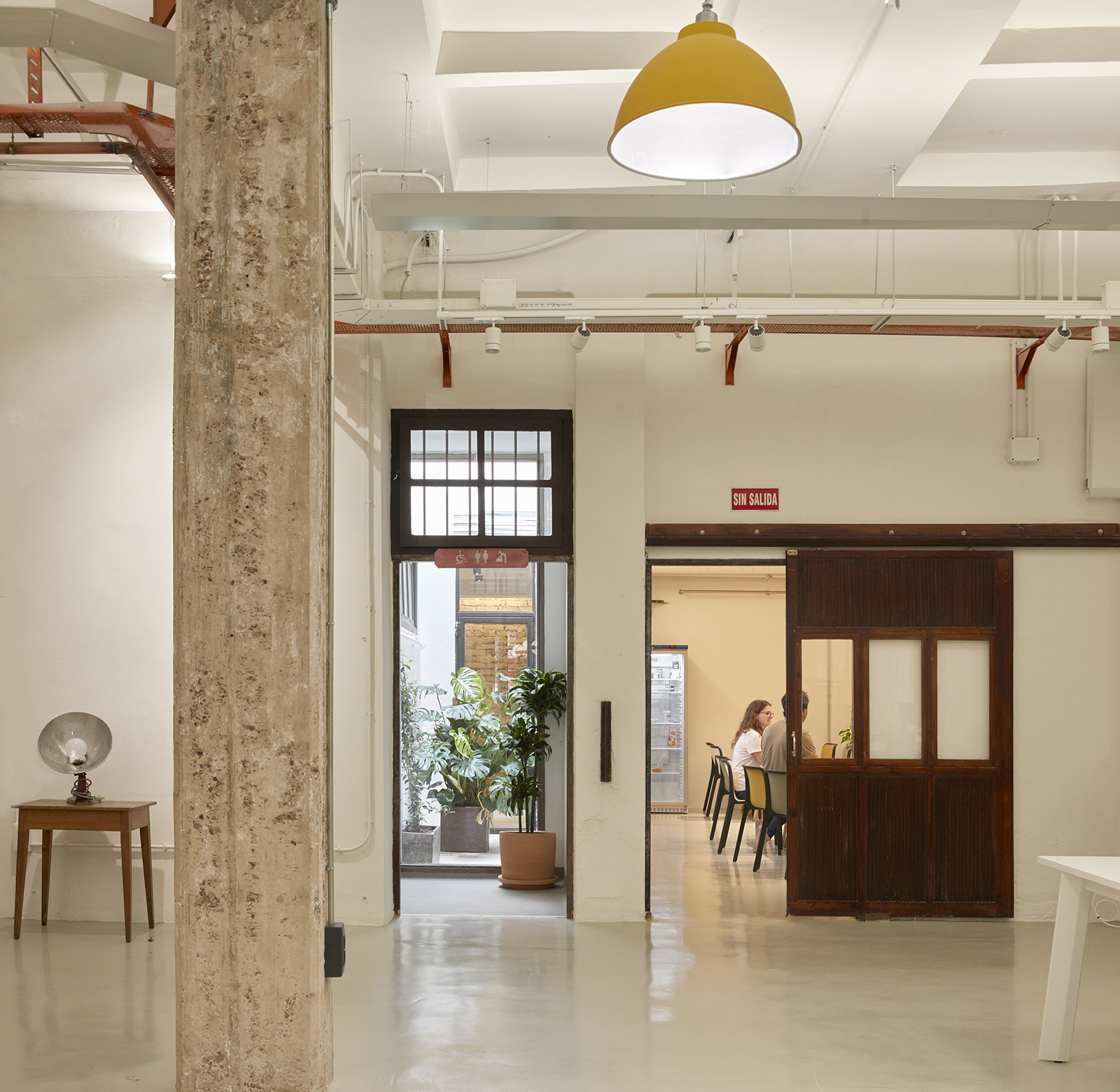 The main workspace is characterized by 28 suspended yellow lamps, exposed concrete columns and a series of steel and wood shelves, which separate different working areas while providing the necessary storage for users.