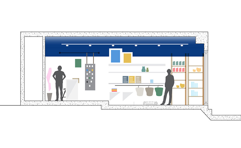 The clear blue sky is one of the most distinguishing characteristics to which someone refers to when he starts to describe Greece. But there is something that has attracted less attention, and is that the Greek blue sky is so impressive because of the natural horizon with which it unites. Like this, the paint of the arched ceiling in deep blue color gets to the walls in analogy 1:4, so as it creates the sense of the sky which imposes through its expansion, something that is printed to the horizon that appears to the sides. The color to the rest of the surfaces is white in order to function as a blank canvas in front of which every product separately, but also all the products together, are being featured.