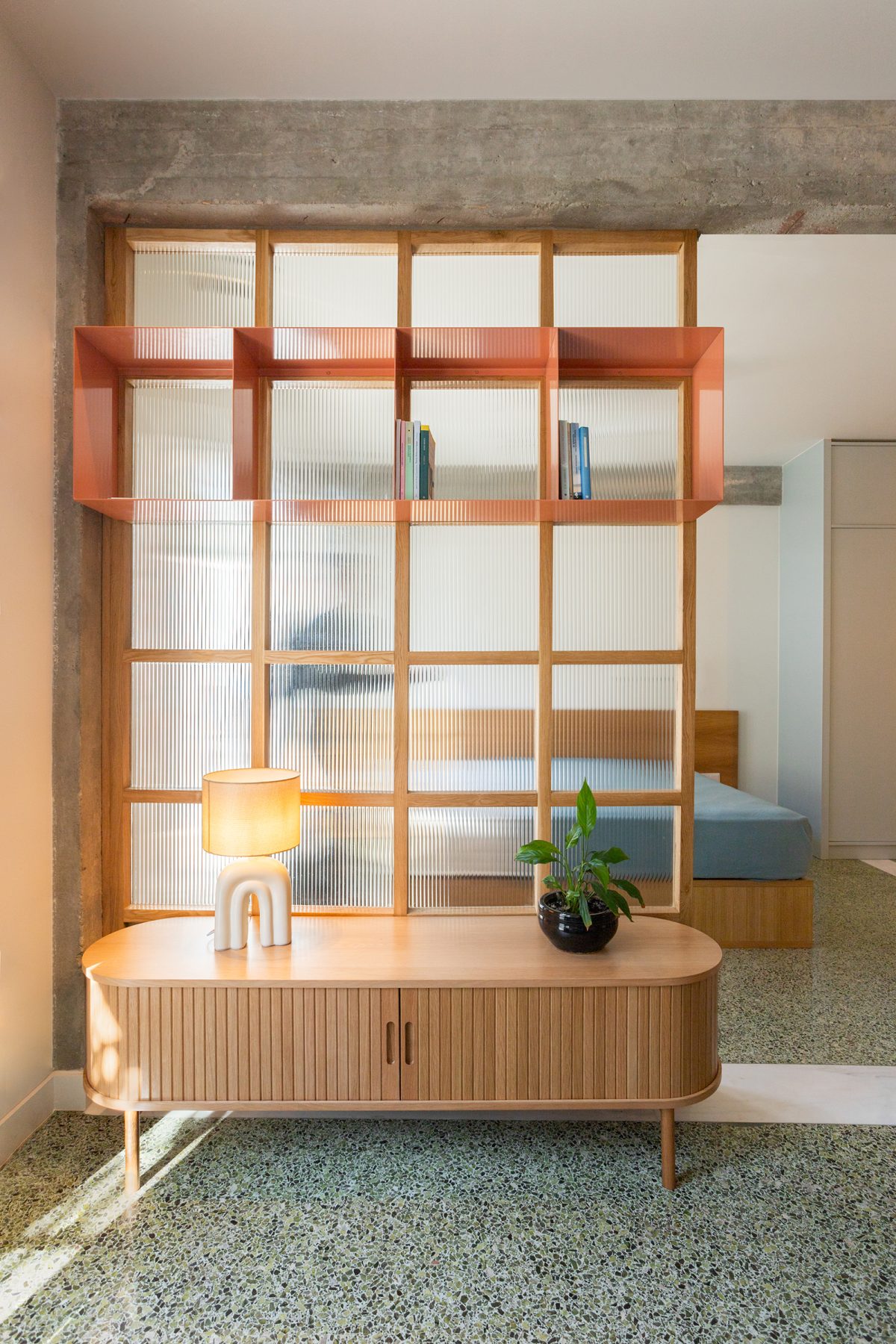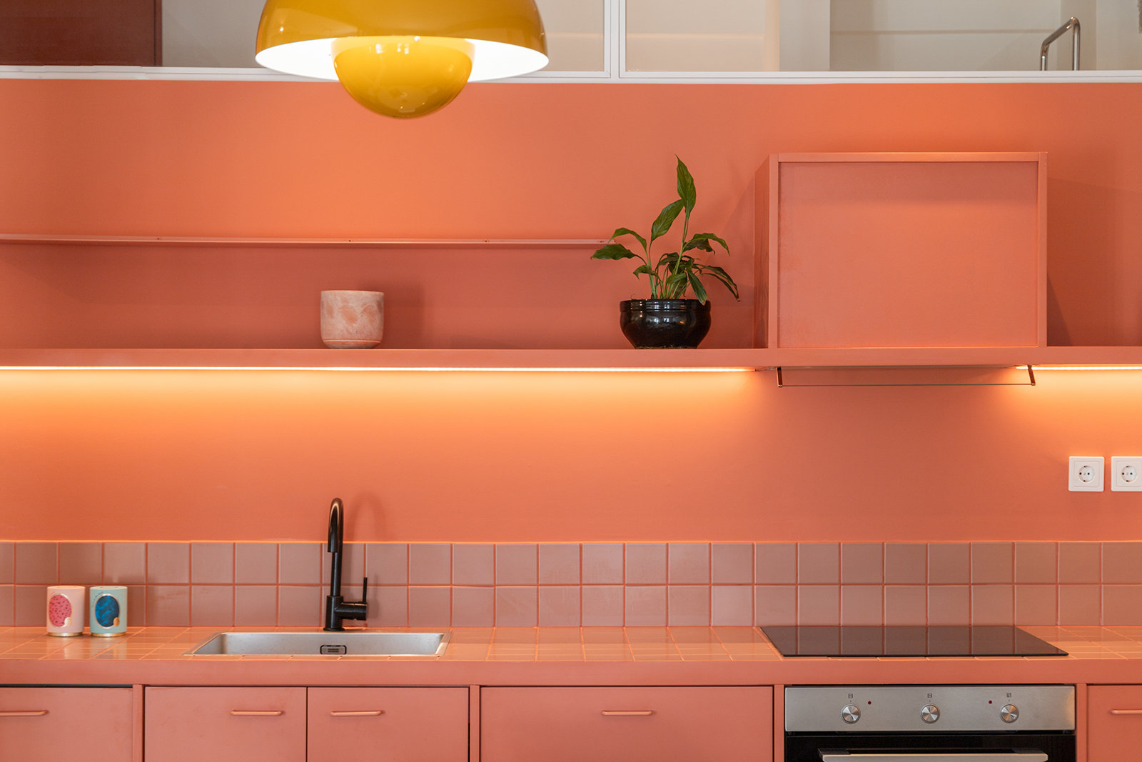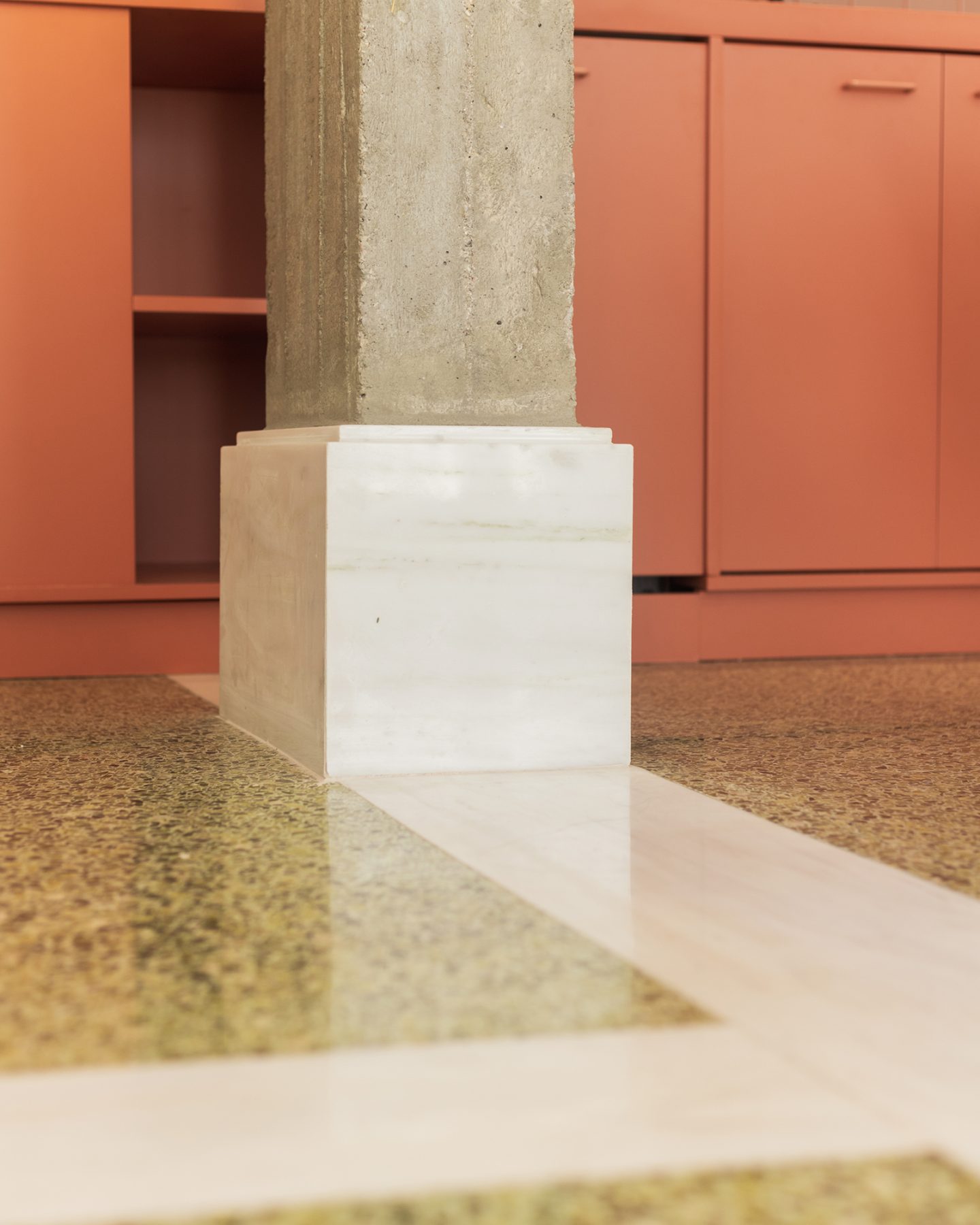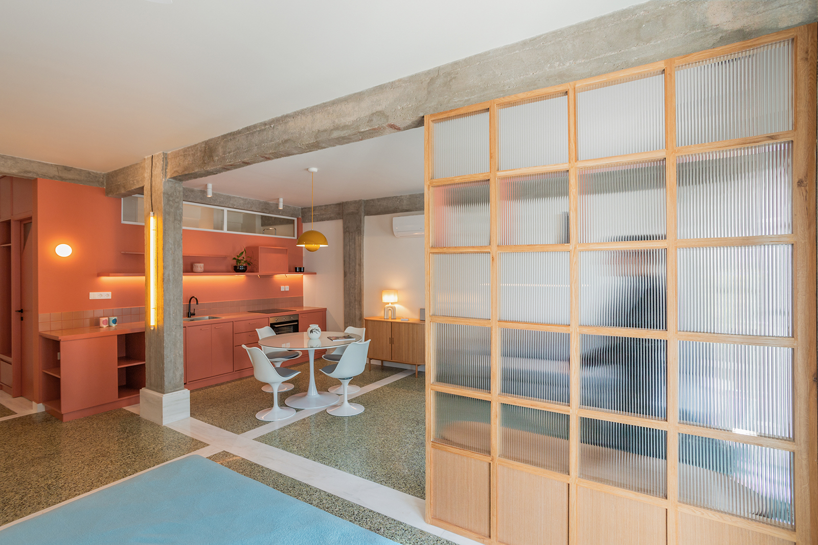 Η ελεύθερη, ανοιχτή, κάτοψη του νέου διαμερίσματος κυριαρχείται από ένα σομόν ορθογώνιο κουτί, που στο εσωτερικό του κρύβει το μπάνιο και στην εξωτερική του πλευρά φιλοξενεί την κουζίνα, τον εκτεθειμένο δομικό σκελετό από εμφανές σκυρόδεμα, και τα χαρακτηριστικά μωσαϊκά δάπεδα της αρχικής κατασκευής που διατηρούνται, αποκαθίστανται και συμπληρώνονται, στα σημεία από όπου καταργήθηκαν οι τοίχοι, με λευκό μάρμαρο Διονύσου. Τη νέα αρχιτεκτονική σύνθεση συμπληρώνουν το εμβληματικό σετ τραπεζαρίας Tulip του Eero Saarinen, ξύλινα σταθερά και κινητά έπιπλα με ρετρό αισθητική κι ένα ευρύχωρο, σχεδιασμένο από τους αρχιτέκτονες, πολυχρηστικό κρεβάτι.