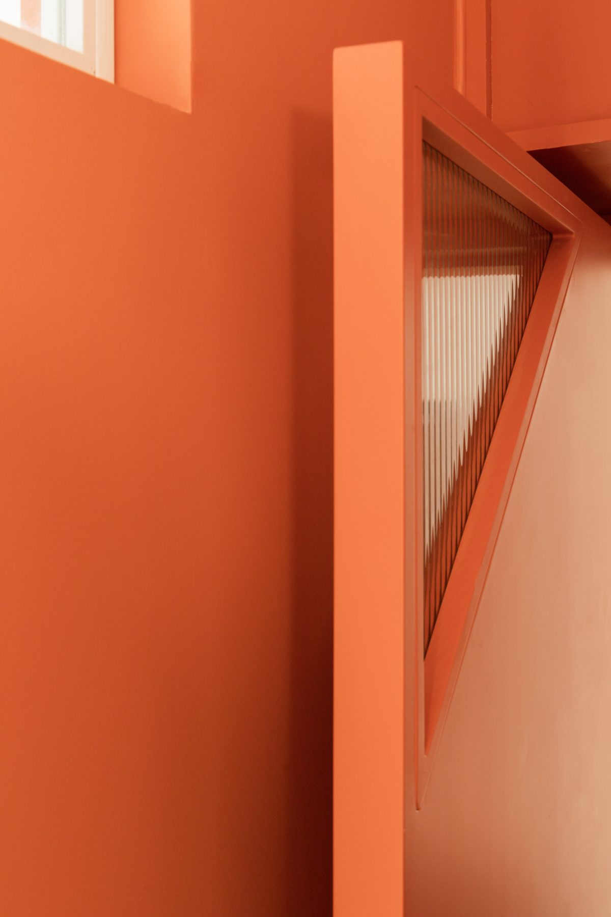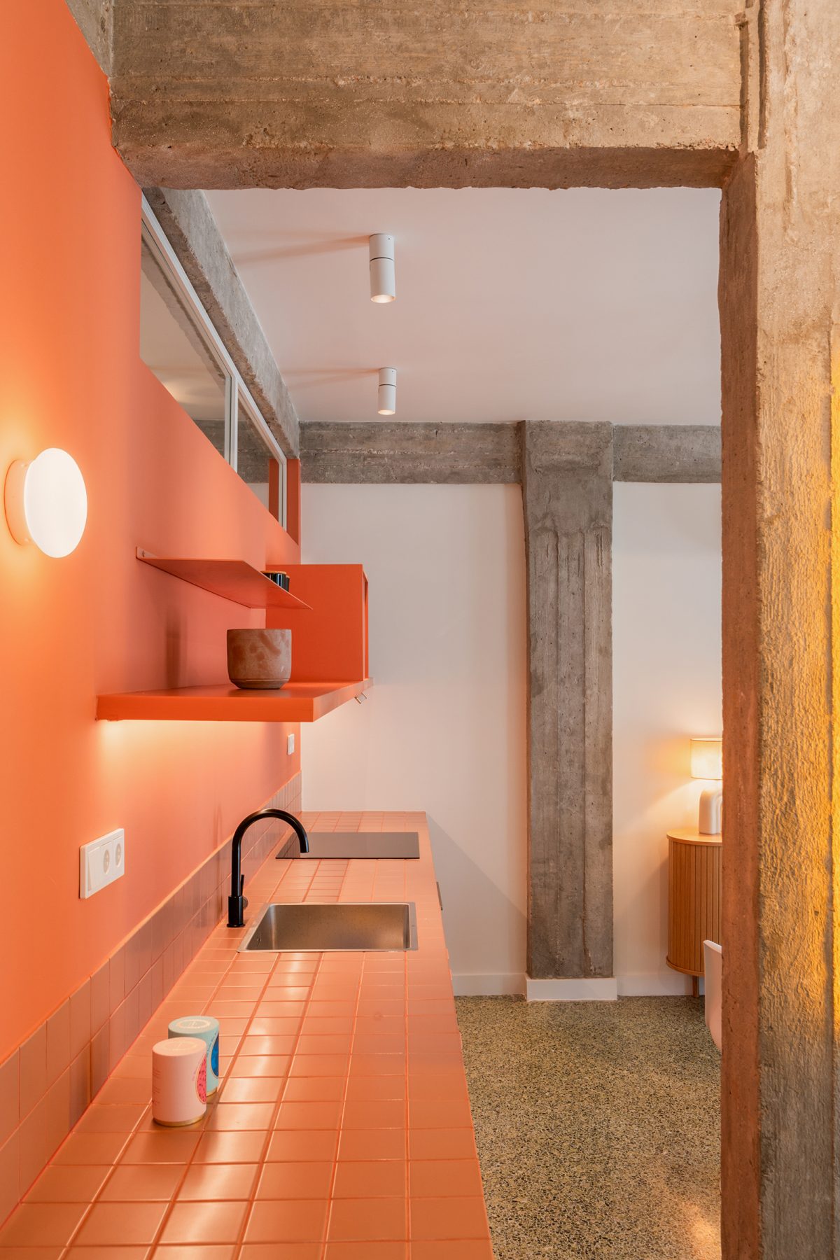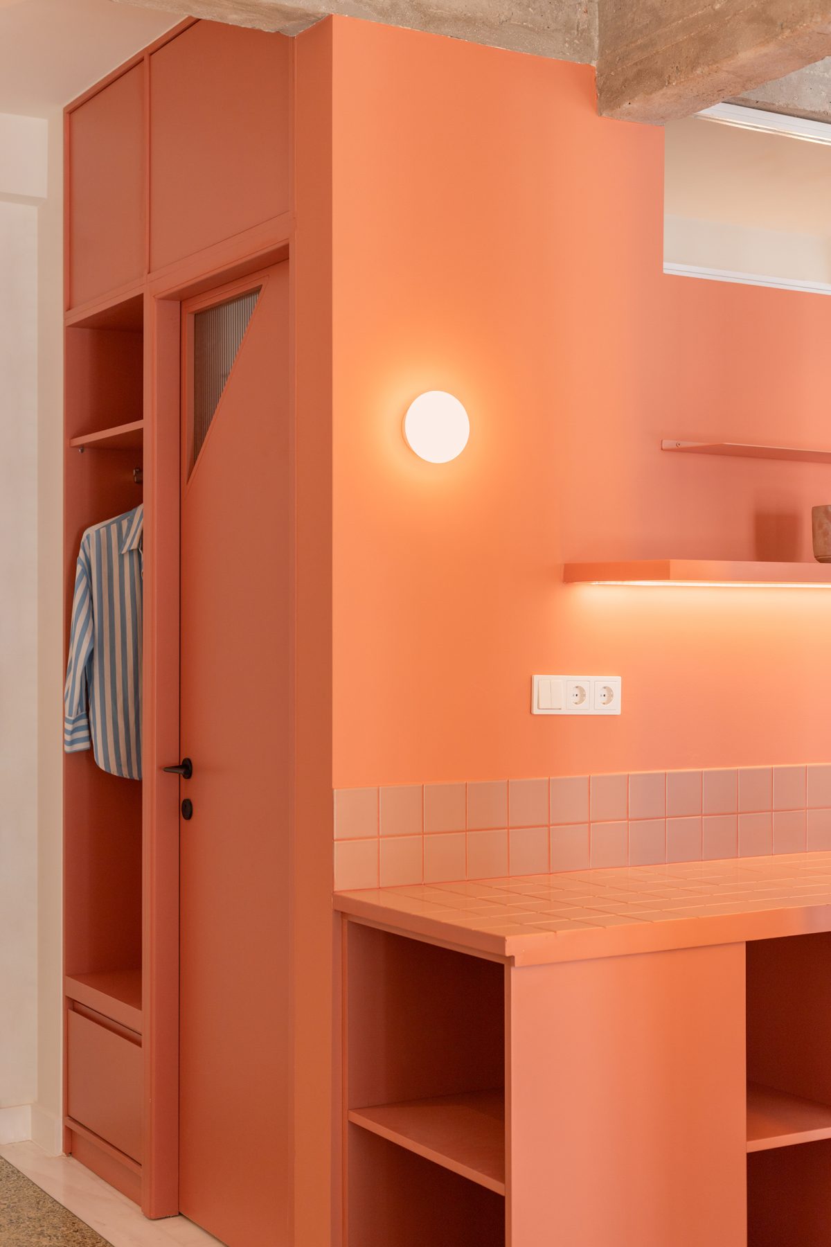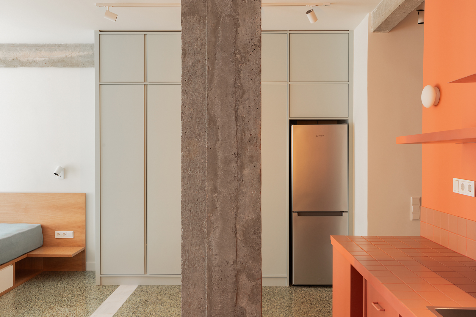 Η ελεύθερη, ανοιχτή, κάτοψη του νέου διαμερίσματος κυριαρχείται από ένα σομόν ορθογώνιο κουτί, που στο εσωτερικό του κρύβει το μπάνιο και στην εξωτερική του πλευρά φιλοξενεί την κουζίνα, τον εκτεθειμένο δομικό σκελετό από εμφανές σκυρόδεμα, και τα χαρακτηριστικά μωσαϊκά δάπεδα της αρχικής κατασκευής που διατηρούνται, αποκαθίστανται και συμπληρώνονται, στα σημεία από όπου καταργήθηκαν οι τοίχοι, με λευκό μάρμαρο Διονύσου. Τη νέα αρχιτεκτονική σύνθεση συμπληρώνουν το εμβληματικό σετ τραπεζαρίας Tulip του Eero Saarinen, ξύλινα σταθερά και κινητά έπιπλα με ρετρό αισθητική κι ένα ευρύχωρο, σχεδιασμένο από τους αρχιτέκτονες, πολυχρηστικό κρεβάτι.