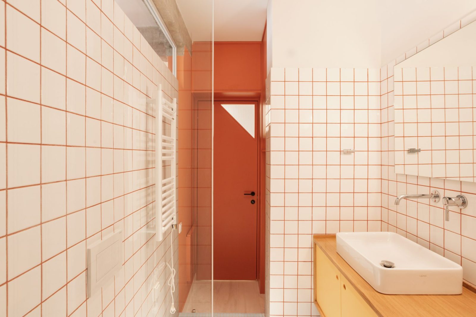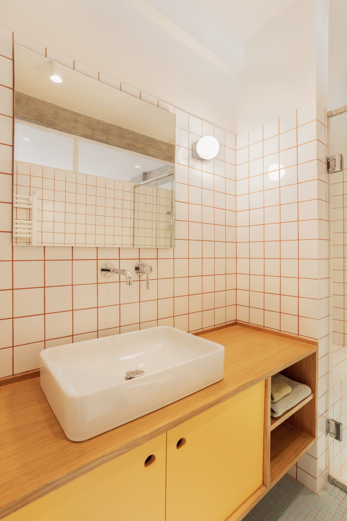 ΕΠ: Όπως ανέφερα και παραπάνω, πέρα από κάθε design ή αισθητική προσέγγιση, η διαχρονικότητα ενός έργου ξεκινά από τη λειτουργικότητα και την ιδιομορφία της κάτοψής του. Μία καλή κάτοψη δε βγαίνει ποτέ “εκτός μόδας”. Το συγκεκριμένο διαμέρισμα προέκυψε από τη συνένωση δύο γραφείων των 25 τμ το καθένα, τα οποία βρίσκονται σε ένα κτήριο, κλασικό δείγμα αρχιτεκτονικής του 1970, το οποίο απαρτίζεται κυρίως από τέτοιους μικρούς χώρους γραφείων, οι οποίοι όμως έχουν πάψει να λειτουργούν και δεν έχουν ζήτηση πια. Κατόπιν η εφαρμογή “καλών”, φυσικών και διαχρονικών υλικών μπορεί να εγγυηθεί ότι ένα έργο ανεξαρτήτως χρήσης ή εποχής θα “παλιώσει” ωραία. Για το λόγο αυτό, στο συγκεκριμένο έργο διατηρήθηκαν τα μωσαϊκά του δαπέδου και συνεχίστηκαν όπου χρειάστηκε με μάρμαρο Διονύσου, όλα τα χρωματιστά έπιπλα είναι σατινέ λάκες και το ξύλο μασίφ δρυς, ενώ όλος ο σταθερος εξοπλισμός είναι σχεδιασμένος από την ομάδα μας για το συγκεκριμένο έργο.
