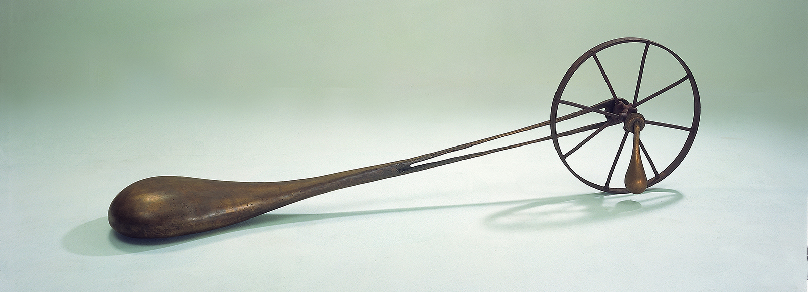 Μαρκ Ντέρντεν: Εκτός από την ματράκ-φαλλό, ένα άλλο γλυπτικό μοτίβο της δουλειάς σου που εμφανίστηκε επίσης στα 1960 είναι η ρόδα. Πρωτοπαρουσιάστηκε στο Έντομο κρεμασμένο από ρόδα ποδηλάτου (Εικόνα 12). Μπορείς να μας μιλήσεις περισσότερο για την σημασία της ρόδας στην γλυπτική σου, και να μας πεις επίσης πώς σχετίζεται με το πρώτο ready made του Μαρσέλ Ντυσάν (Μarced Duchamp), που έγινε πενήντα χρόνια νωρίτερα (1913);