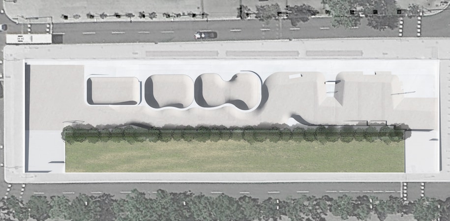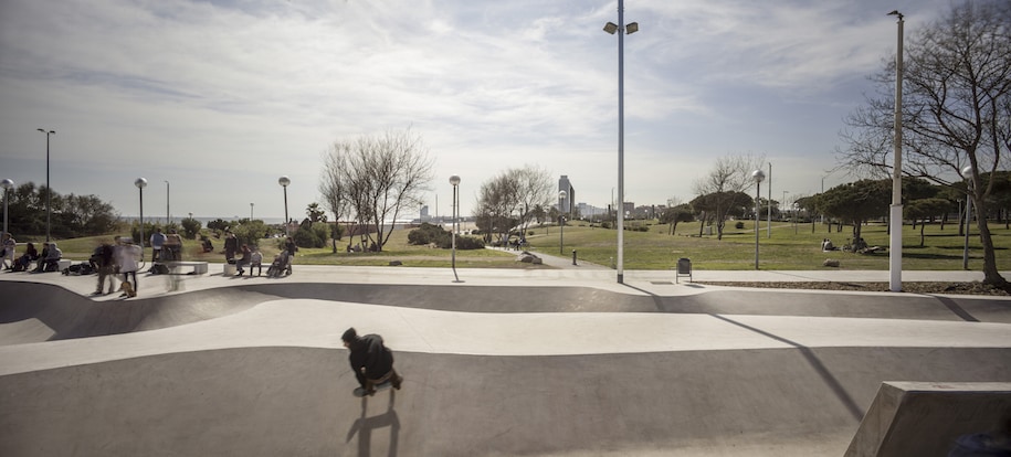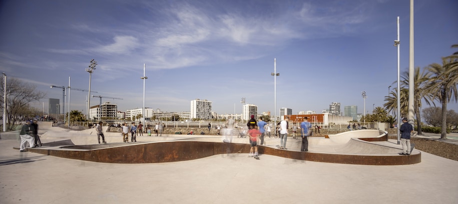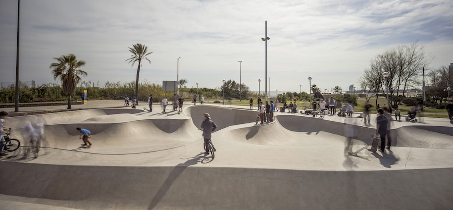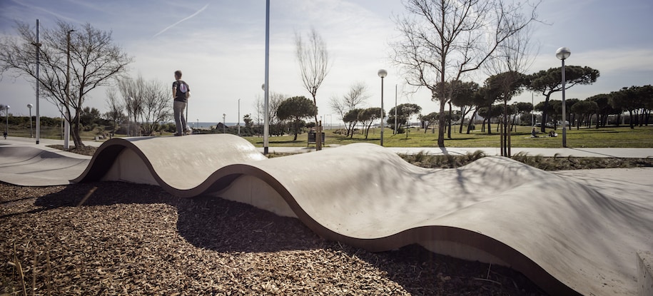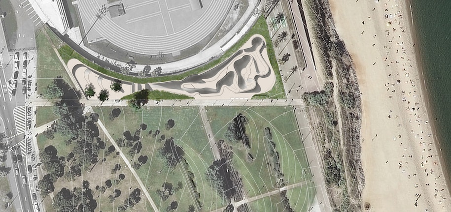 Mar Bella Urban Sports Park has been designed as a multipurpose skating area. It is thought of as an artificial topography, a set of dunes and paths that follows the strategy of Poble Nou Park. The project is adapted to the terrain and makes use of its slope, allowing the long skating run from the city towards the sea front. At the top, closer to the road, there is a street area with benches, walls and handrails, that operates as an entrance door, along with a large bench that serves as a meeting point and viewpoint from where to start the descent. The next element, the snake run, is formed by a topography that allows long run skating with surfing-like movements. At the bottom, where the park just touches the dunes, there are two intertwined pools of different geometries and levels of difficulty. On both sides, there are benches and terraces to enhance the spot as a meeting point and a rest area, not only for users but also for people who are walking through Poble Nou park, or for those who are going or coming back from the beach.