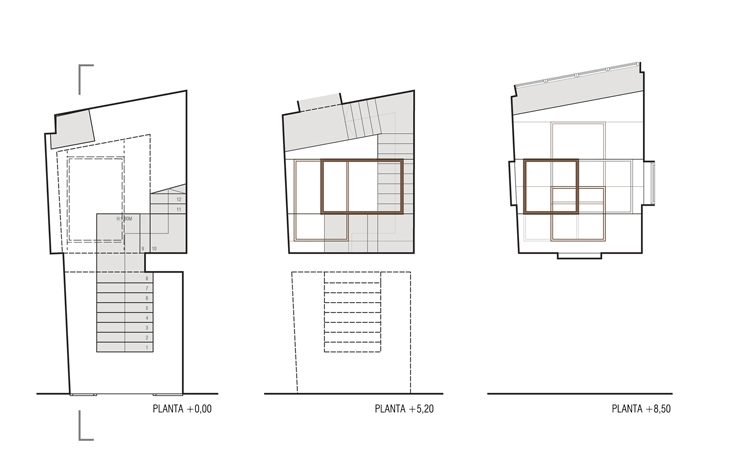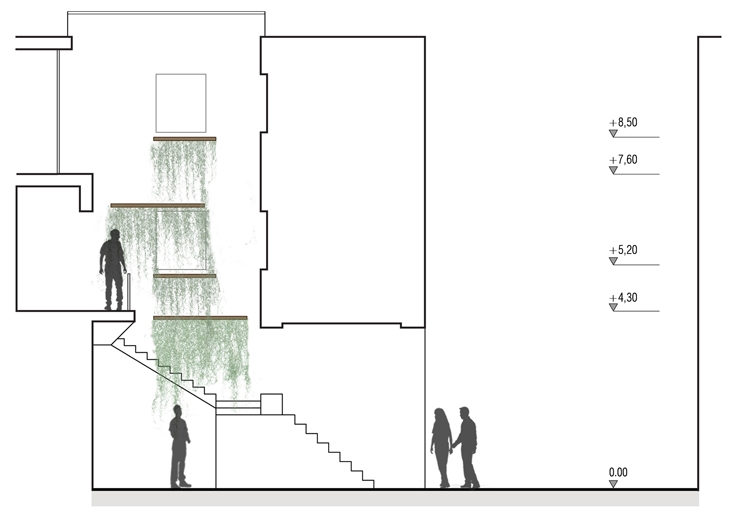 The proposal of these architects reinterprets the look of this space by moving the tree structure to these small gestures or traditional landscape architecture. The verticality of the vacuum acts as support or trunk of this matrix which filters the relationship between the inside and outside of the space: lights and shadows. The sequence and partial overlap of these elements that complete the vacuum structure, find the look at various points in space from which percible: outside, inside, up or down.
