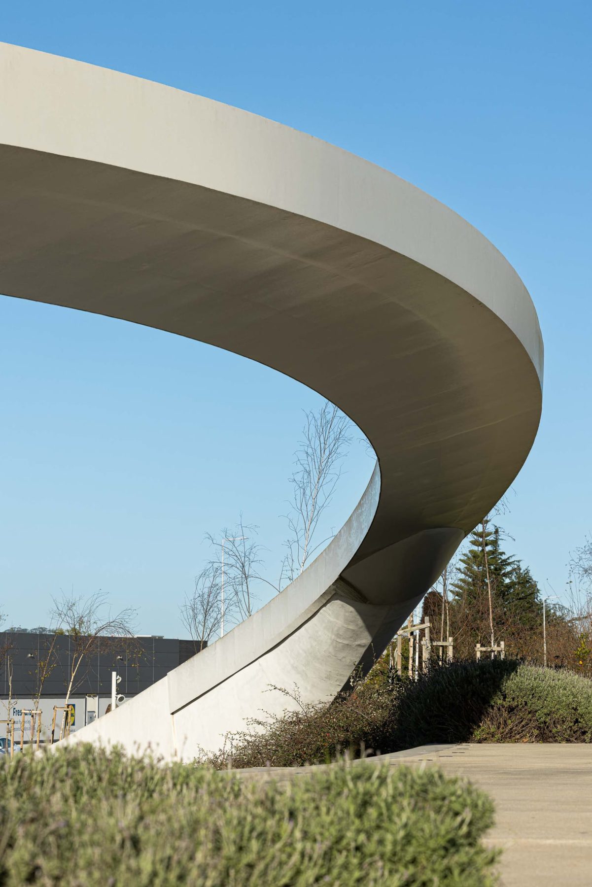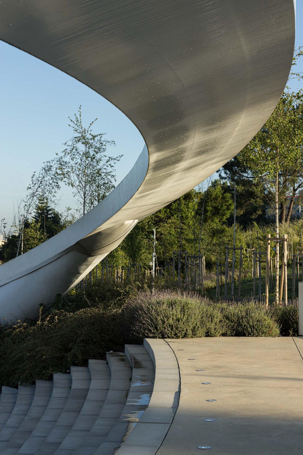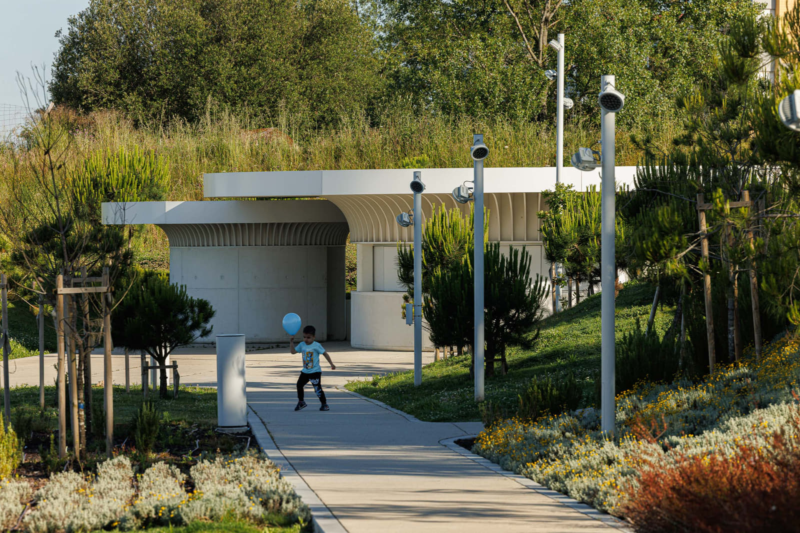 This element, which draws the perimeter of the park, to the west, transforms into a large arch composed of two large white concrete bases and, at the top, by large metal beams capped with white metal sheeting.