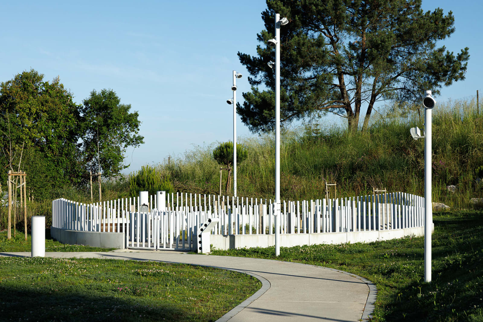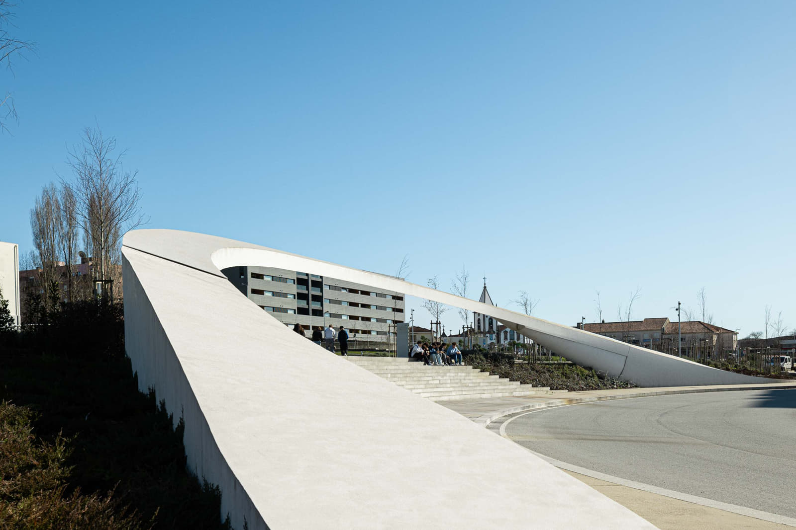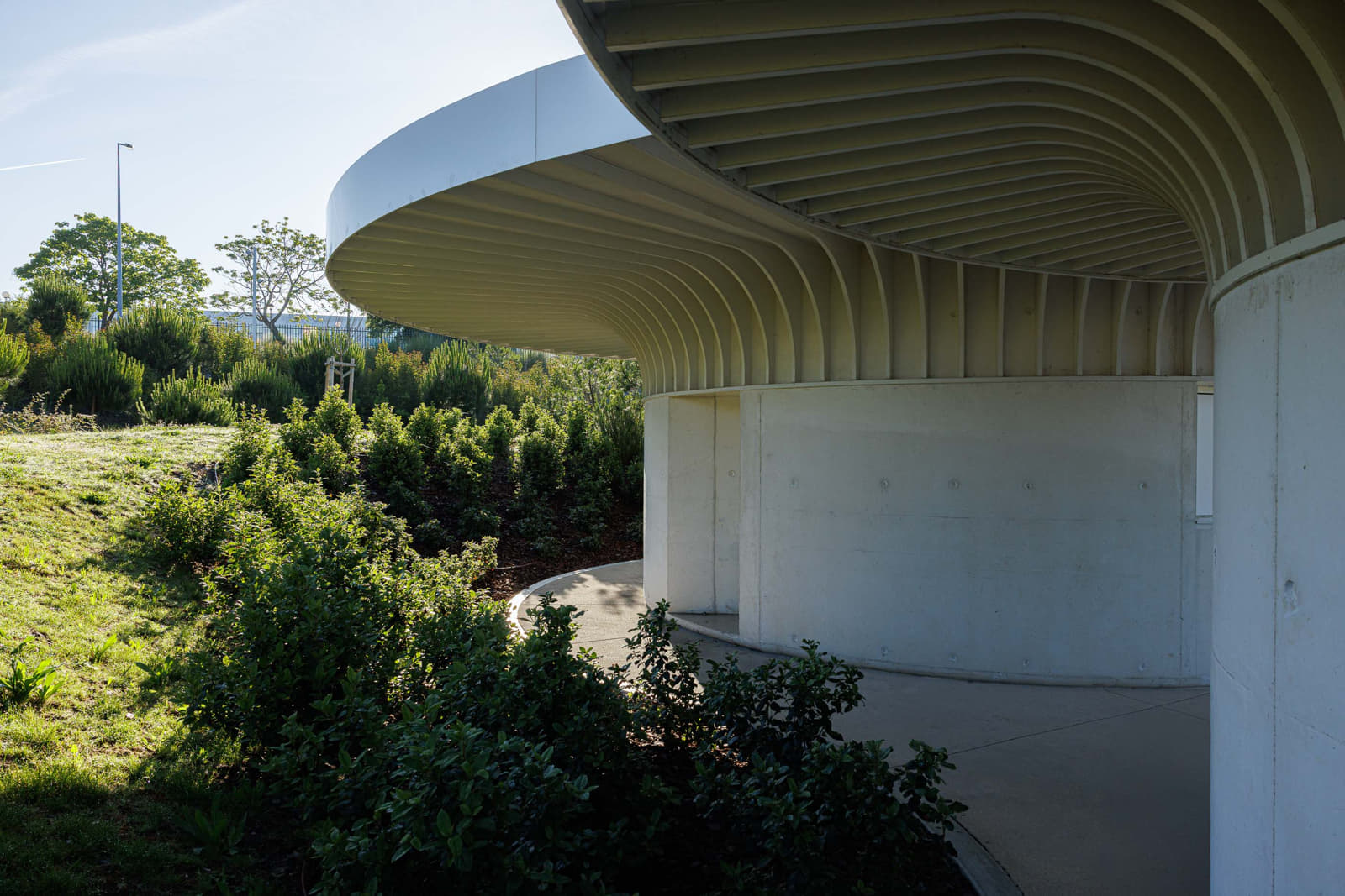 This element, which draws the perimeter of the park, to the west, transforms into a large arch composed of two large white concrete bases and, at the top, by large metal beams capped with white metal sheeting.
