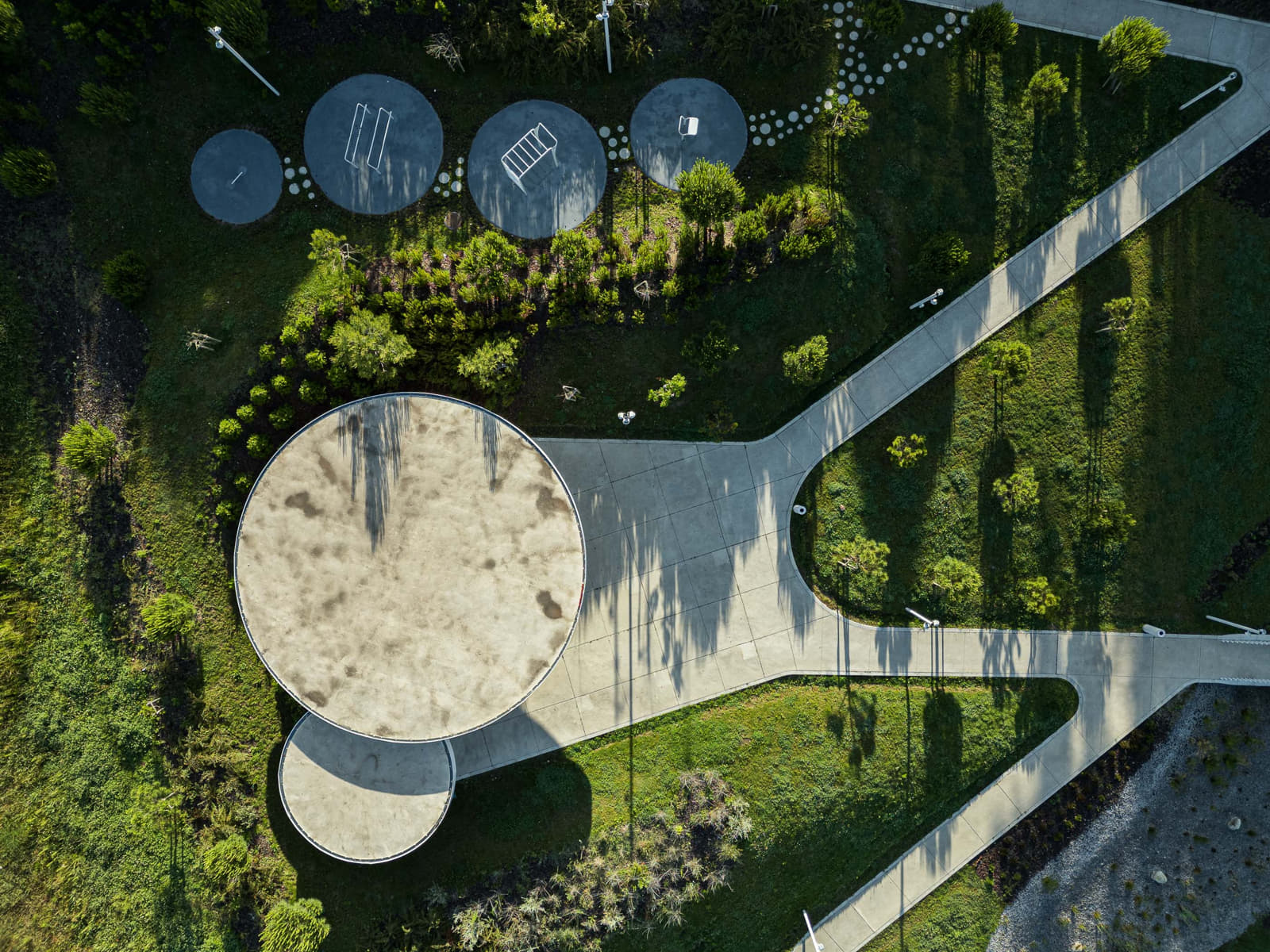 The park’s lighting is provided by embedded LED strips as well as Soneres Spider C columns, 3.5m high with two floodlights and 6m high with three floodlights.