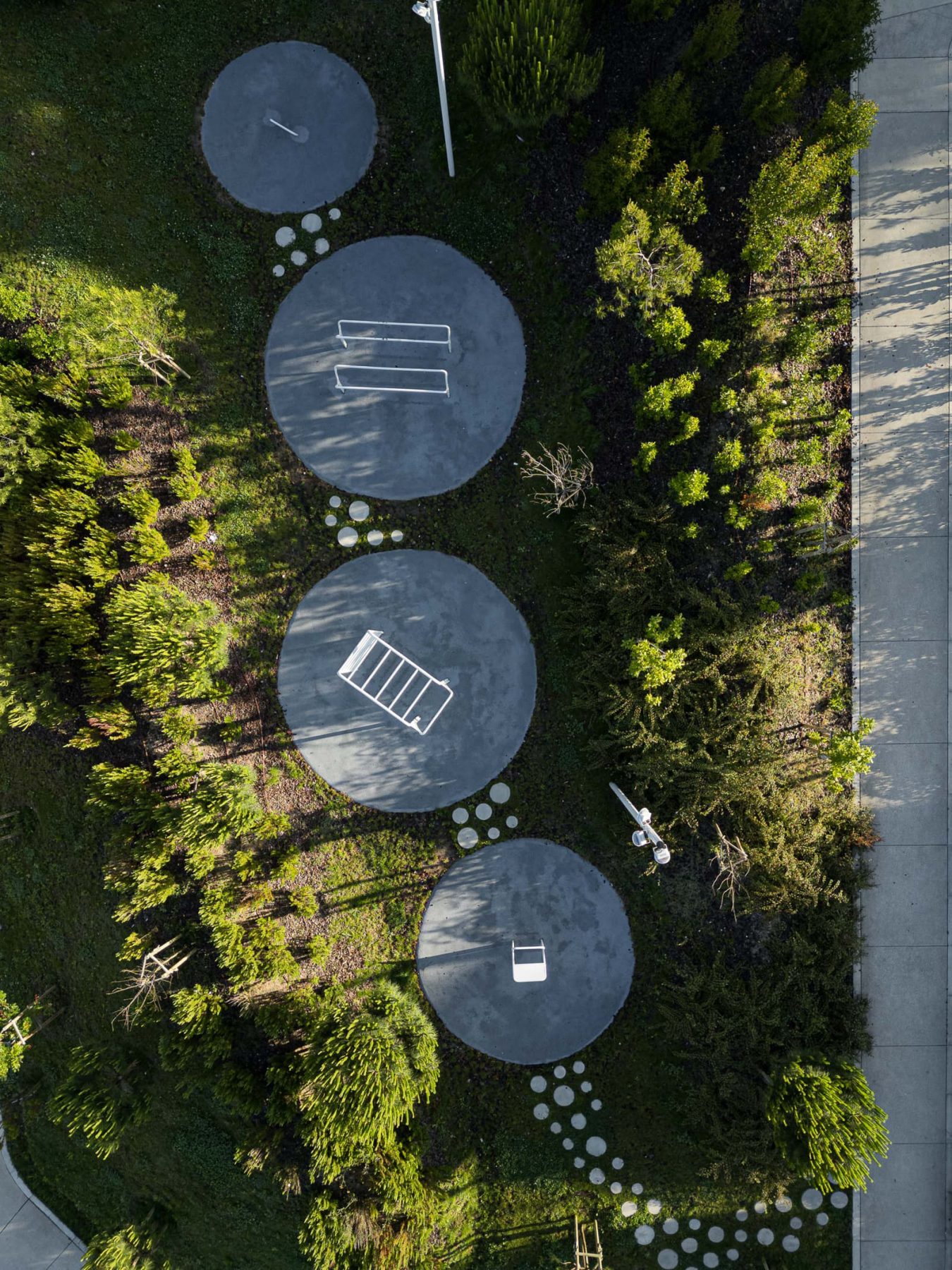 There is also a dog park with obstacle and play areas and an outdoor fitness area. By slightly modeling the terrain, the necessary privacy of each space is promoted.