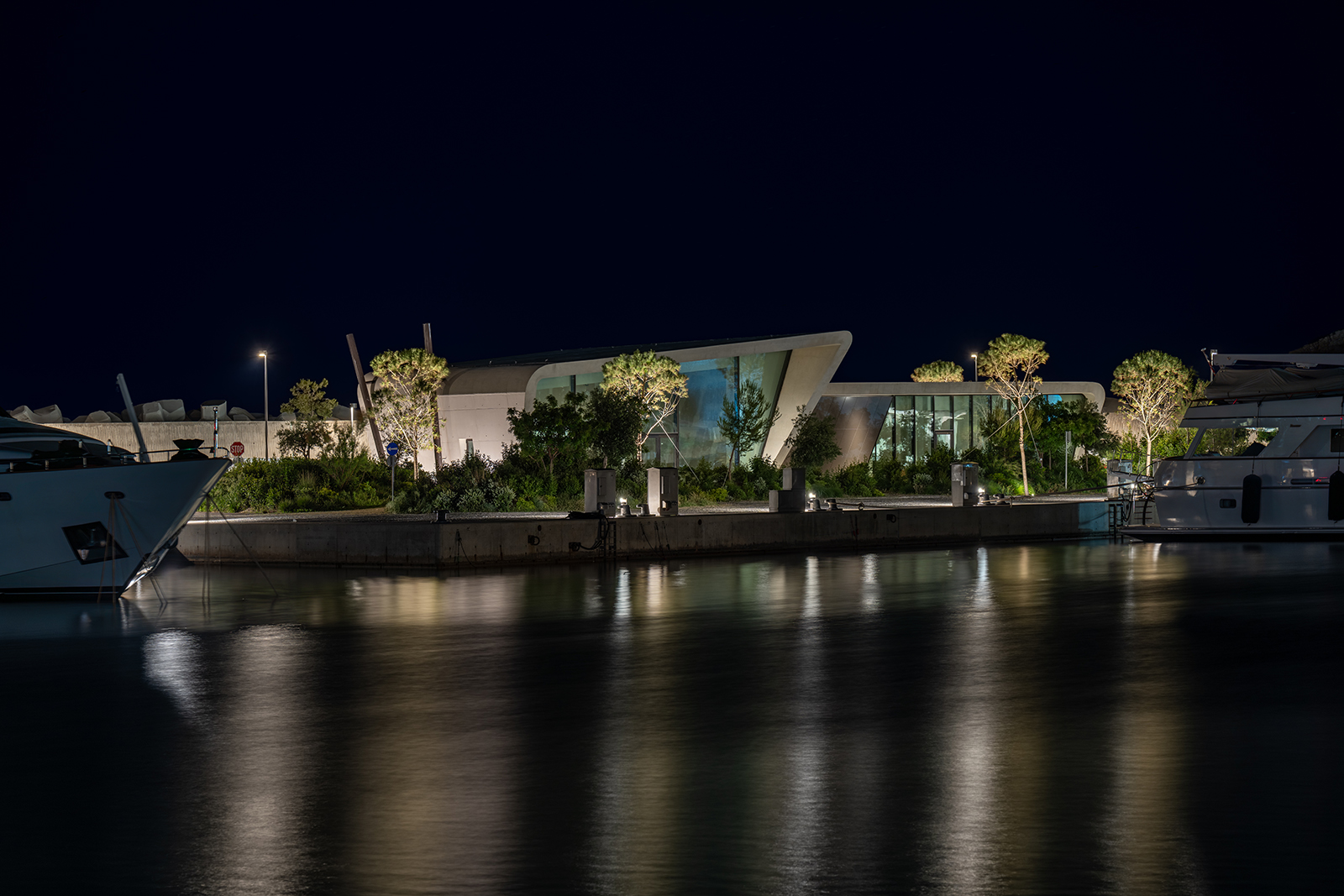 Ο φωτισμός ενοποιεί τις διαφορετικές περιοχές της μαρίνας – από πεζοδρόμια έως πολυτελή εστιατόρια – ενώ αναδεικνύει τα αρχιτεκτονικά στοιχεία και διατηρεί την ιεραρχία των κατασκευών.