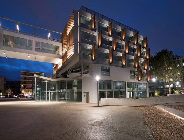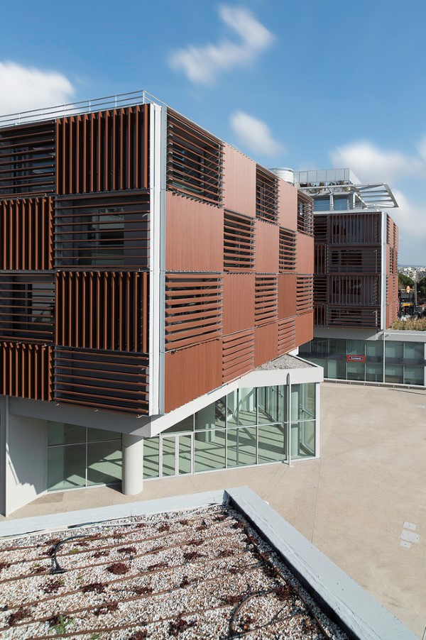 Τοποθετήθηκαν εξωτερικά κινητά σκιάστρα σε οριζόντια και κατακόρυφη διάταξη, με τρόπο που σχηματίζουν μια «σκακιέρα» και προσφέρουν μια αίσθηση ενιαίας όψης. Οι περσίδες προστατεύουν ενεργειακά τα κτίρια του συγκροτήματος, καθώς η κλίση τους προσαρμόζεται στην κίνηση του ήλιου αποτρέποντας την άμεση ηλιοφάνεια στα υαλοστάσια και στους εργασιακούς χώρους. Επίσης έγινε αλλαγή στα κουφώματα με νέα, θερμομονωτικά, με υαλοστάσια υψηλών ενεργειακών προδιαγραφών και θερμοδιακοπτώμενα πλαίσια αλουμινίου. Επιλεκτικά, κάποια από τα κουφώματα είναι ανοιγόμενα.