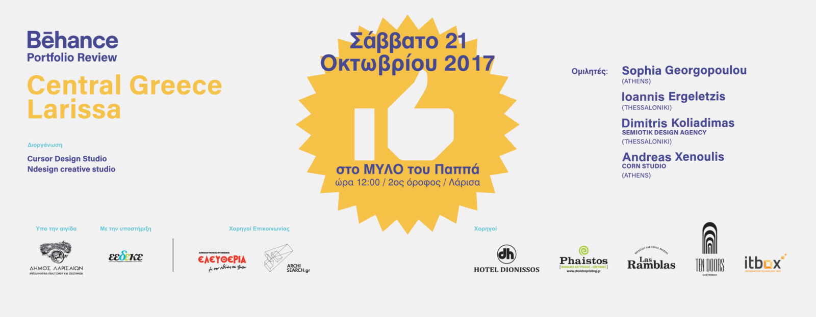 Το Behance, η δημοφιλέστερη και μεγαλύτερη διαδικτυακή πλατφόρμα για δημιουργούς και επαγγελματίες designers, με περισσότερα από 1,5 εκατομμύριο μέλη σε 172 χώρες, διοργανώνει, στα πλαίσια της παγκόσμιας εβδομάδας Behance reviews, το Behance Portfolio Review Central Greece, Larissa.