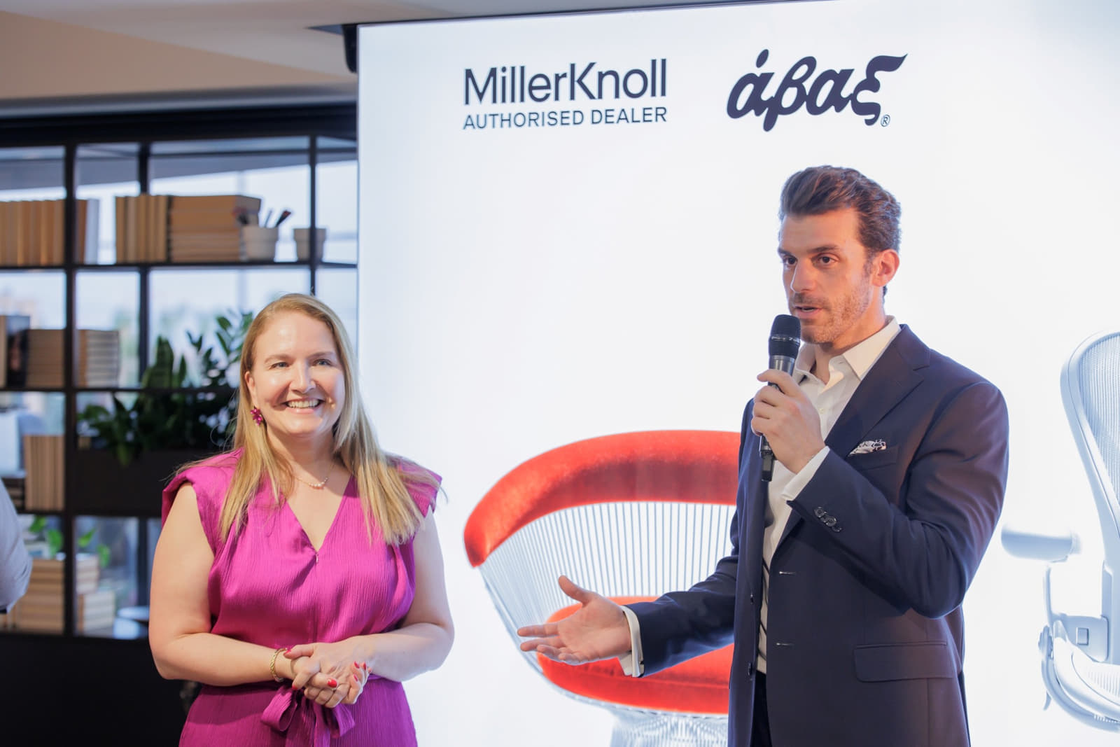 Στο πλαίσιο της εκδήλωσης, χαιρετισμό απηύθυναν δύο πρόσωπα-κλειδιά της συνεργασίας: η Sandrine Cardinale, Regional Director EMEA της MillerKnoll, και ο Δημήτρης Κόμης, Διευθύνων Σύμβουλος της Άβαξ.
