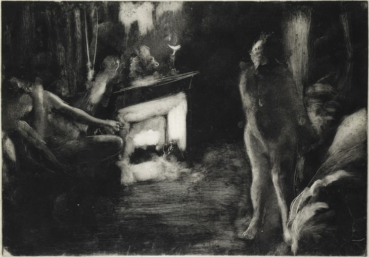 EDGAR DEGAS (FRENCH, 1834?1917). THE FIRESIDE (LE FOYER [LA CHEMINÉE]), C. 1880?85. MONOTYPE ON PAPER. PLATE: 16 3/4 X 23 1/16 IN. (42.5 X 58.6 CM), SHEET: 19 3/4 X 25 1/2 IN. (50.2 X 64.8 CM). THE METROPOLITAN MUSEUM OF ART, NEW YORK. HARRIS BRISBANE DICK FUND, THE ELISHA WHITTELSEY COLLECTION, THE ELISHA WHITTELSEY FUND, AND C. DOUGLAS DILLON GIFT, 1968 (68.670).