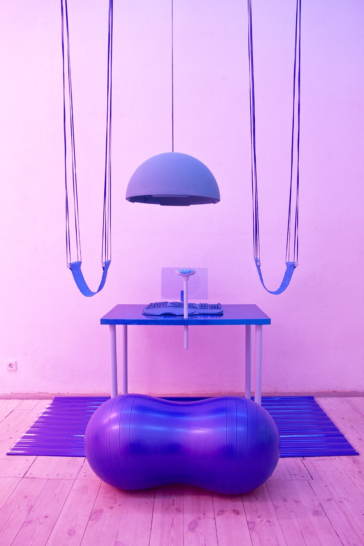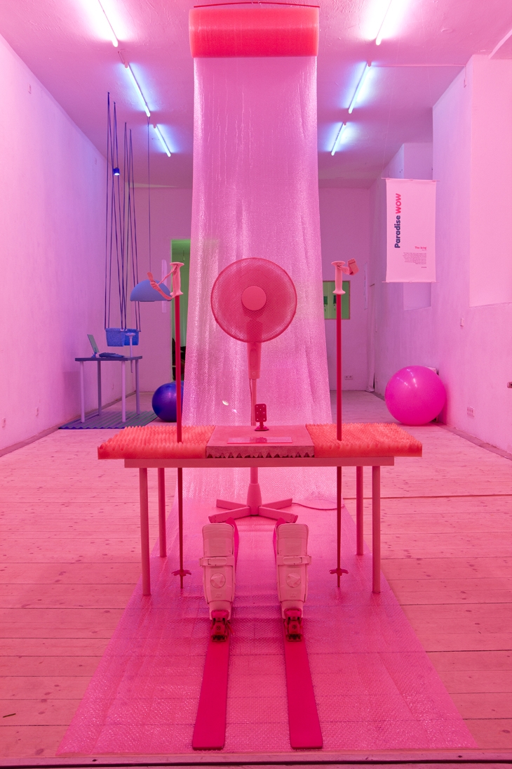 Paradise WOW’s desk installations attend to individual productivity and are assembled in an work-leisure circuit. The installation outlines a dystopian scenario in which productivity-centered trends are used to turn employees` personality and subjectivity into company`s assets.