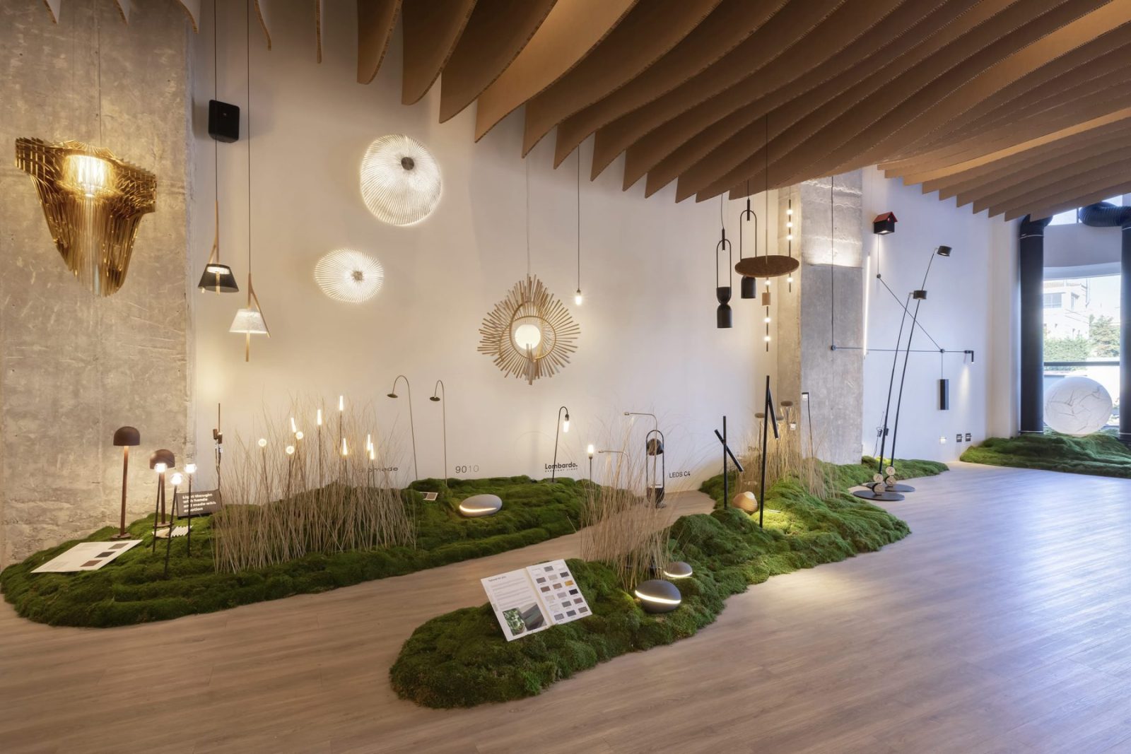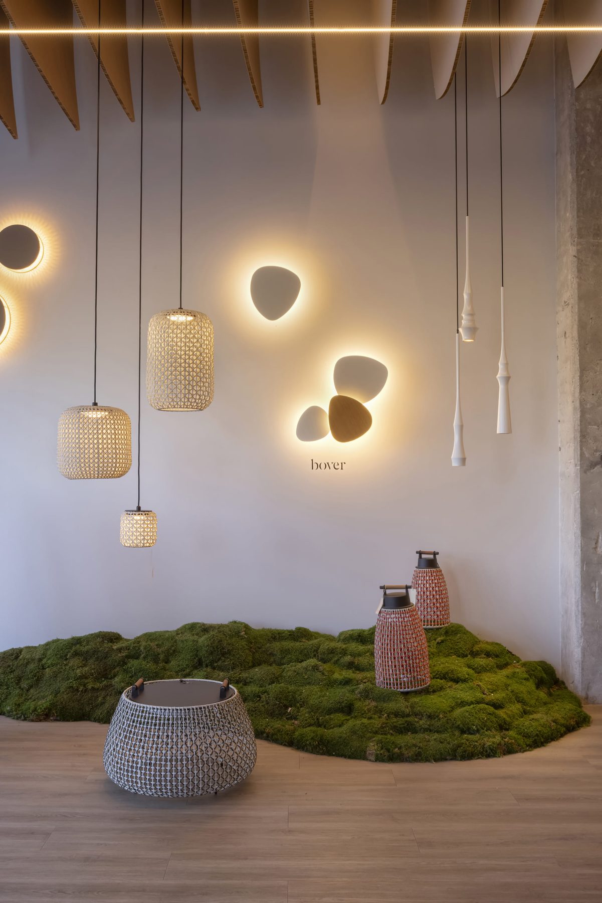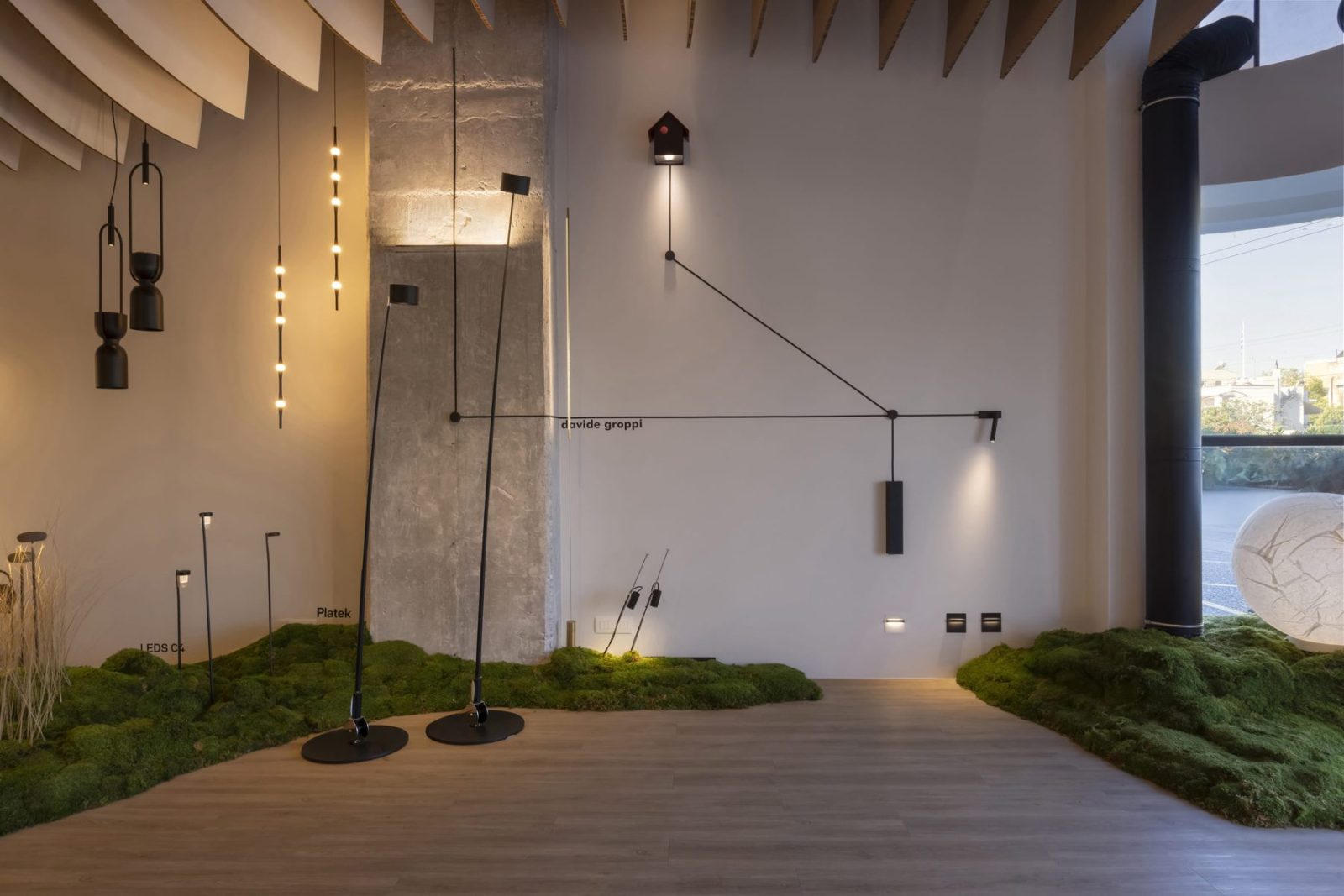 Ολόκληρος ο ισόγειος χώρος λειτουργεί ως εκθεσιακή ζώνη με έμφαση στον διακοσμητικό φωτισμό, αναδεικνύοντας φωτιστικά από επιλεγμένες συνεργαζόμενες εταιρείες μέσα σε ένα «τεχνητό τοπίο». Η παρουσία βιτρίνας προς τη Λ. Κηφισίας προσδίδει στον χώρο χαρακτήρα «αστικού εκθέματος», τοποθετώντας τον σε διάλογο με τα premium brands που τον περιβάλλουν.