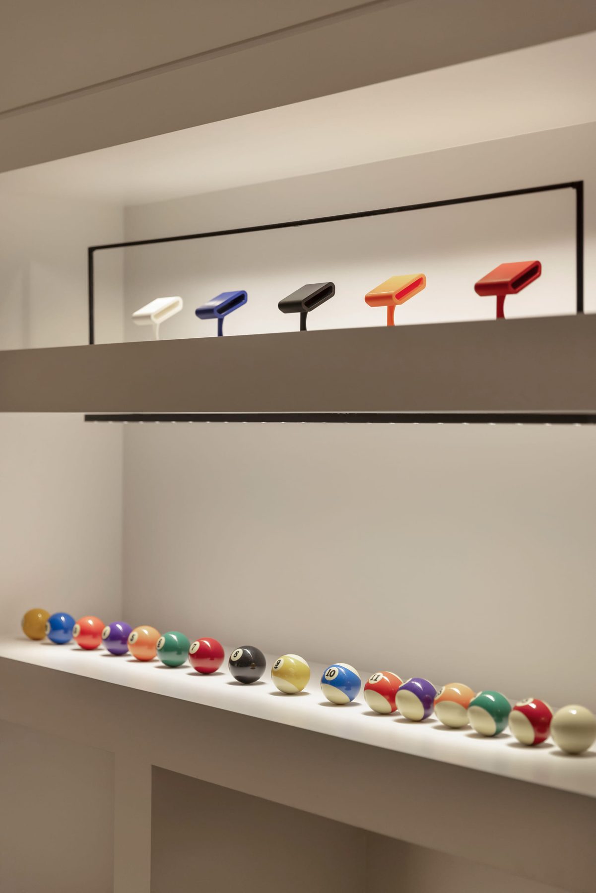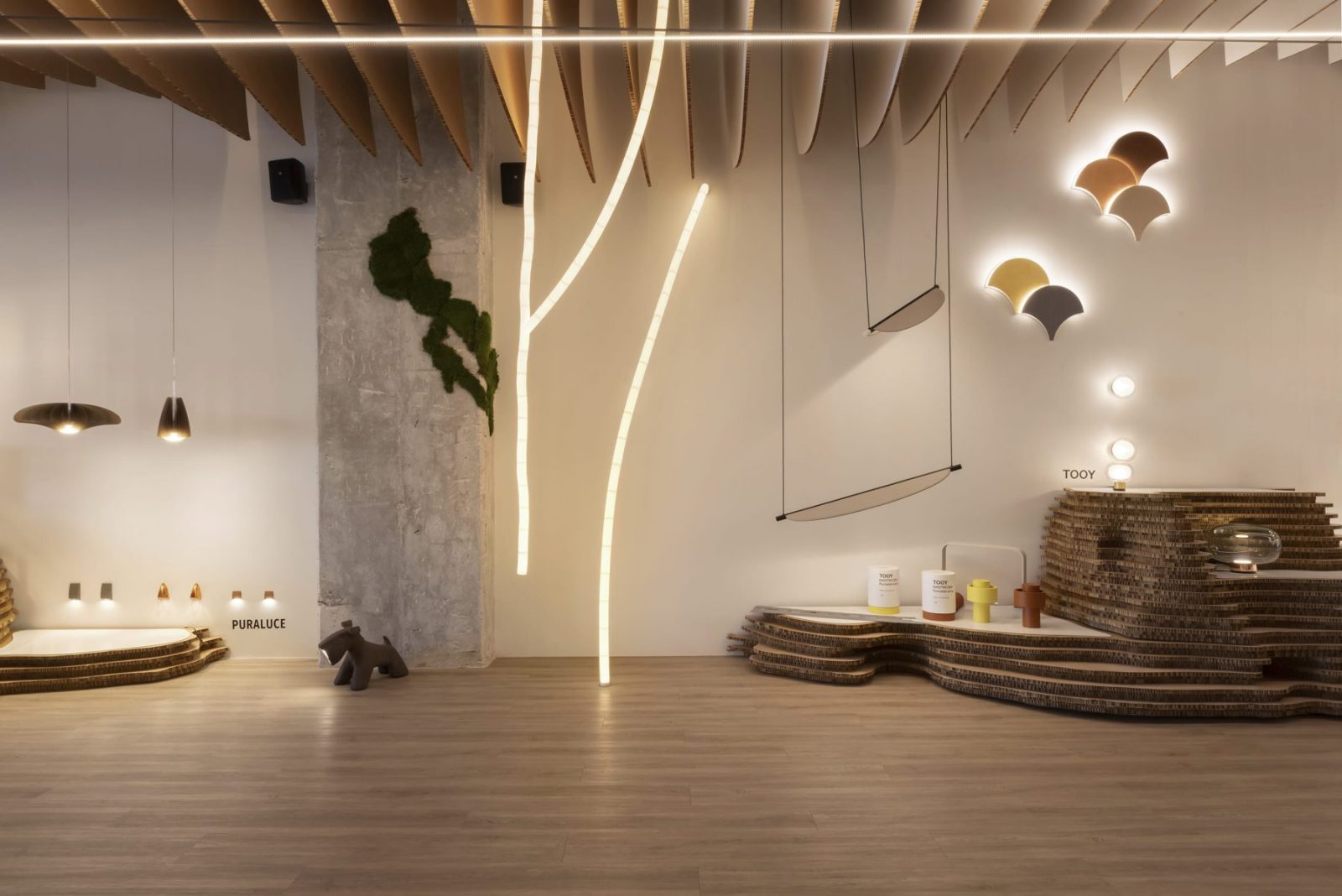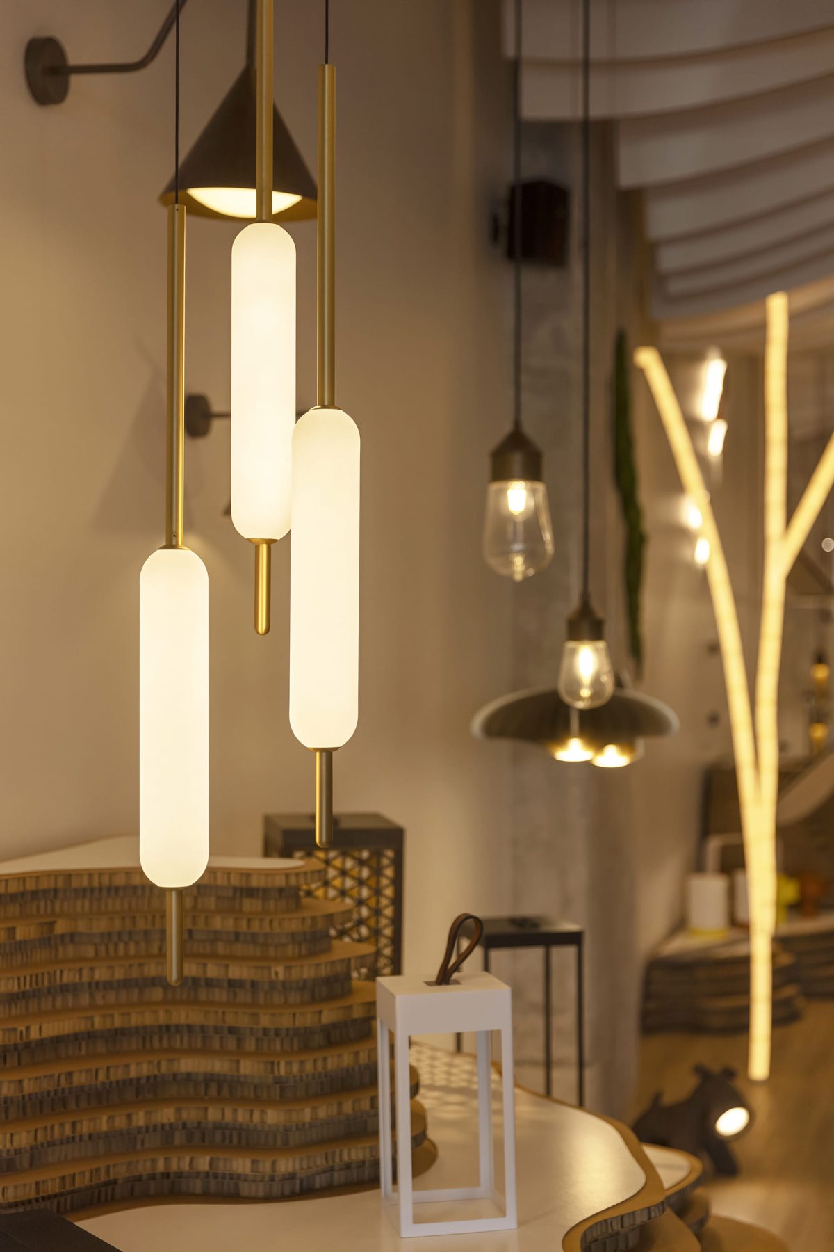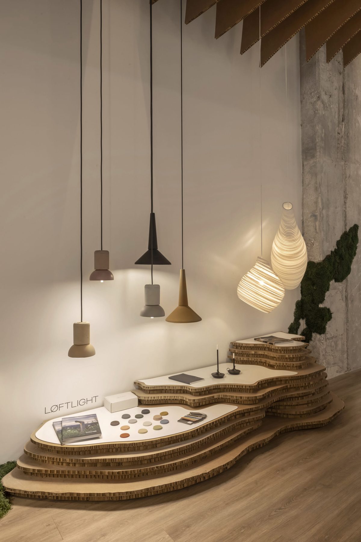 Ολόκληρος ο ισόγειος χώρος λειτουργεί ως εκθεσιακή ζώνη με έμφαση στον διακοσμητικό φωτισμό, αναδεικνύοντας φωτιστικά από επιλεγμένες συνεργαζόμενες εταιρείες μέσα σε ένα «τεχνητό τοπίο». Η παρουσία βιτρίνας προς τη Λ. Κηφισίας προσδίδει στον χώρο χαρακτήρα «αστικού εκθέματος», τοποθετώντας τον σε διάλογο με τα premium brands που τον περιβάλλουν.