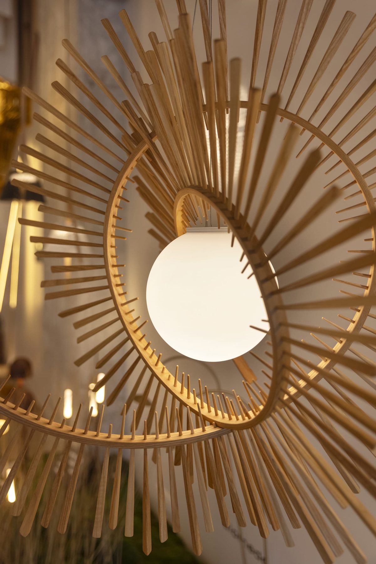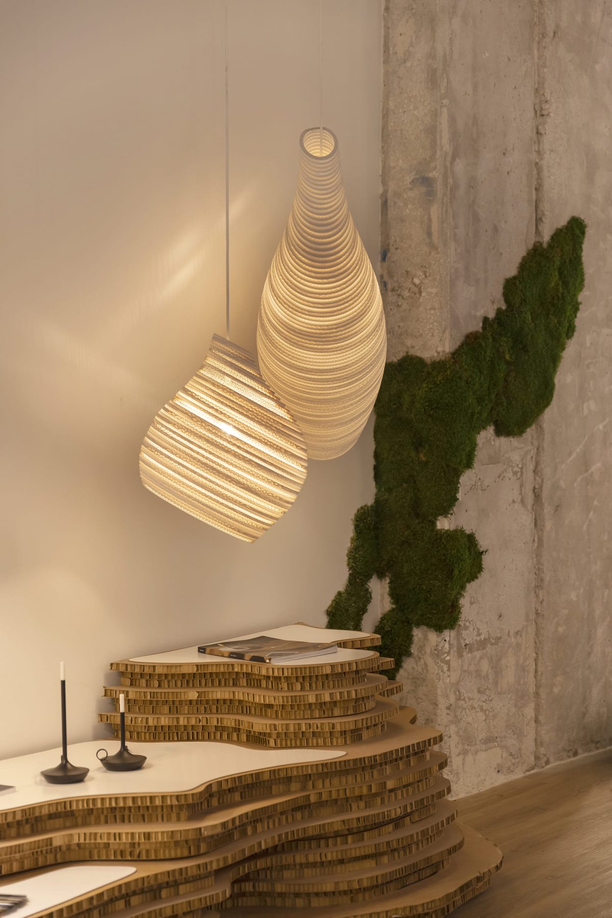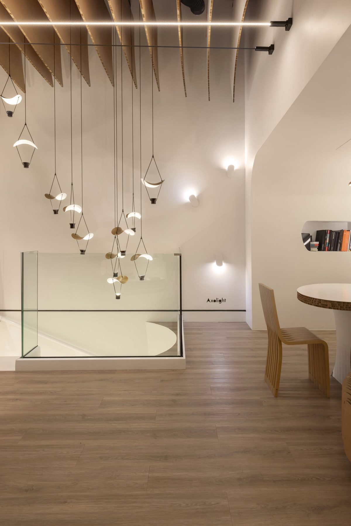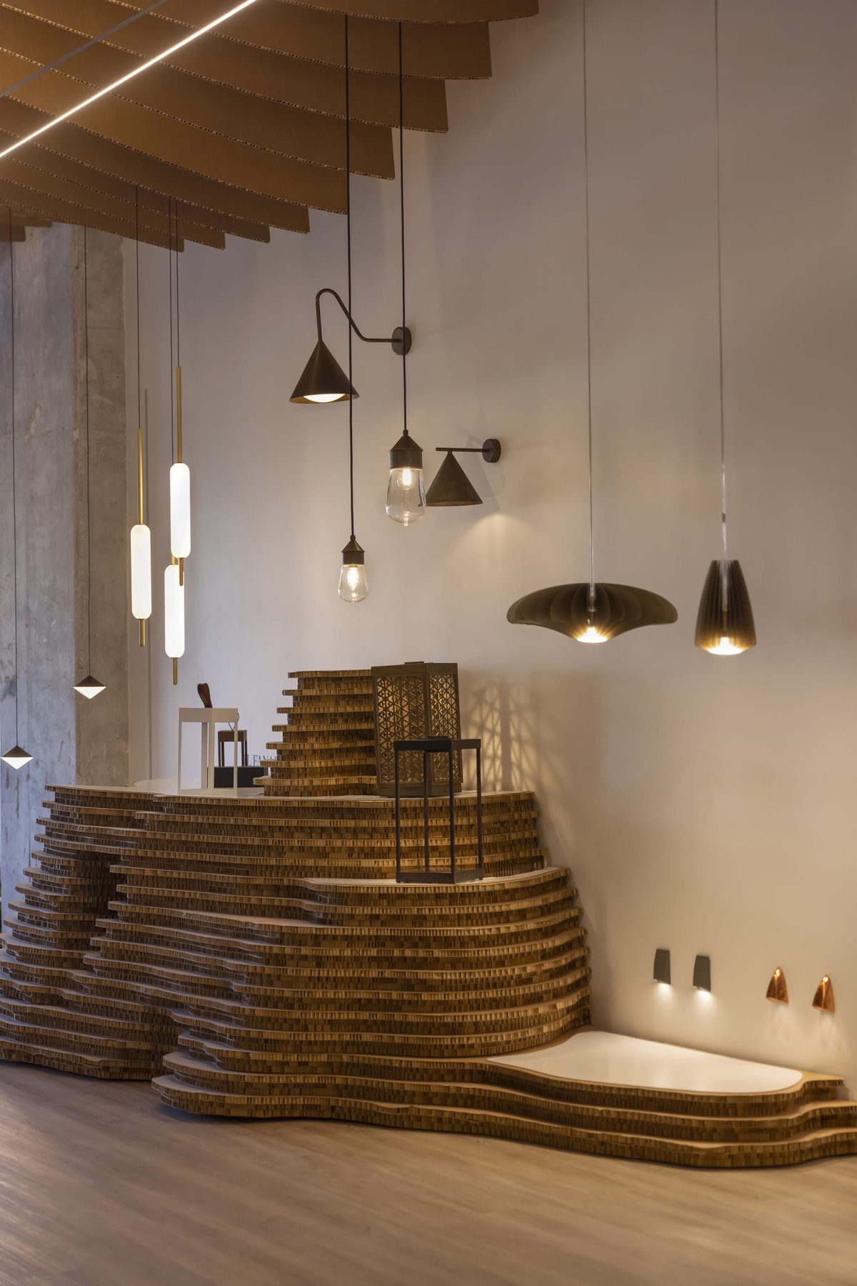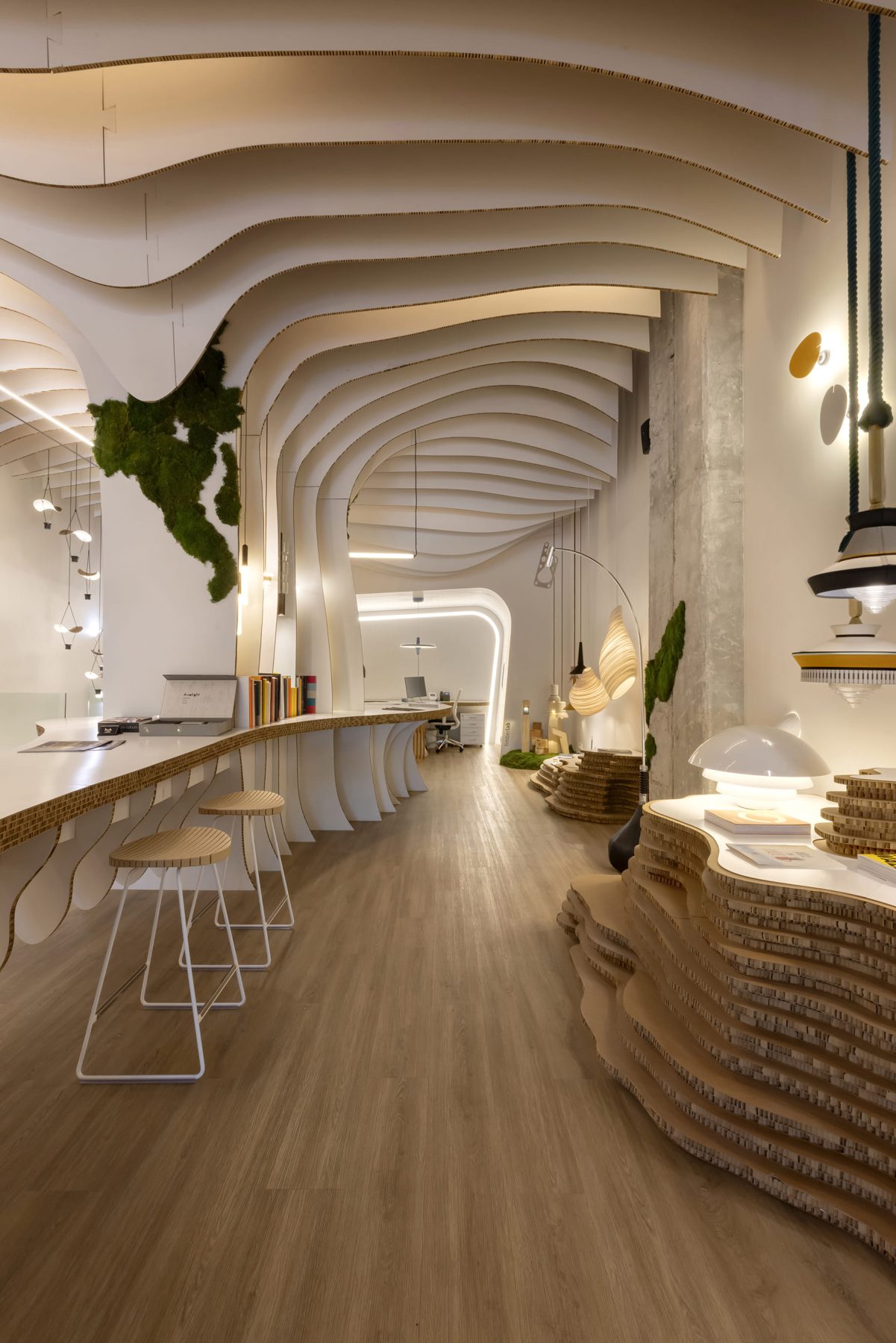 Από την οροφή, οι φωτεινές δέσμες διαπερνούν τα διάκενα ανάμεσα στις κυματοειδείς επιφάνειες, ανακαλώντας την αίσθηση του φωτός που φιλτράρεται μέσα από τη φυλλωσιά ενός δάσους.