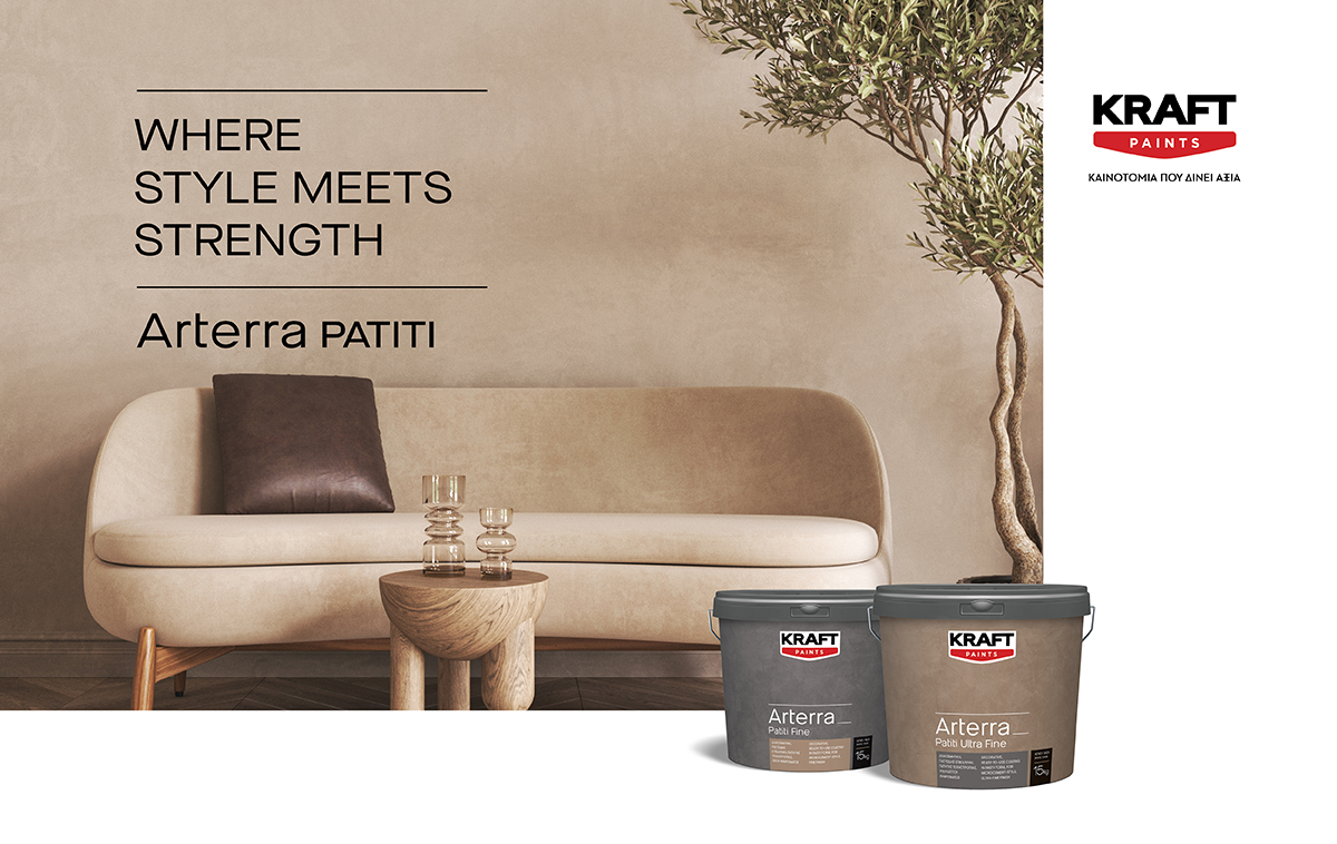 Η KRAFT Paints παρουσιάζει την οικογένεια προϊόντων πατητής τσιμεντοκονίας Arterra Patiti, ένα διακοσμητικό υλικό που χρησιμοποιείται από την αρχαιότητα μέχρι σήμερα , έχοντας την ικανότητα να ανανεώνει το σπίτι ή τον επαγγελματικό χώρο με τον πλέον σύγχρονο και βιώσιμο τρόπο. Η Arterra Patiti μπορεί να εφαρμοστεί σε εσωτερικούς και εξωτερικούς χώρους -τόσο σε κάθετες όσο και σε οριζόντιες επιφάνειες-, δηλαδή σε τοίχους, οροφές, δάπεδα, σκάλες, βεράντες, πάγκους, μπάνια, μπαρ, ενώ είναι ιδανική και για μια μπανιέρα, έναν νιπτήρα, έναν νεροχύτη, ένα τζάκι και άλλες χτιστές οικιακές υποδομές. Επιπλέον, διατίθεται σε λευκό, γκρι και άλλες 40 έτοιμες αποχρώσεις, ακολουθώντας τις τελευταίες τάσεις της αρχιτεκτονικής.
