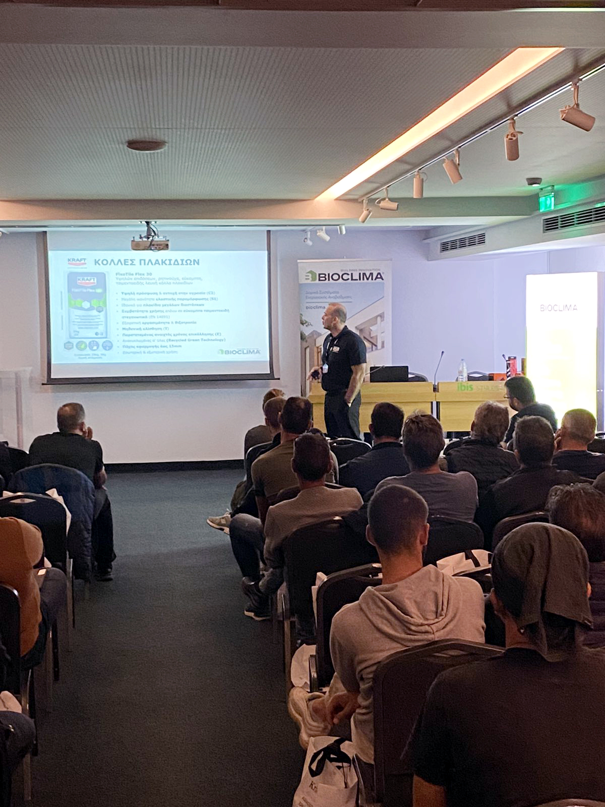 Οι ομιλητές, στελέχη της εταιρείας, αναφέρθηκαν στις εξελιγμένες προϊοντικές κατηγορίες, όπως επισκευαστικά κονιαμάτα για επιφάνειες σκυροδέματος και σοβά και τα Πιστοποιημένα Δομικά Συστήματα Ενεργειακής Αναβάθμισης BIOCLIMA®, τα οποία είναι πλήρως εναρμονισμένα με όλους τους σύγχρονους Ευρωπαϊκούς και Εθνικούς Κανονισμούς, για τη θερμομόνωση και πυροπροστασία των κτιριακών κατασκευών. Κατά τη διάρκεια του σεμιναρίου έγινε ζωντανή παρουσίαση εφαρμογής υλικών θερμομόνωσης από ειδικό εφαρμοστή της Bioclima, καθώς και ενημέρωση για την προϊοντική σειρά κονιαμάτων της KRAFT Paints, παράλληλα με το θεωρητικό μέρος της παρουσίασης και δόθηκαν δώρα στους συμμετέχοντες.