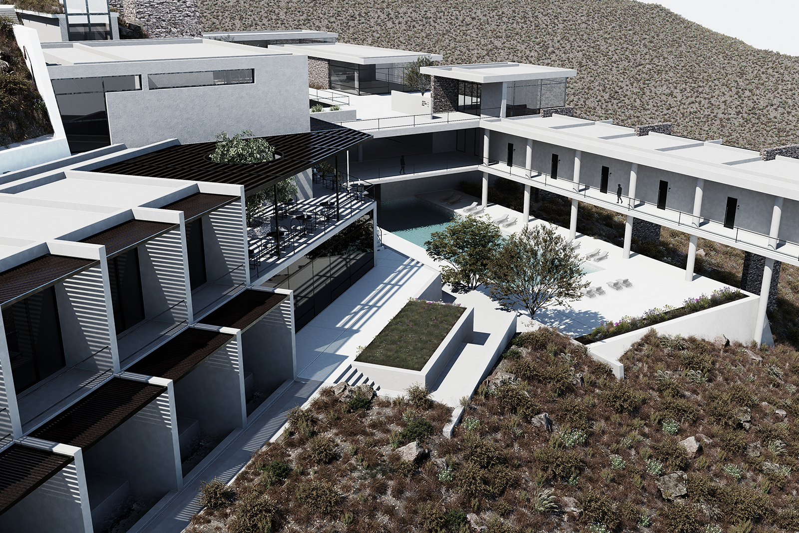 Due to the area’s topography, the proposal is developed across four levels. The first level features the complex’s reception area, which visitors access from the parking located slightly higher up. From there, they can proceed via the staircase to the lower levels, where the remaining facilities are located.