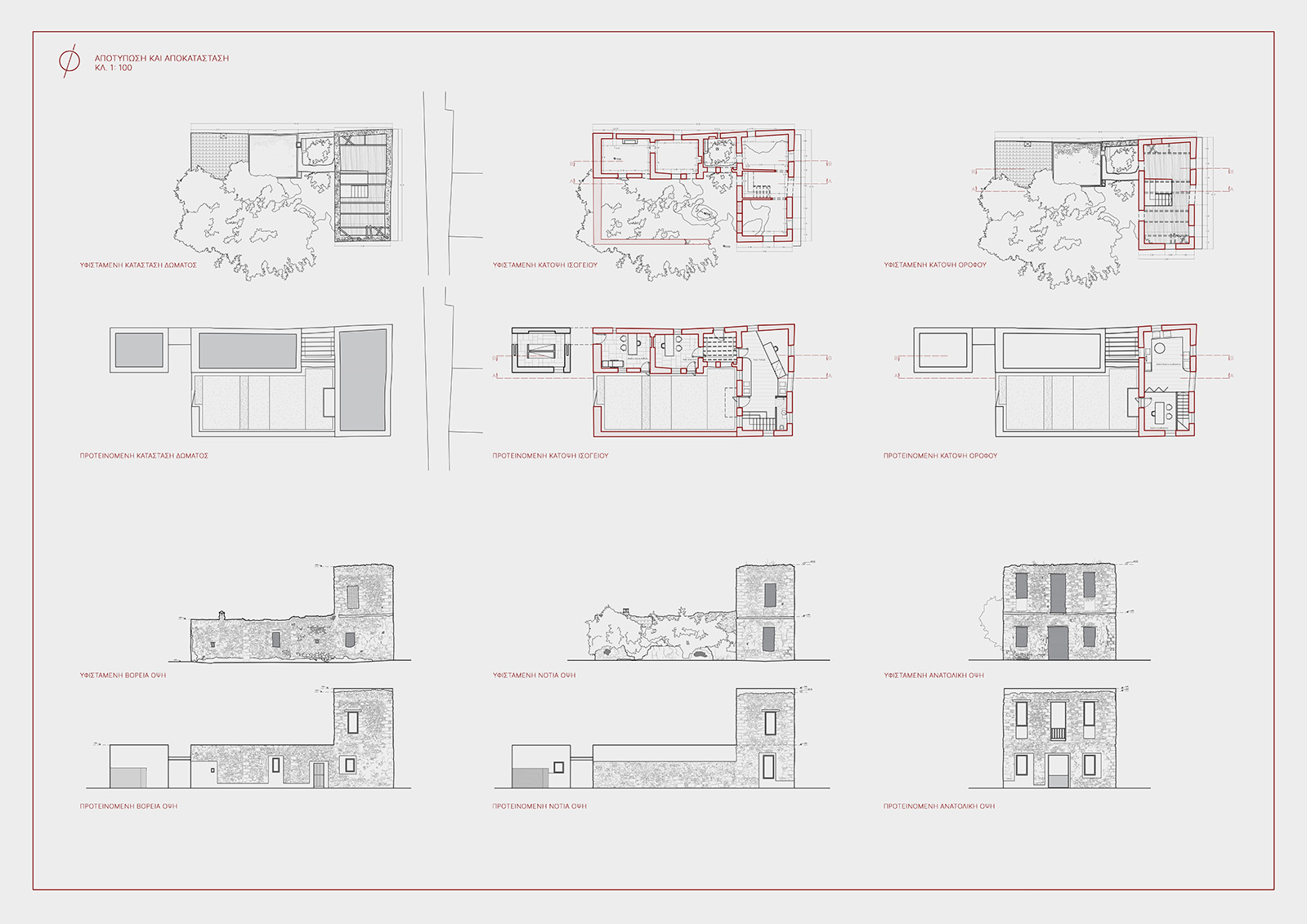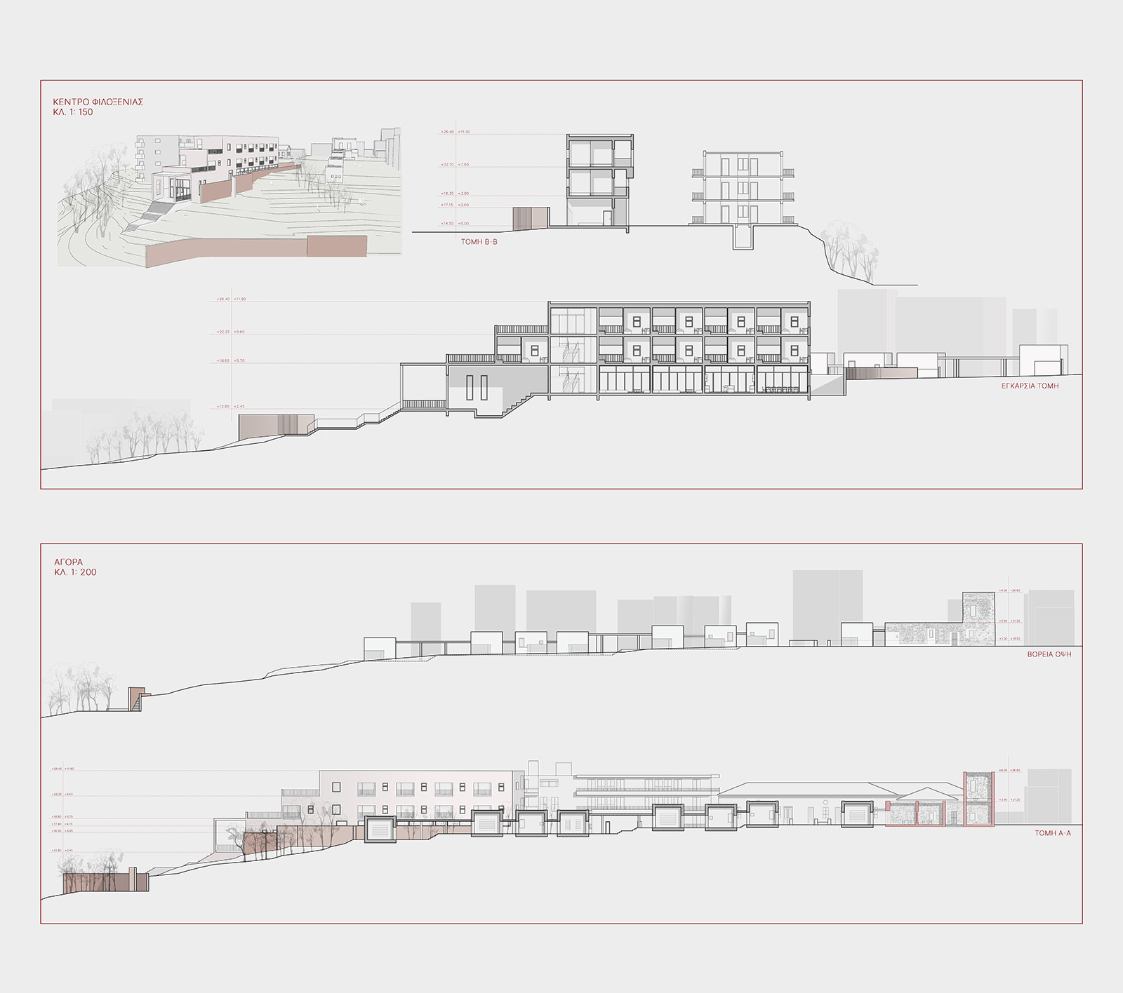 Στο πλαίσιο αυτού του φιλόξενου και ασφαλούς περιβάλλοντος, προτείνεται η ανέγερση μικρών κτηρίων αγοράς κατά άξονα του παλιού κτηρίου, προκειμένου να προωθηθεί η κοινωνική ένταξη και η αυτονομία των γυναικών. Το ερείπιο αποτέλεσε την συνθετική αφετηρία του σχεδιασμού με την αποκατάσταση του να είναι από τα πρώτα βήματα. Η είσοδος, γίνεται μέσω ενός αίθριου, θυμίζοντας τις εισόδους σε παραδοσιακούς οικισμούς. Όσον αφορά την αποκατάσταση του πέτρινου κελύφους, δόθηκε προσοχή στην διατήρηση και την ενίσχυση της λιθοδομής, με την προσθήκη επιχρισμάτων στα πιο ευπαθή σημεία, που παρατηρούνται κυρίως στα ανοίγματα. Γενικότερα, οι επεμβάσεις, τόσο στο κέλυφος όσο και στους χώρους που διαμορφώθηκαν εντάσσονται στην υπάρχουσα δομή χωρίς να αλλοιώνουν την πρότερη εικόνα του κτίσματος. Το κέντρο φιλοξενίας διαμορφώνεται ως ένας επιμήκης συμπαγής όγκος κατά μήκους του δημόσιου χώρου που γίνεται προσβάσιμος μέσω του εξωτερικού διαδρόμου. Στο ισόγειο του κέντρου λειτουργούν χώροι για κοινωνικές δραστηριότητες και εκδηλώσεις που στοχεύουν στην ενίσχυση της κοινότητας και την προώθηση της αλληλεπίδρασης μεταξύ των γυναικών. Επιπλέον, προβλέπεται η διεξαγωγή εκπαιδευτικών προγραμμάτων που στοχεύουν στην ενδυνάμωση και εκπαίδευση τους.