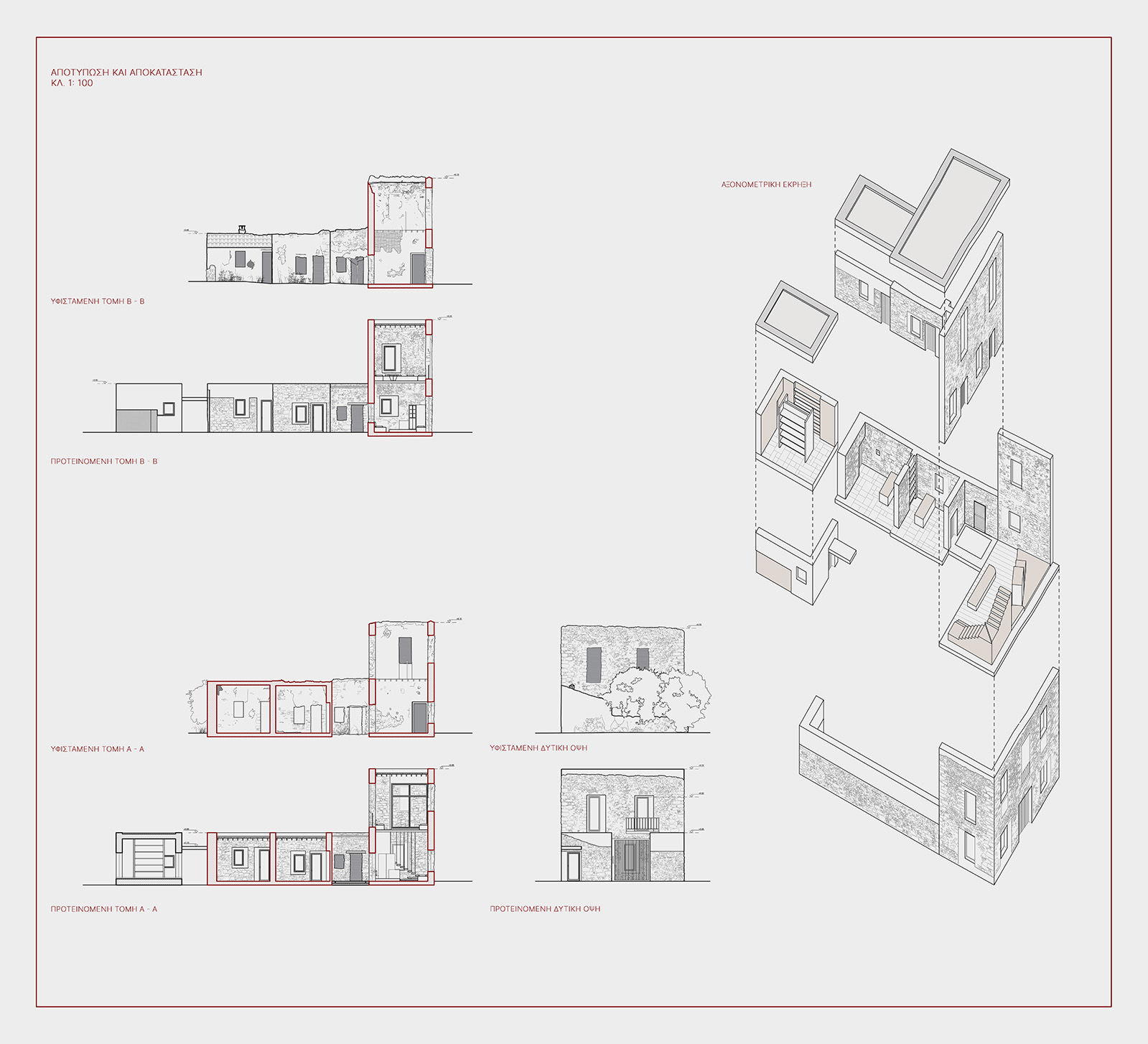 The choice of this theme stems from the growing need to support women who have experienced abuse. In Greece, rates of abuse against women are alarmingly high, as evidenced by a 2021 study from the Hellenic Mediterranean University, which found that 42% of women in Crete have suffered some form of abuse. These statistics demonstrate the urgent need for a center that offers safety, support, and recovery for these individuals. The restored building serves as the entry point to this journey, functioning as a reception area to welcome and guide women. It also operates as a shelter, providing accommodation and shared facilities such as a kitchen, living room, dining area, and social activity space.