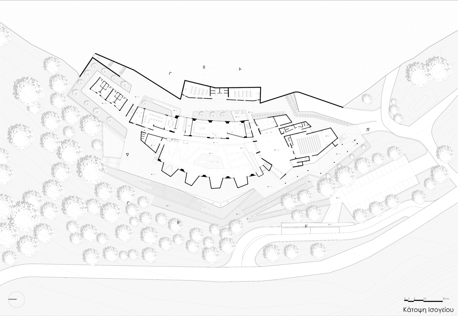 Όλες οι δευτερεύουσες χρήσεις οργανώνονται γραμμικά σε μια λωρίδα που έρχεται και “αγκαλιάζει”, από την ανατολή, τον πυρήνα αυτό. Επιδιώχθηκε στη συνέχεια το σύστημα αυτό να ενταχθεί ομαλά στο φυσικό τοπίο και να φωλιάσει εντός της χλωρίδας του λόφου.