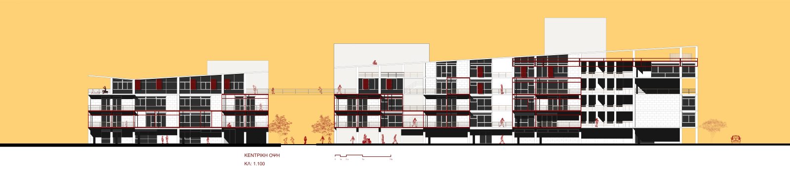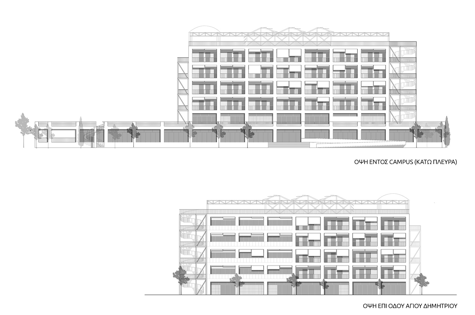 Αντί να αντιμετωπίζει την κατοίκηση ως ένα καθαρά λειτουργικό κέλυφος, η πρόταση συγκροτεί μια πολυεπίπεδη κοινωνική υποδομή όπου οι καθημερινές πρακτικές —μελέτη, μαγείρεμα, συνάντηση και αναψυχή— αλληλοδιαπλέκονται χωρικά. Οι χαμηλότερες στάθμες φιλοξενούν δημόσιες και ημι-δημόσιες χρήσεις, προσβάσιμες σε ολόκληρη την πανεπιστημιακή κοινότητα, συγκροτώντας έναν κοινωνικό κόμβο με αναγνωστήρια, εργαστήρια, βιβλιοθήκη και πολιτιστικούς χώρους. Με αυτόν τον τρόπο, το κτίριο λειτουργεί ως πορώδης διεπιφάνεια ανάμεσα στη ζωή του πανεπιστημίου και τη συλλογική κατοίκηση.