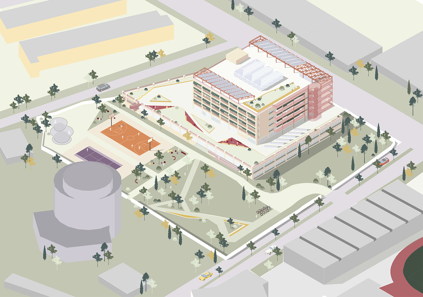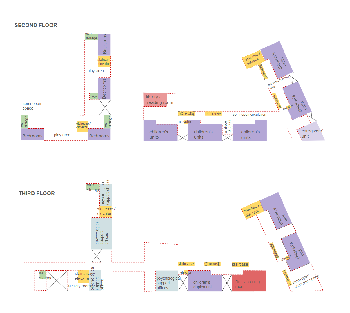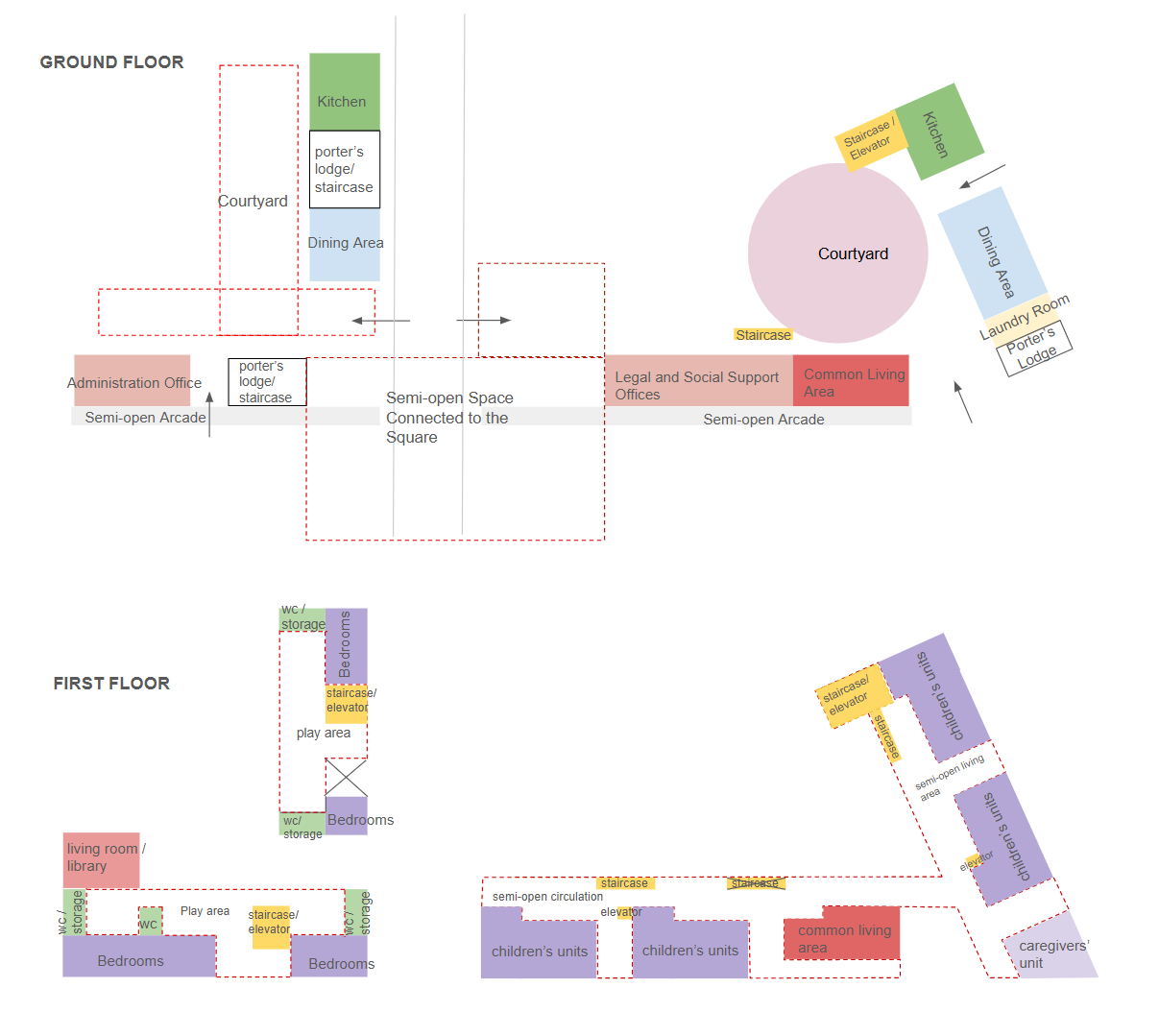 At its core lies a center for the accommodation and protection of unaccompanied minors, organized according to age-specific spatial typologies that reflect different rhythms of growth, autonomy, and socialization. For younger children, rooms are directly linked to play areas, reinforcing supervision and proximity, while for adolescents, “small house” clusters and semi-open communal spaces foster independence within a supportive framework. Psychological, social, and educational functions are deliberately integrated into everyday living spaces, normalizing care and reducing institutional stigma.