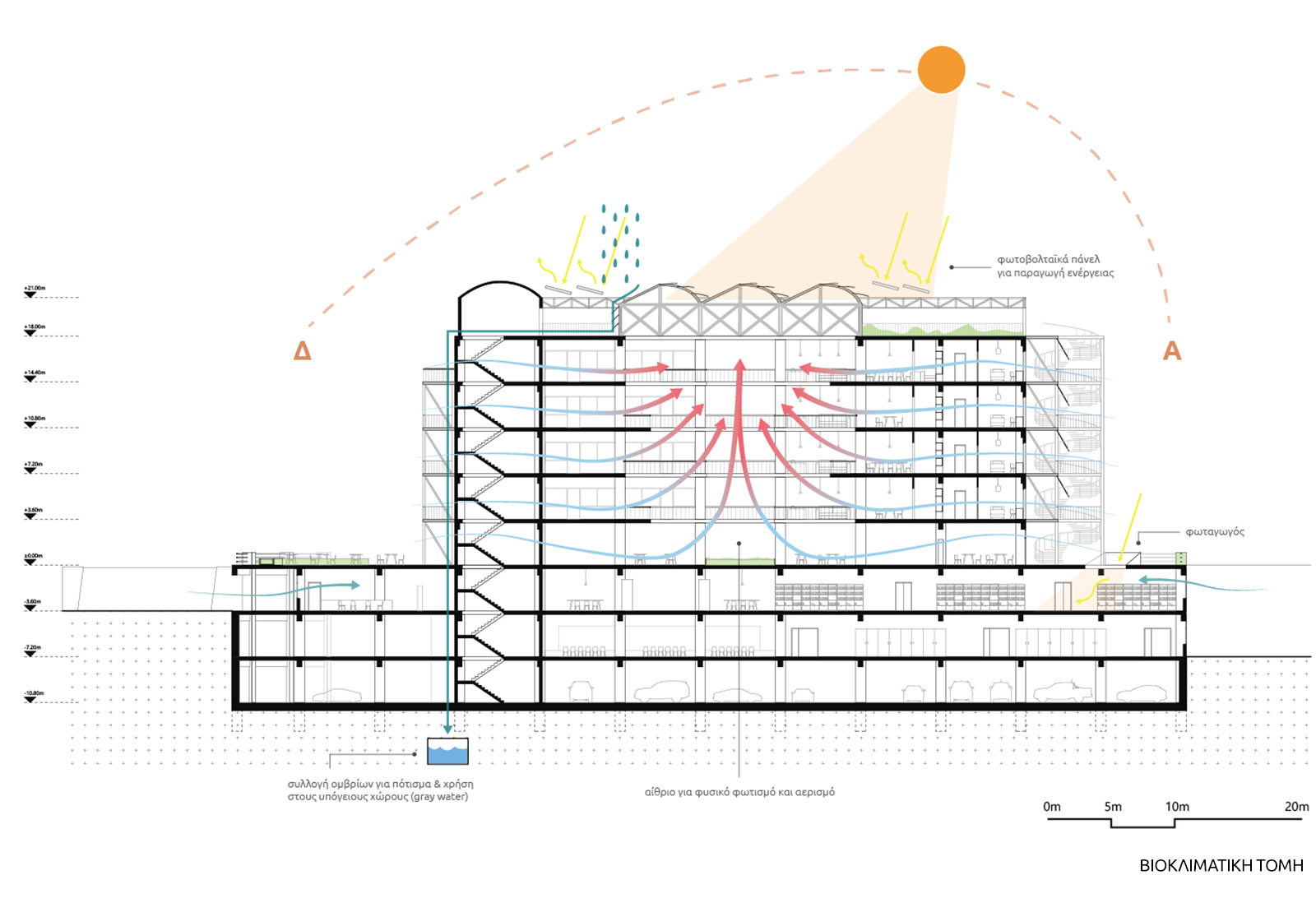 Οι όροφοι κατοικίας οργανώνονται γύρω από ένα κεντρικό αίθριο, το οποίο λειτουργεί ταυτόχρονα ως βιοκλιματικός ρυθμιστής και ως κατακόρυφος κοινωνικός πυρήνας, ενισχύοντας τη συνύπαρξη και τη οπτική διασύνδεση. Κοινόχρηστες κουζίνες, καθιστικά και εξώστες ενθαρρύνουν τις συλλογικές ρουτίνες, ενώ οι προσβάσιμες μονάδες και οι ευέλικτες διατάξεις ανταποκρίνονται σε διαφορετικά πρότυπα διαβίωσης. Ο κήπος στην οροφή, οι αθλητικοί χώροι και οι υπαίθριες επιφάνειες επεκτείνουν την κατοίκηση σε παραγωγικά και ψυχαγωγικά τοπία.