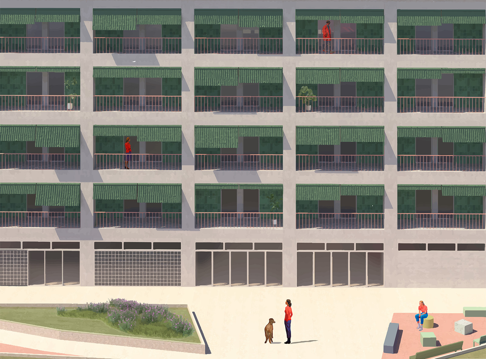 The square operates as a shared social field, reorganizing movement flows and introducing spaces for pause, play, and greenery, while pedestrianized edges and open arcades mediate between private and public life. Facades, grids, and shaded platforms become interfaces of interaction, articulating a spatial language that situates protection, community, and belonging within the lived fabric of the neighborhood.