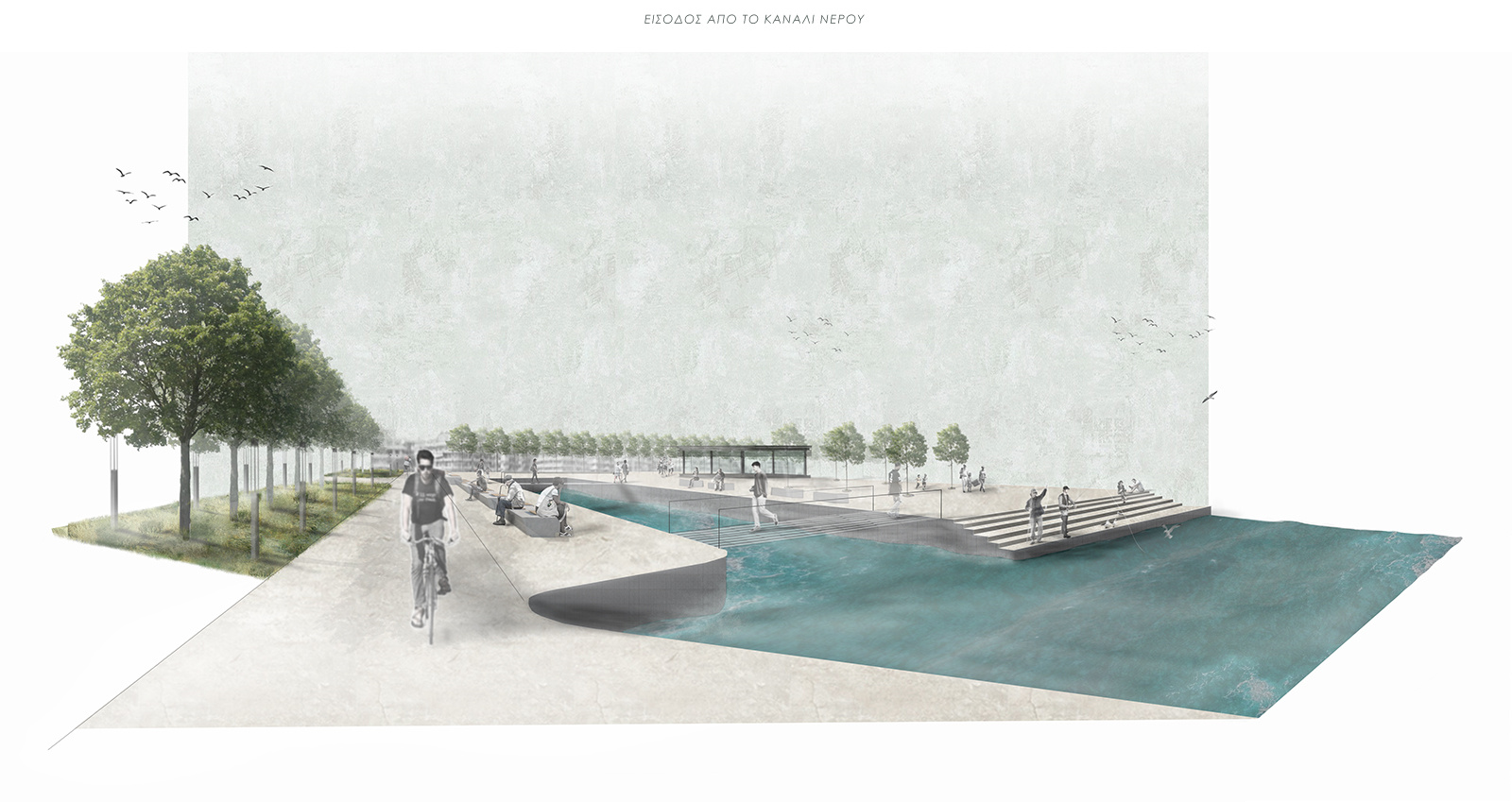 A new public space will be created where people can gather and engage in activities, in a new city park, which will be and will re-integrate the inactive vacant lot into the urban fabric, through design gestures such as a bike lane, a waterfront walk and sitting area, promenade alleys with diverse vegetation, an event open space with a kiosk, public cultivation gardens, playgrounds, and the addition of a boat stop where people can board the vessels of the existing water transport in the bay of Thermaikos.