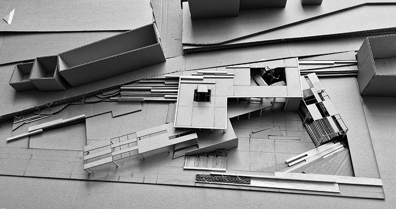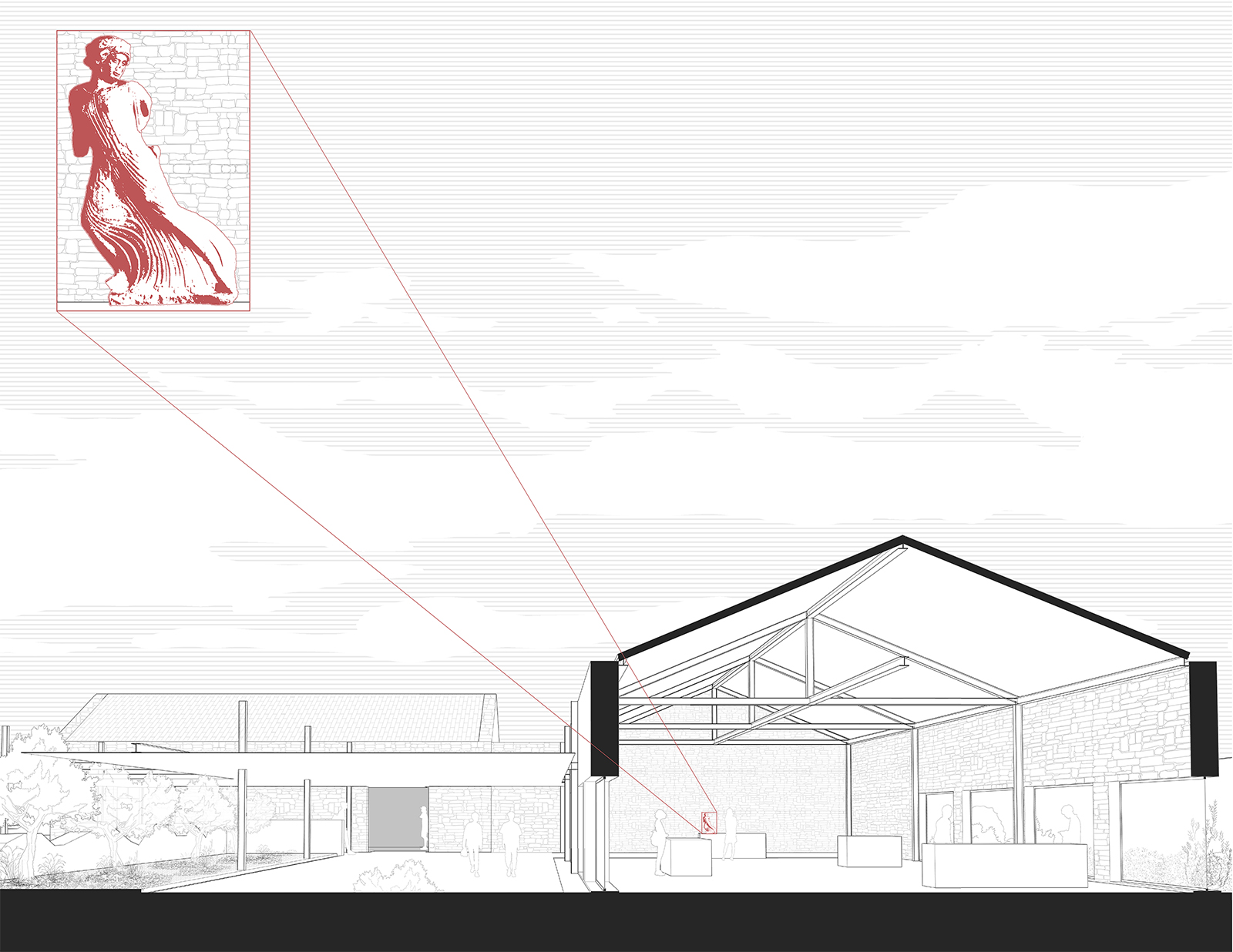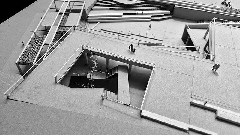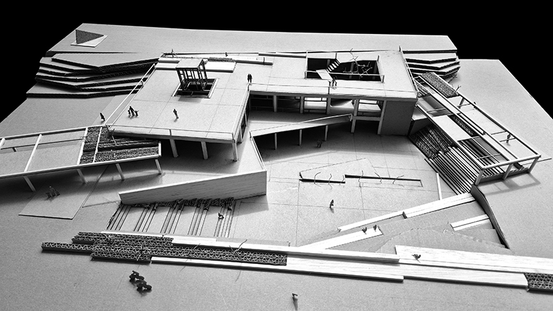 Similarly, this material is used for the canopies at the entrances. For vertical connections, stairs and bridges are added. This vocabulary is not limited to the museum spaces but also appears in the exterior areas, serving as resting points, defined by the traces of the demolished buildings.
