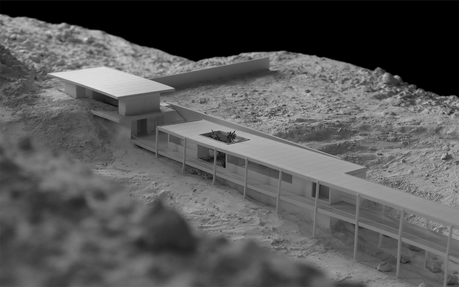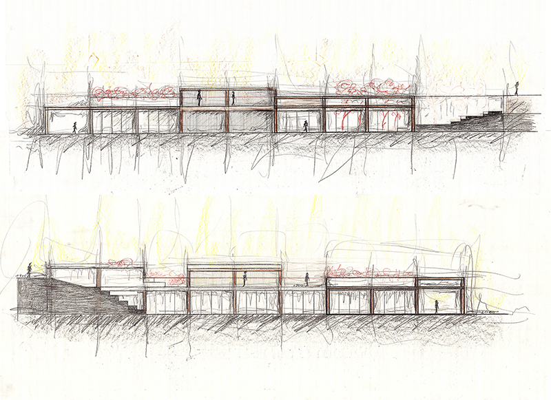 The Museum as an Experience, where the starting point is the landscape. the concept of research is introduced through a composite structure that addresses the quarry. Mostly made of metal, it conveys a sense of lightness with thinner profiles and larger openings. The research center maintains a clear and simple form so as not to overshadow the imposing quarry. Positioned lower, it allows for an unobstructed view of the setting sun. Its elongated proportion aligns with the quarry’s horizontal dimension while contrasting with its verticality, reinforcing their dialogue.