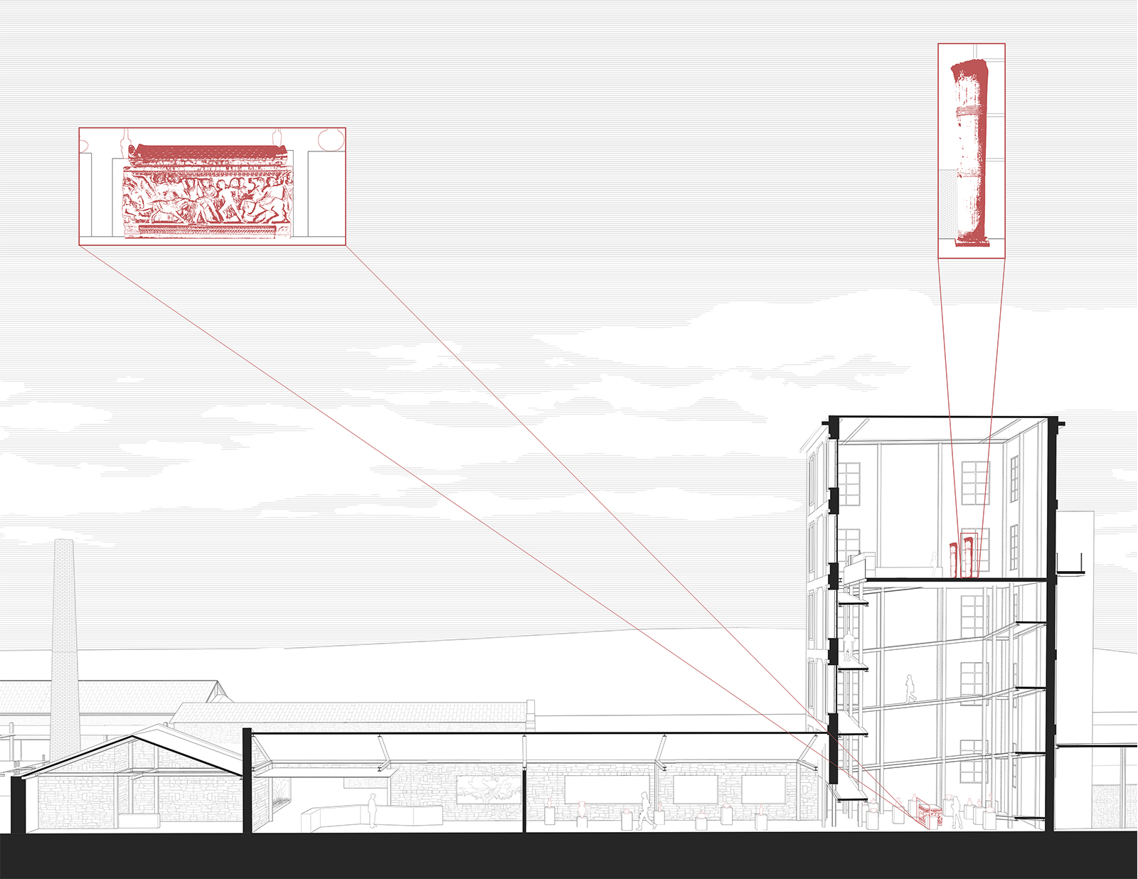 In their design thesis project, students Drakos Michail & Stampouli Elisavet, develop an architectural proposal for the design and the curation of a museum space in the city of Eleusis that aims to narrate the stories of the city by blending antiquity and the industrialization era, as the most defining periods of its history.