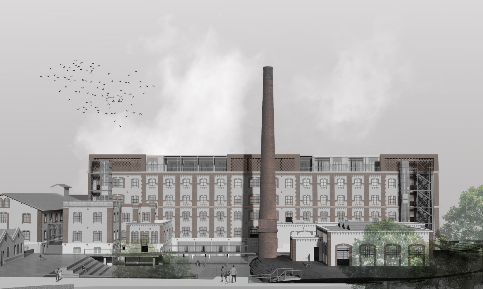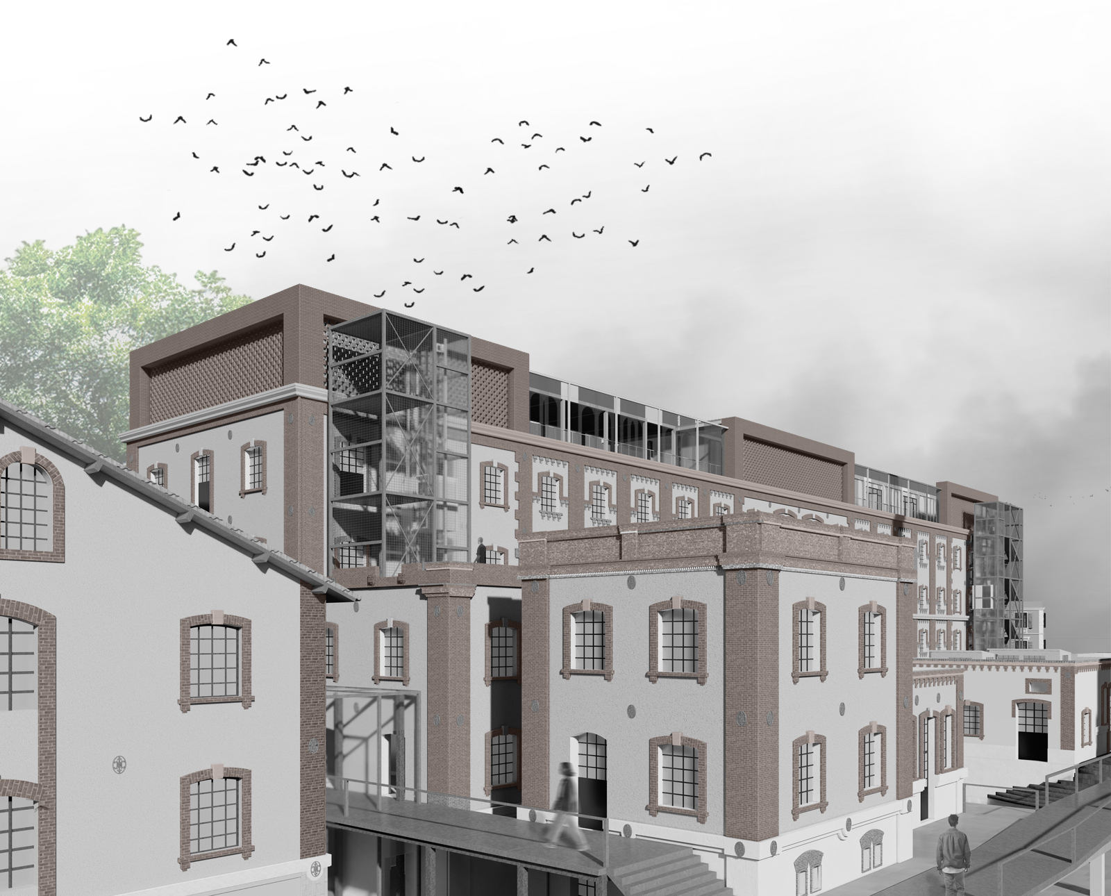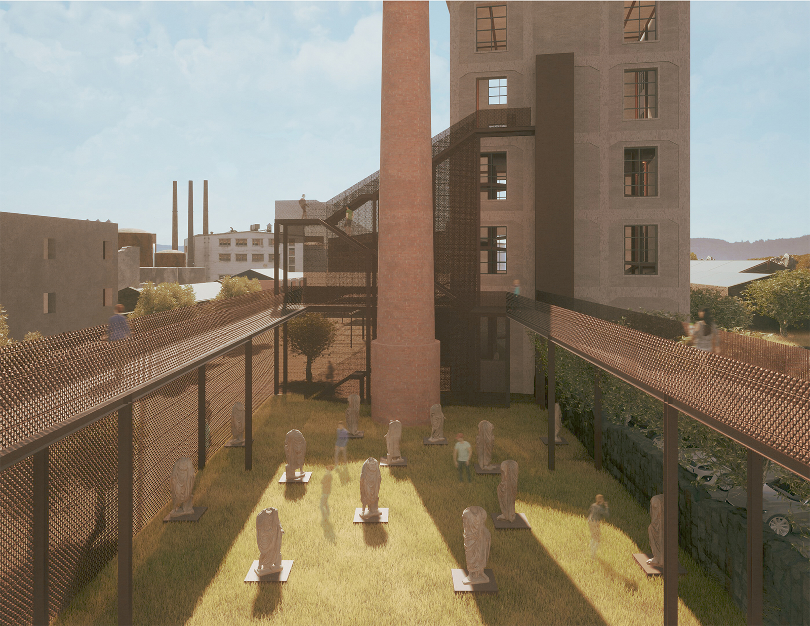 As a starting point, the decision is made to preserve the shells of the buildings that have withstood the passage of time, while keeping the traces of the demolished ones, reminding us of the industrial past.